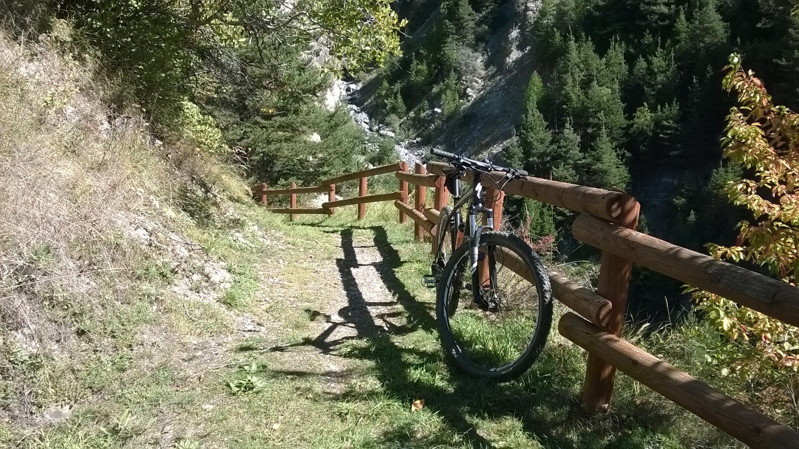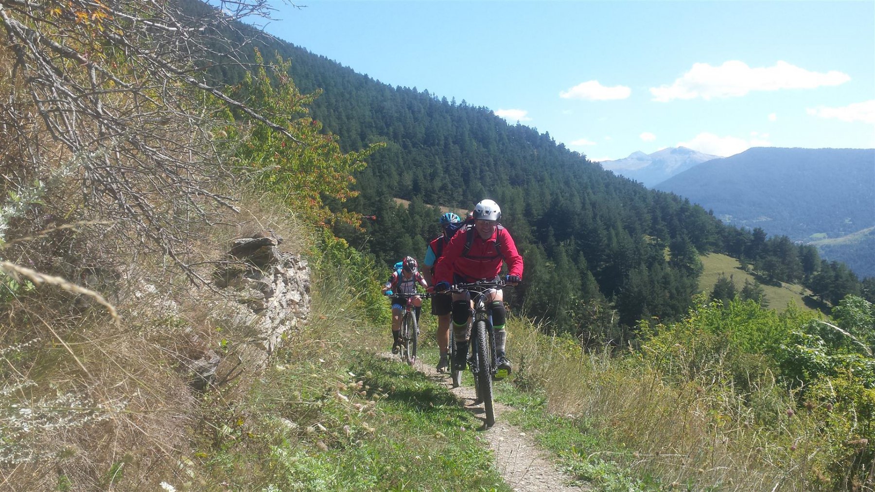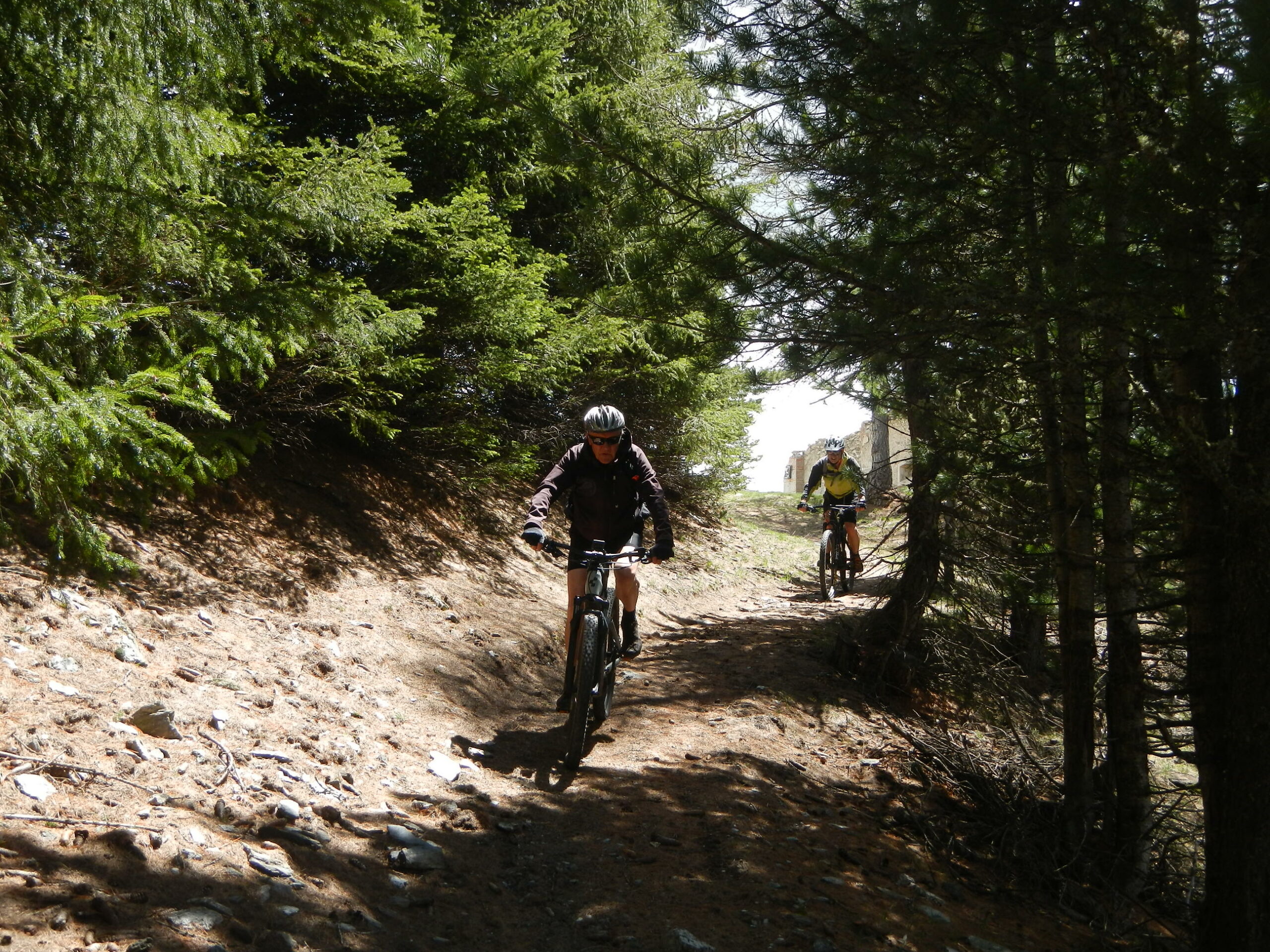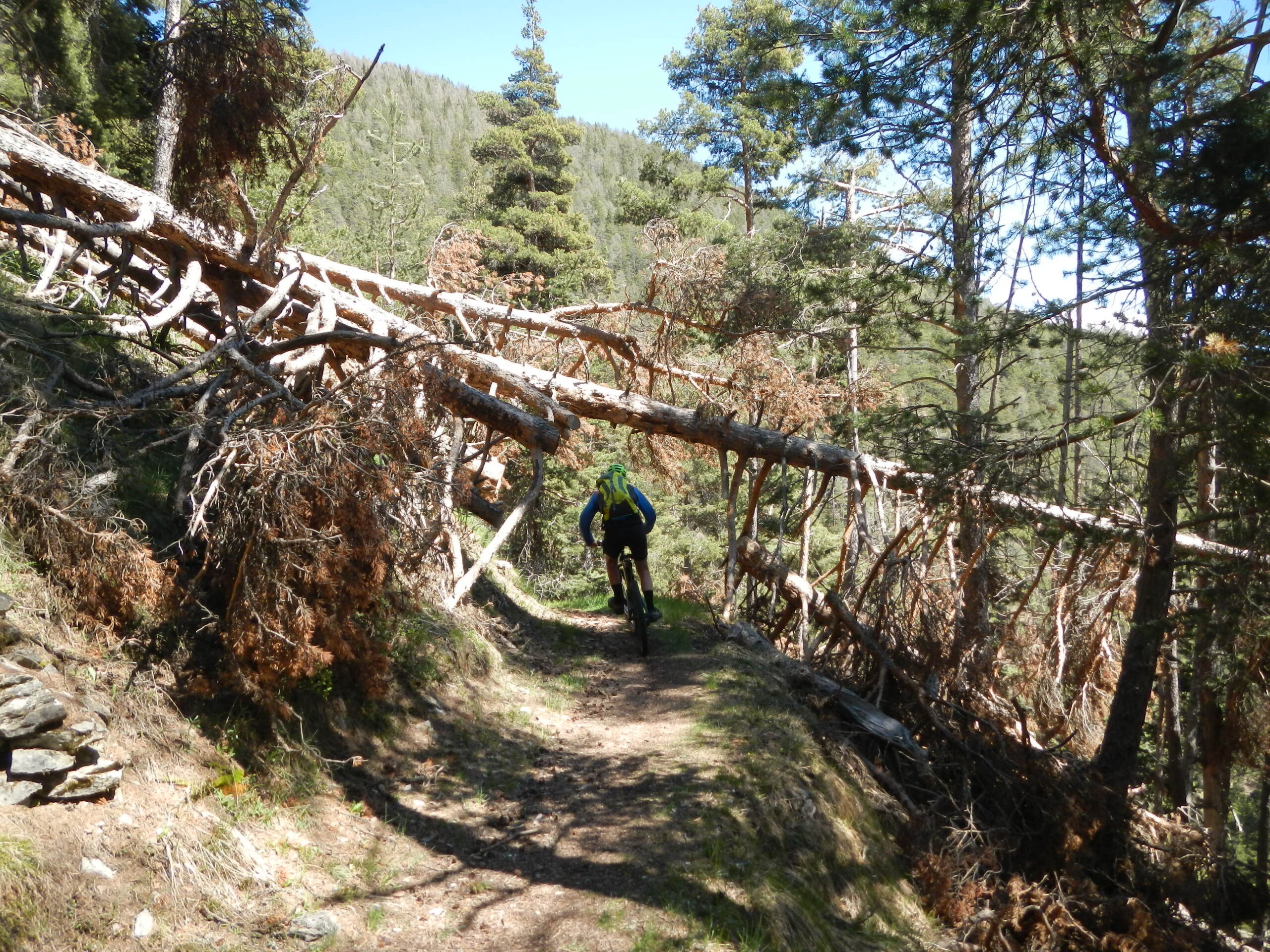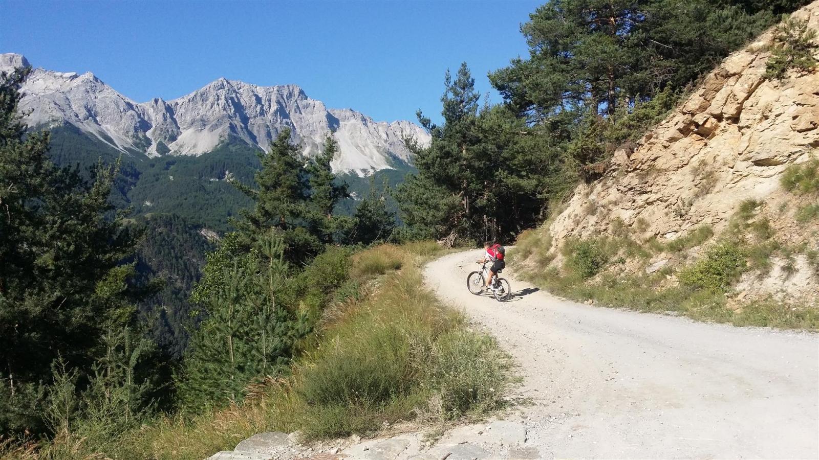 Proprio di fianco all’ingresso del forte prendere sulla sinistra il sentiero indicazioni Millaures / Suppas, sempre molto evidente e ben segnalato (sono presenti anche cartelli indicatori MTB della Federazione Francese). La discesa si svolge quasi interamente in uno splendido bosco di conifere, il sentiero è bellissimo e interamente ciclabile, presentando solo pochissimi e brevi passaggi più impegnativi per fondo e pendenza.