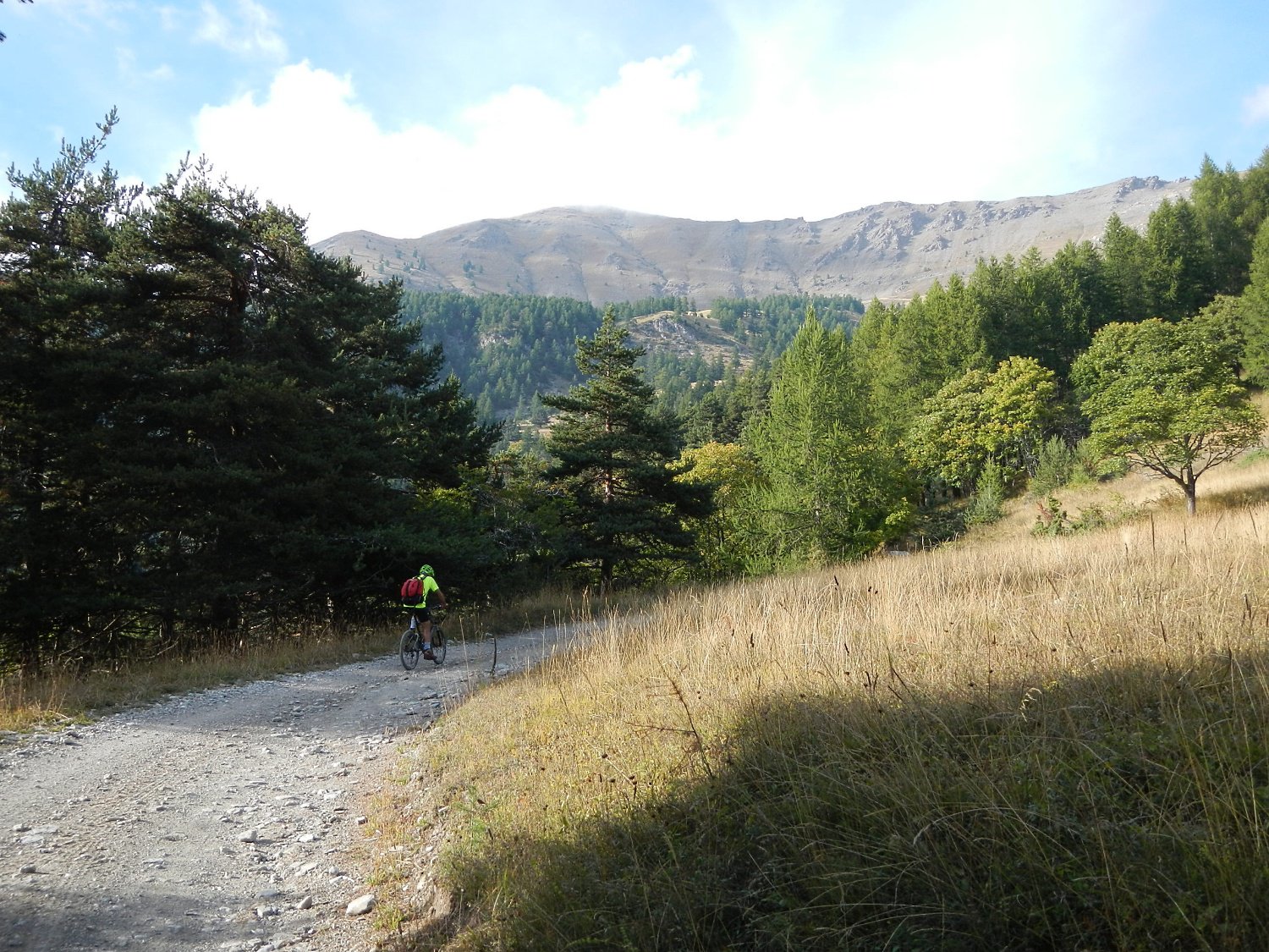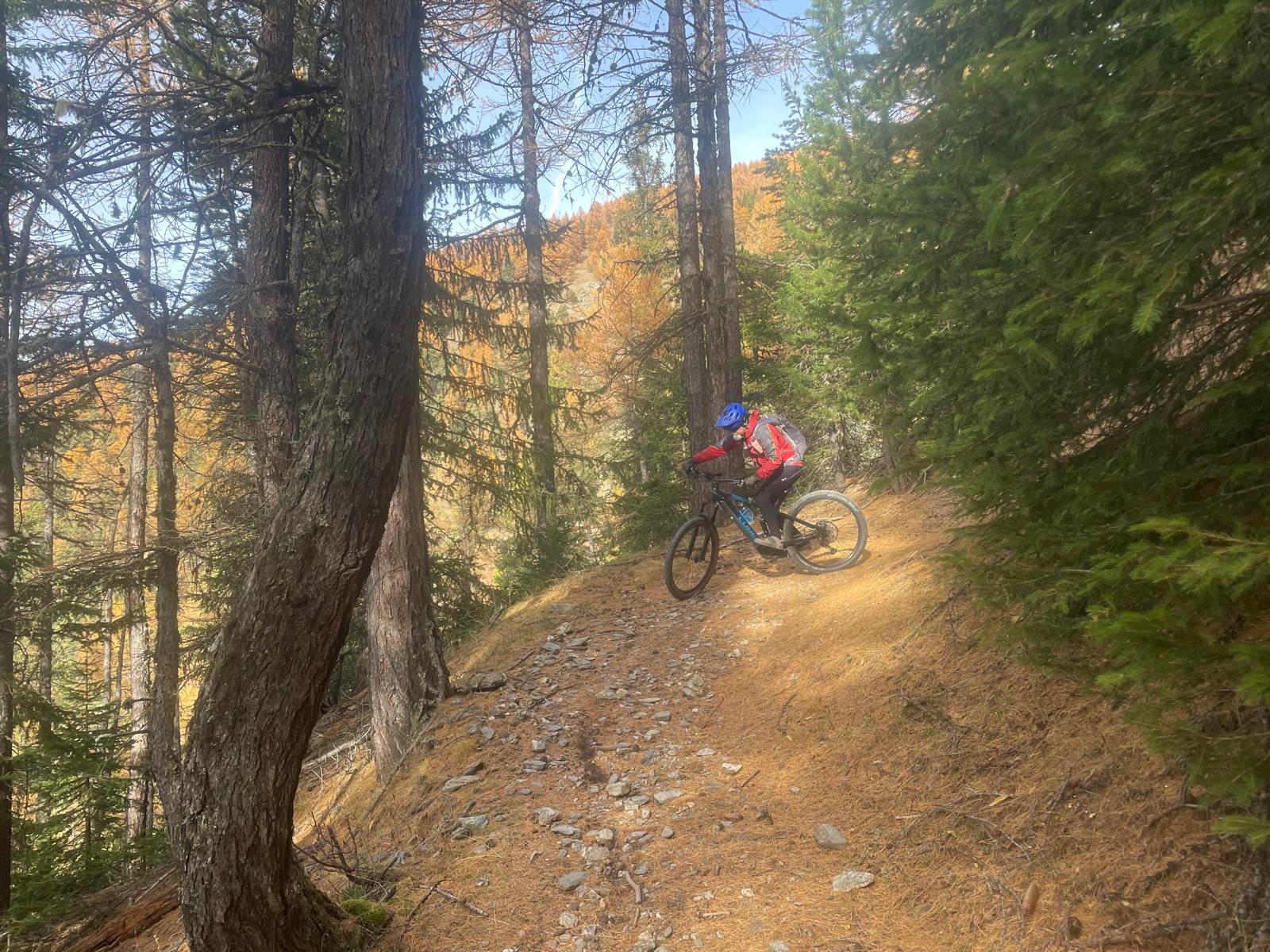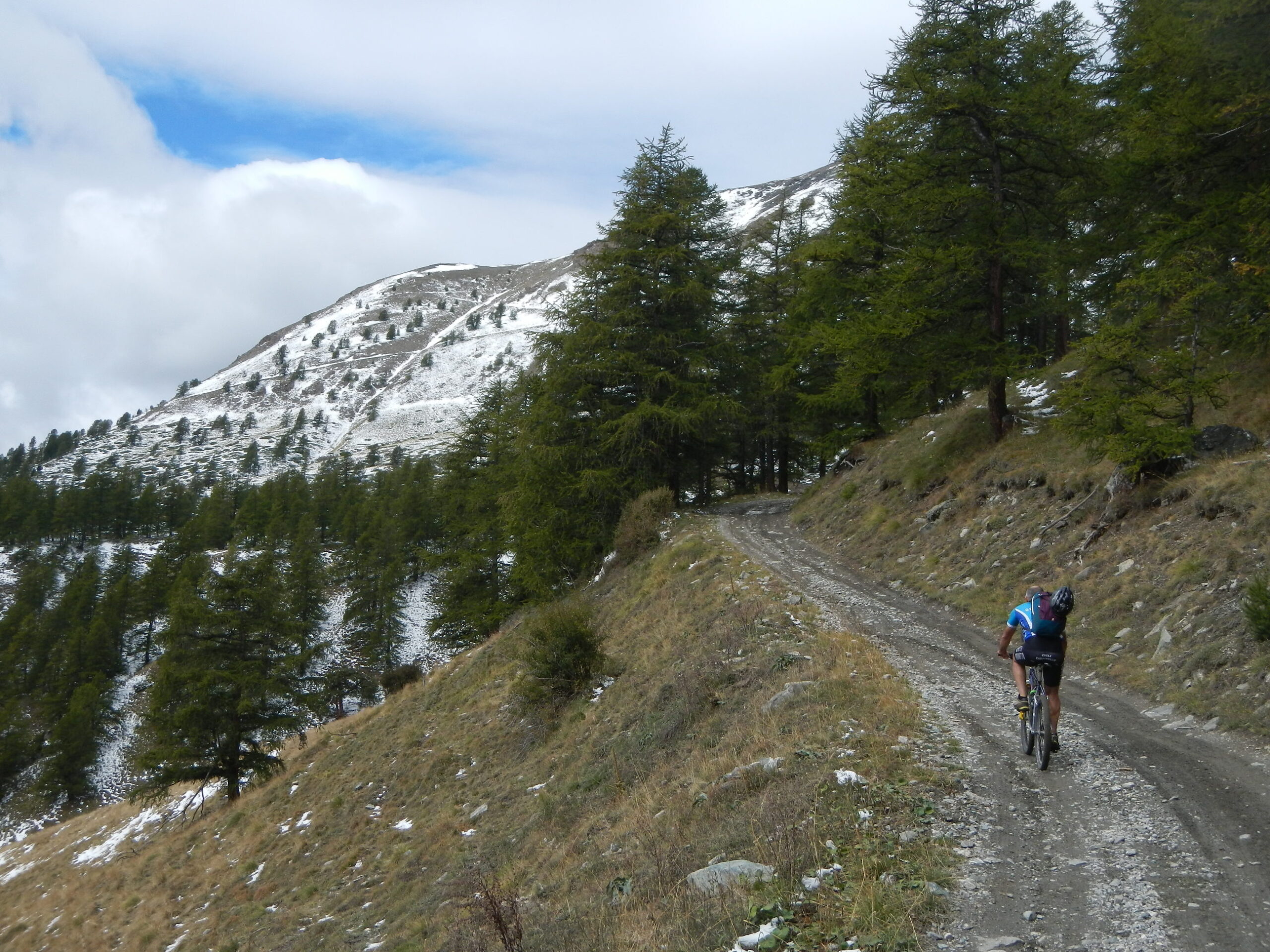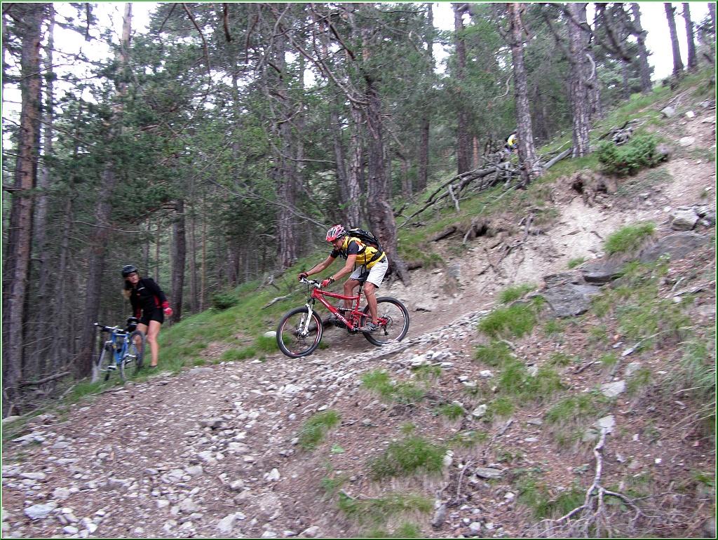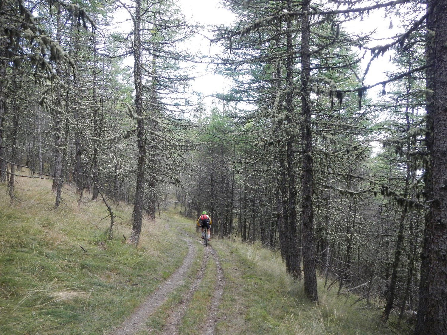 Proprio di fianco all’ingresso del forte prendere sulla sinistra il sentiero indicazioni Millaures / Suppas, sempre molto evidente e ben segnalato (sono presenti anche cartelli indicatori MTB della Federazione Francese). La discesa si svolge quasi interamente in uno splendido bosco di conifere, il sentiero è bellissimo e interamente ciclabile, presentando solo pochissimi e brevi passaggi più impegnativi per fondo e pendenza.