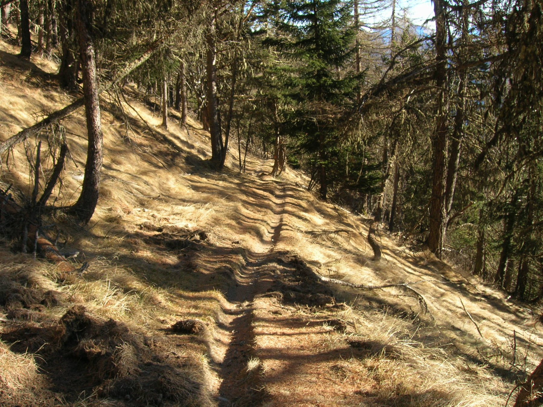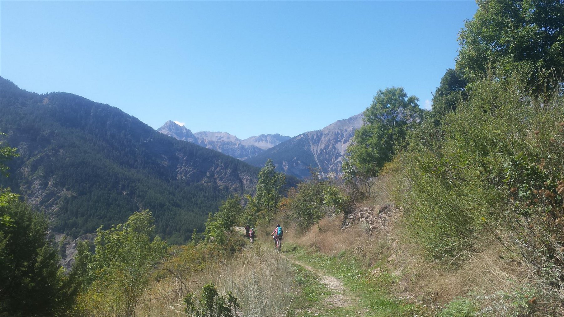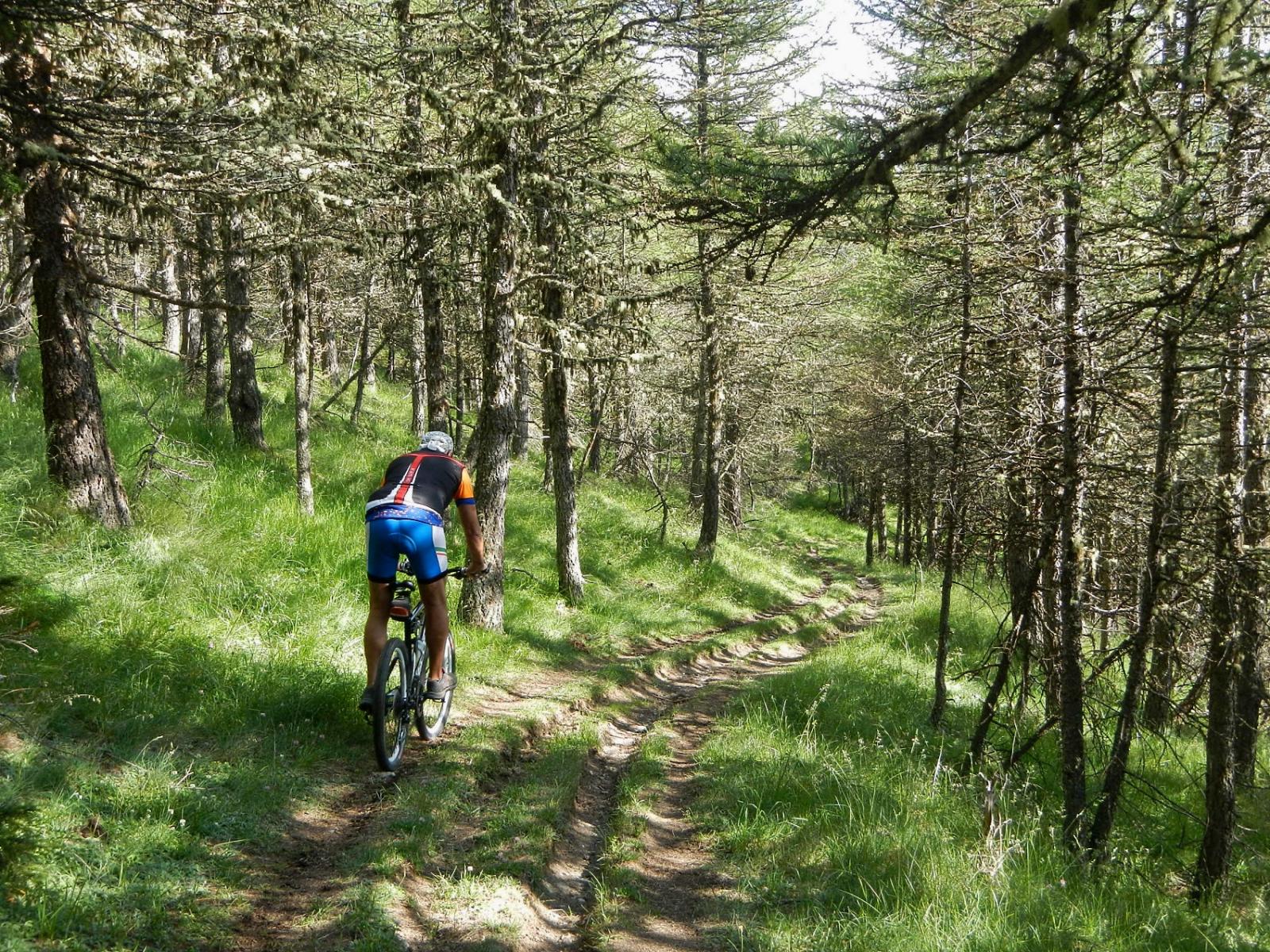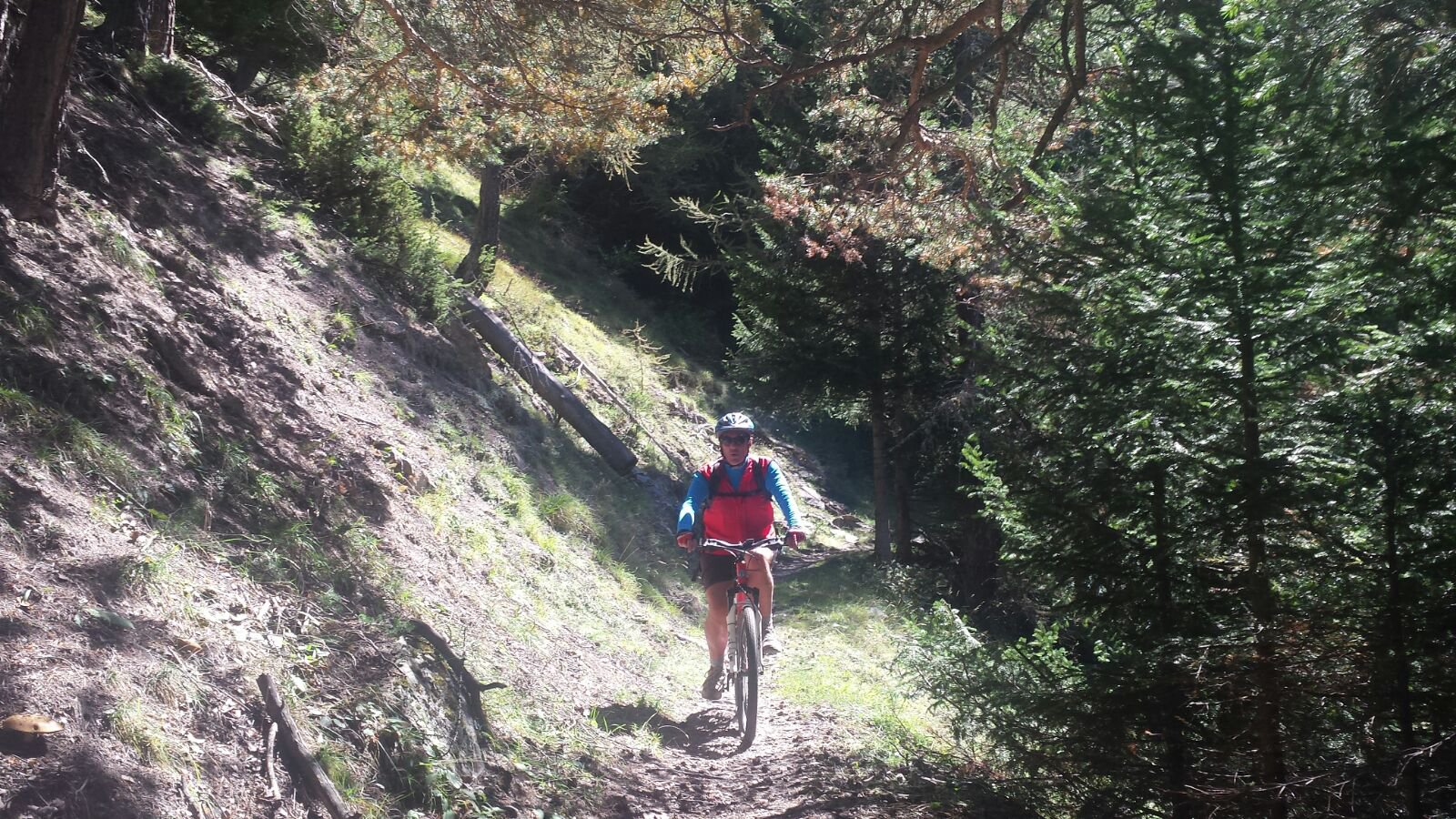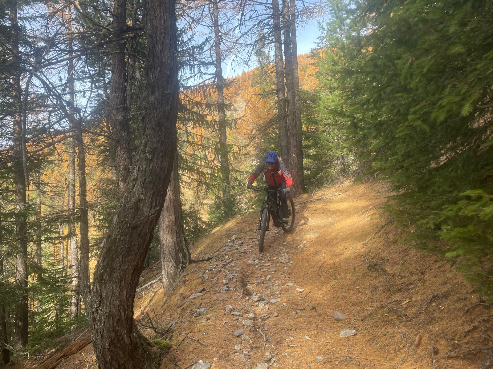 Proprio di fianco all’ingresso del forte prendere sulla sinistra il sentiero indicazioni Millaures / Suppas, sempre molto evidente e ben segnalato (sono presenti anche cartelli indicatori MTB della Federazione Francese). La discesa si svolge quasi interamente in uno splendido bosco di conifere, il sentiero è bellissimo e interamente ciclabile, presentando solo pochissimi e brevi passaggi più impegnativi per fondo e pendenza.
