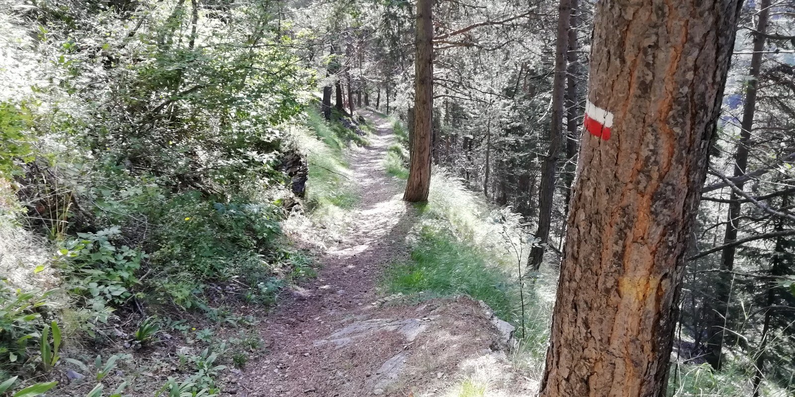 Dopo circa 1 Km di discesa, in corrispondenza di un tornante a destra, trascurare un sentiero meno pronunciato e raggiungere il rio Perilleux. Senza attraversarlo si svolta a sinistra. Ad un nuovo bivio appena dopo un ponticello di legno si continua a destra, imboccando il sentiero che per qualche metro scende piuttosto ripido ed è anche parecchio scivoloso. Si arriva alla radura nella pineta che ospita le Gr. Suppas (17 km circa).