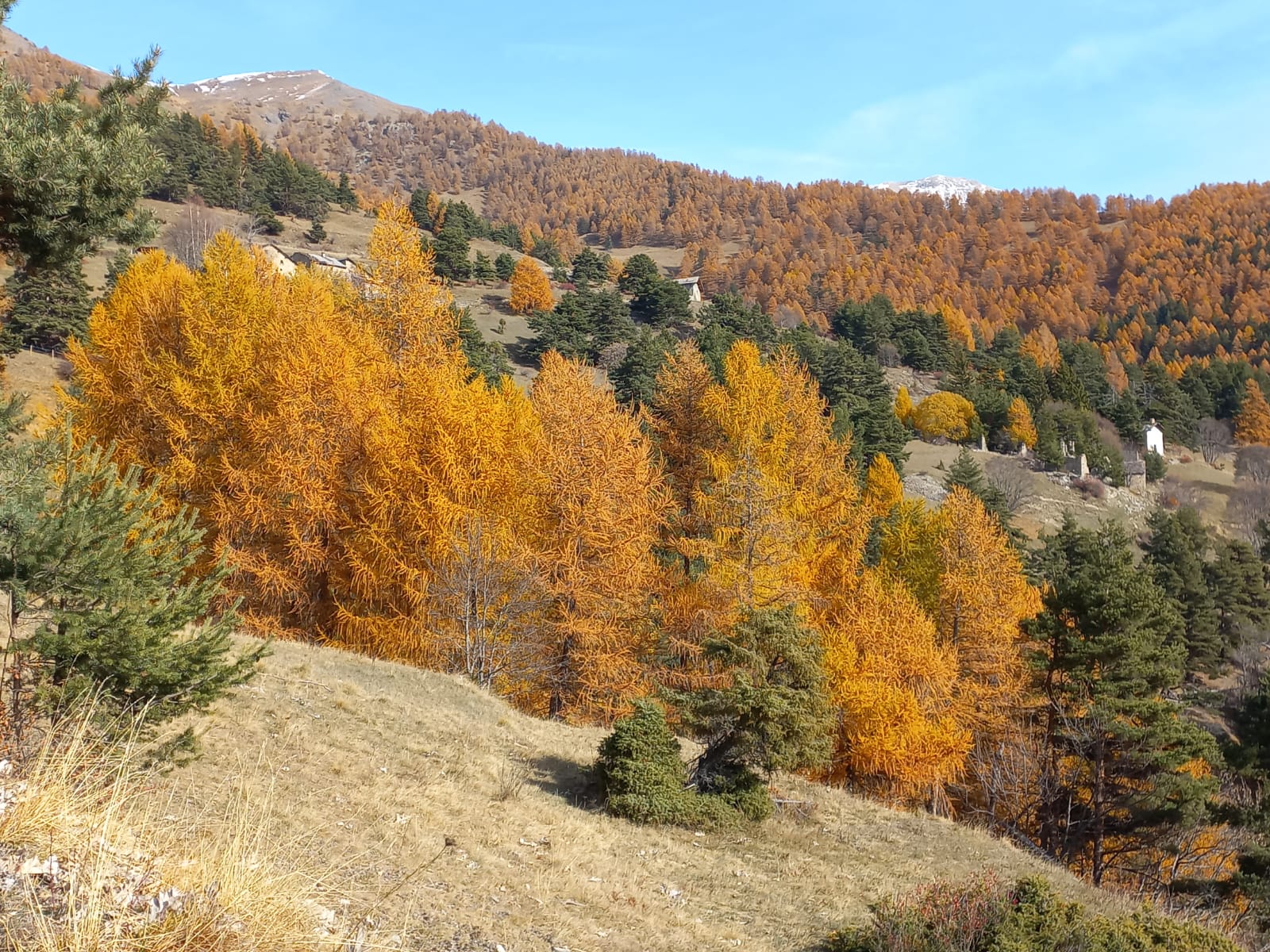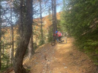 Approfittando dell’estate di San Martino visto anche il peggioramento meteo previsto nel we, pedaliamo ancora in quota con questo itinerario semplice ma in questo periodo di grande effetto naturalistico. Partenza da Beaulard con pozzanghere ghiacciate lungo la pista di fondo e clima “fresco”. Poi si cambia versante e si inizia a salire godendo del caldo sole e del contrasto dei colori tra larici e abeti bianchi, sterrato perfetto sino al Forte. Discesa da guidare all’inizio per stare sui bordi di qualche “ruera” più scavata. Gli alberi che erano caduti sul sentiero sono stati tagliati anche se qualche taglio sporge ancora un pò sul sentiero. Per il resto bello e facile a parte 30 metri lineari di radici e pietre su terreno ripido poco prima di grange Suppas. Noi abbiamo fatto una variante rispetto all’itinerario descritto a partire da Grange Suppas , dove siamo andati verso Foens in direzione est, per poi scendere su Villard. Allego taccia GPX.