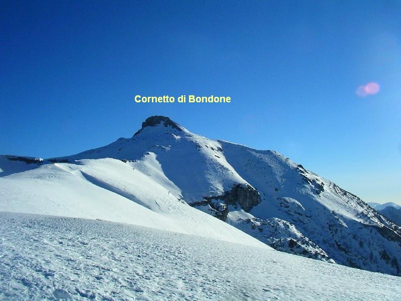 Ci si porta a piedi alle spalle della “pizzeria” e si giunge alla partenza della vecchia pista da sci “Cima 3 (Cornetto)”. Si risale la pista fino a raggiungere la stazione intermedia dei vecchi impianti (1550m circa). Si rimonta quindi verso la dorsale di dx, proprio dove si trovavano gli impianti di risalita. Raggiunto l’inizio del bosco (1700m circa ), si continua in diagonale verso sx, sulla traccia del percorso estivo che attraversa la macchia. In questo modo si arriva alla vecchia pista “Cima 3” dove si continua dritti fino a monte della pista. Ora si va a sx in lieve diagonale fino circa a quota 2000m e poi all’evidente vetta del Cornetto per cresta.