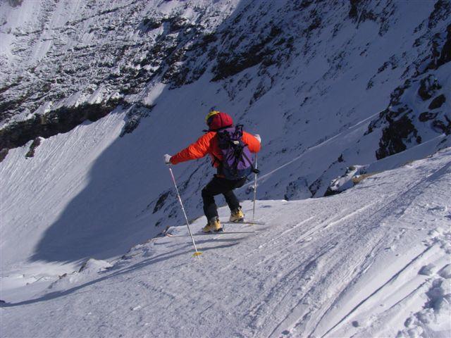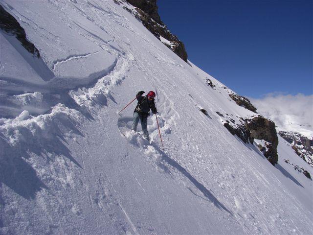 Partiti da Jaffa in una fredda mattinata, risaliamo l’esile lingua di neve del Saulcier giungendo nel pianoro alla base della parete (lo stesso pianoro alla basse dello Charbonnel, poco oltre quota 3000 con meno 7 gradi il 7 giugno (!). Vista la nevicata del giorno precedente e la bassa temperatura, discesa su 10 cm di poudre (dare un’occhiata alle foto…), farina splendida, alle 10 di mattina e poi dinuovo giù per il Saulcier sin quasi al vallon du Ribon. Du bon, du beau ski: chi l’avrebbe mai detto, in questa parete sconosciuta. Naturalmente, vista la stagione, dopo poche ore di sole tutto si trasformerà…