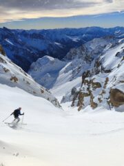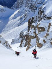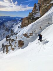 Il banane si presenta con vecchie valanghe alla base, con fondo non regolare, così saliamo il couloir sud, subito a destra del banane.