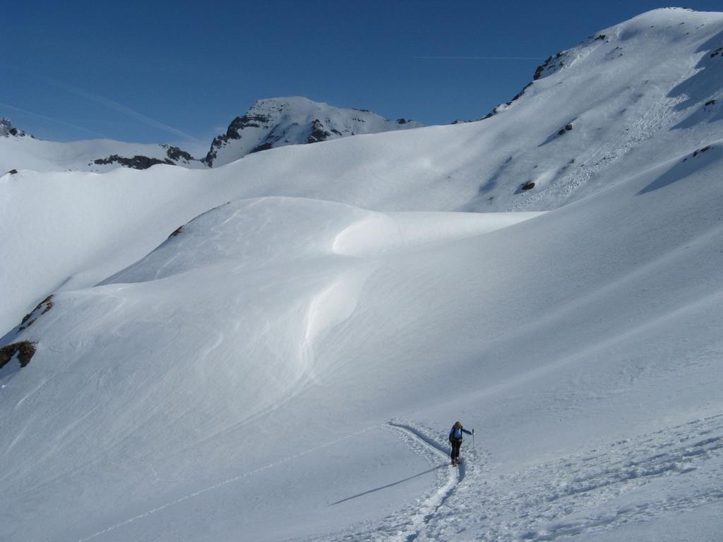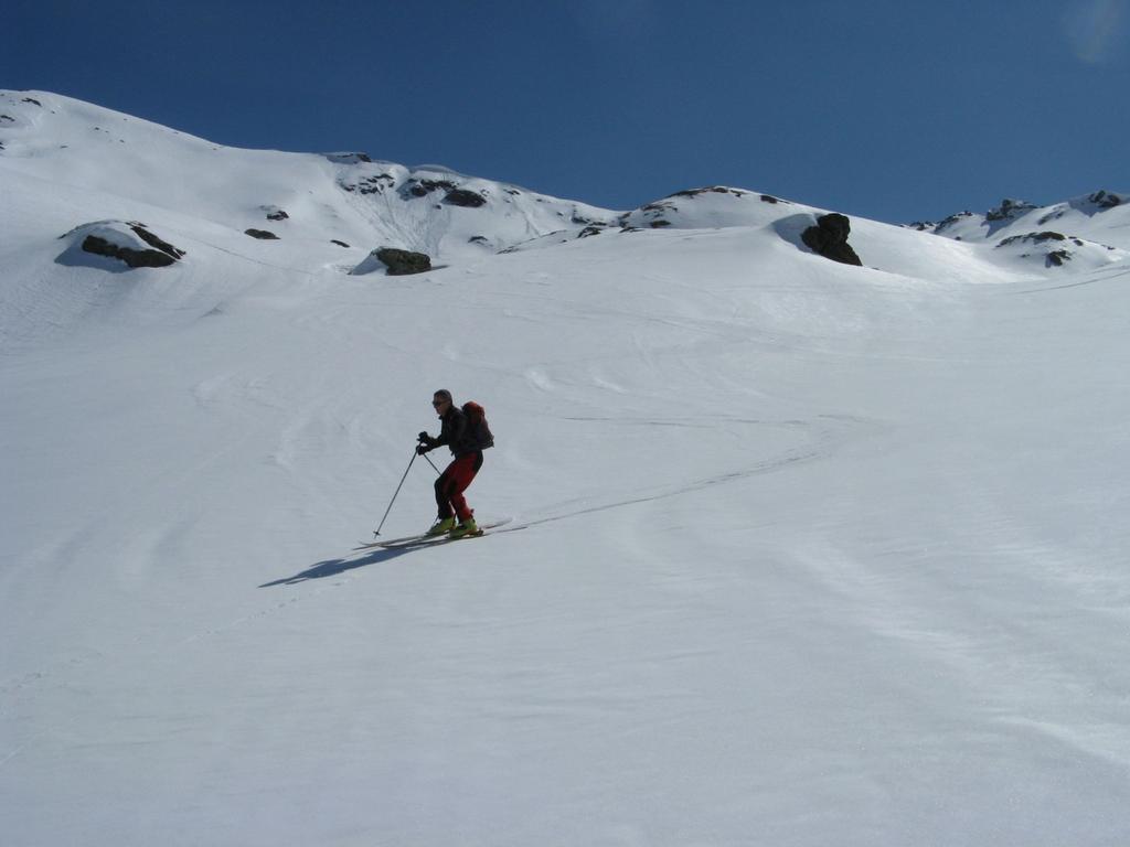 Volevamo fare la spalla della Trecare, ma la cresta non era fattibile e cosi’ ci siamo fermati poco sopra il colle; in salita neve crostosa nel bosco poi compatta sino al colle. In discesa tenendosi sul versante piu’ soleggiato crosta portante ma da sciare con leggerezza, sui pendii piu’ a nord crosta cedevole. In basso firn ma solo nell’ultimo centinaio di metri. Temperatura calda.