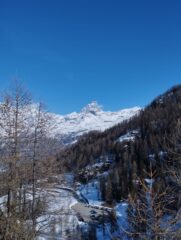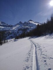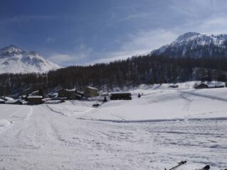 La discesa è divertente ma faticosa, su neve pesante e umida, che qualche giorno fa sarebbe stata ben più pericolosa . Nella parte bassa scesi nel bosco arrivando sopra Cheneil, ma lì la boschi a e la neve ormai simile a polenta rendono impossibile la sciata.