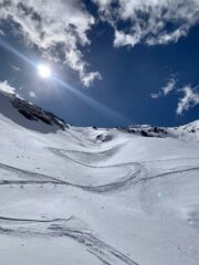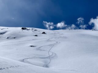 Percorso breve tratto verso la becca di Trecare’/ Becca di Nana, ma pendii oltre il colle valutati poco sicuri. 5 cm di polvere caduta nella notte su fondo portante, se scendendo si prendono i pendii canale molto a sinistra rispetto a quelli non ancora completamente scaricati che scendono dalla Falinere. Percorso consigliabile anche in salita.