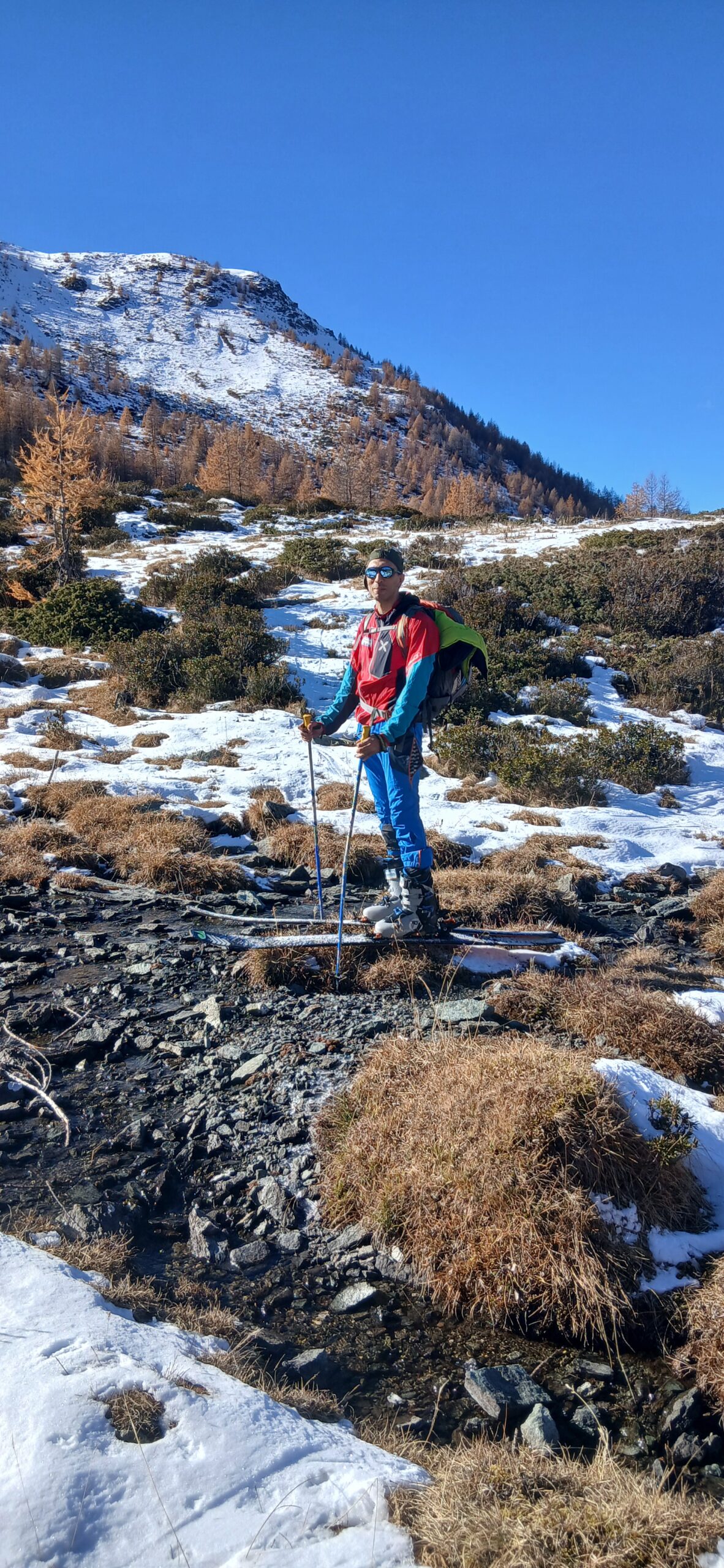Siamo partiti con non troppe speranze, invece poi la parte alta della gita ha regalato già emozioni invernali, con un’ottima farina vecchia che fa buon brodo… sotto da arrangiarsi tra pietre, prati e arbusti, ciò nonostante abbiamo sciato praticamente fino a Cheneil, inventandoci i passaggi nel bosco basso tra una chiazza di neve e l’altra…