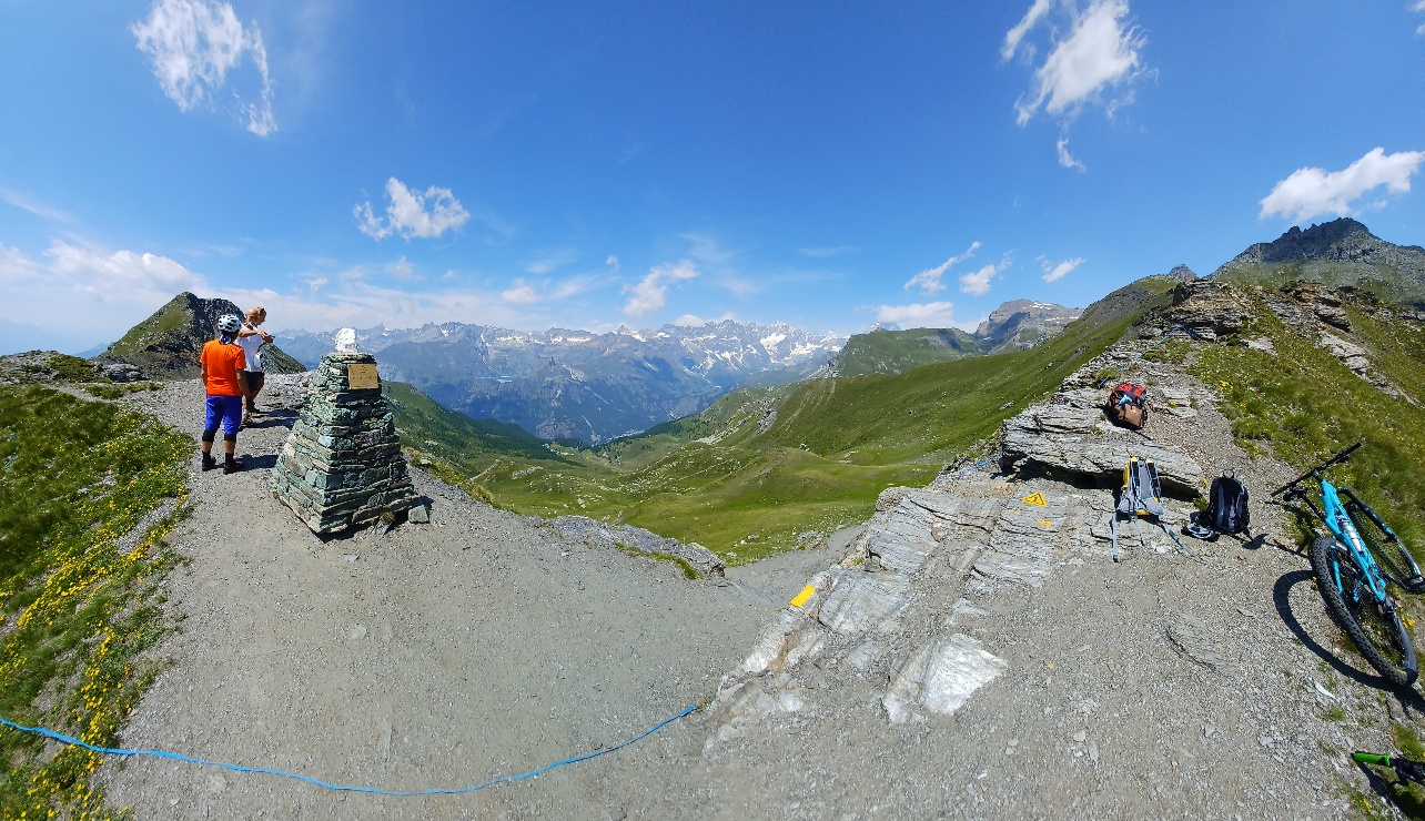 Università (della terza età) di MTB! Salita breve e tosta, giusto portage, e discese veramente impegnative per sviluppo, fondo, scabrosità, percorse comunque in sella per lunghi tratti, con impegno e divertimento: impressionanti l’affaccio sulla ripidissima mulattiera di Cheneil, la successione di svolte nel bosco, ed il susseguirsi di gradoni e infidi tagliaacqua. Ottima e doverosa la sosta rinfrancante a Cheneil