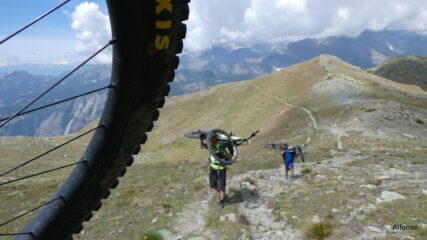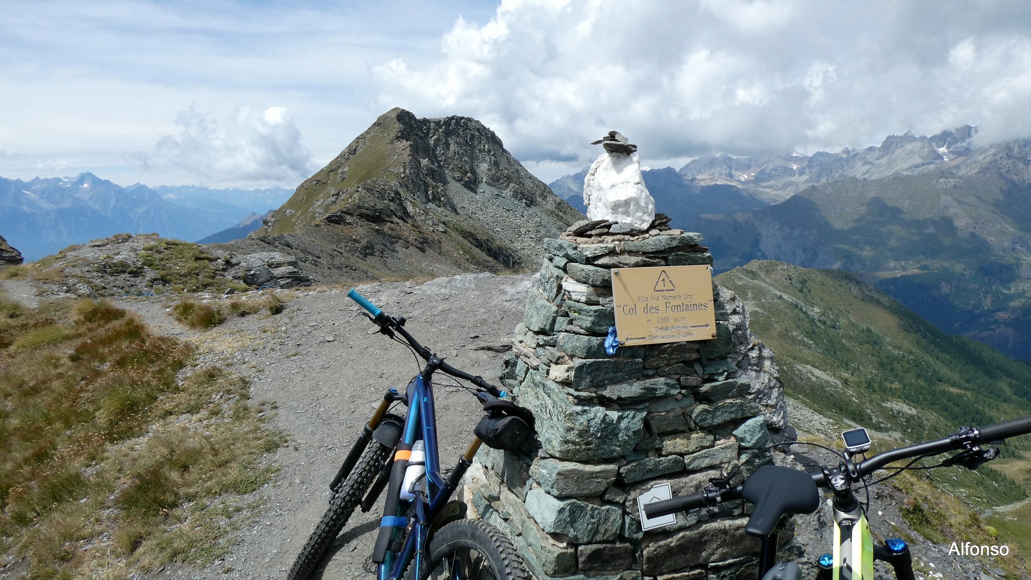 Super gita di gran soddisfazione. È sempre un piacere andare in montagna in bici nei luoghi frequentati d’inverno con sci e pelli. La salita al Col des Fontaines è impegnativa da subito con rampe al limite e impedalabili sotto al colle di Fontana Fredda, poi portage/spintage; noi abbiamo seguito il sentiero 3 fino al bivio per il col di Nana, a tratti pedalabile; anche la discesa nella conca di Cheneil sull’AV1 è tosta! È un OC sostenuto, alterna tratti molto tecnici (anche S3-S4) ad altri più scorrevoli e il divertimento continua anche dopo Cheneil fino a Valtournenche paese. Panorami familiari, tanti animaletti e quasi nessuno in giro! La funivia per Chamois con bici al seguito costa 7,50€.