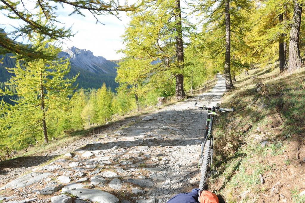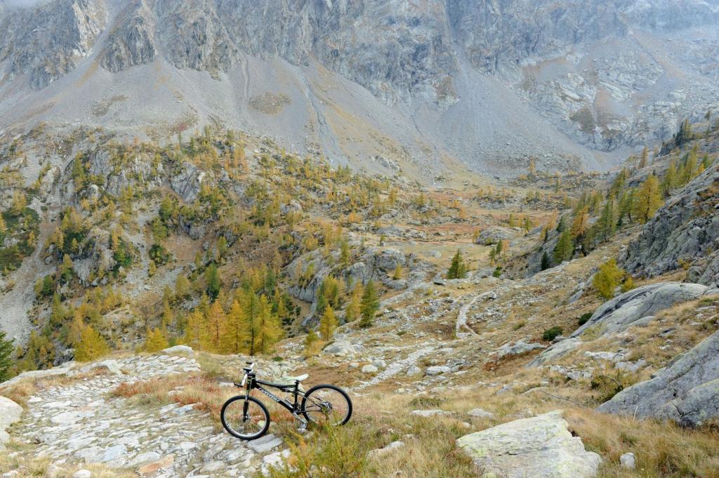 Invece se non si è passati dalla faticosa basse di Fontanalba , bisogna passare dalla altrettanto faticosa basse di Valmasque e tribolare su sentiero sino al Refuge de Merveilles in piena valle meraviglie con graffiti e tutto quanto ( occhio alle multe in questa zona) e poi dal Rifugio in giù inizia il divertimento e lo spettacolo sulla bellissima lastricata del Vallon de la Miniere che ci porta al lago Mesches dove abbiamo la macchina (itinerario 12 del libro Mtb sulle strade militari alpine)