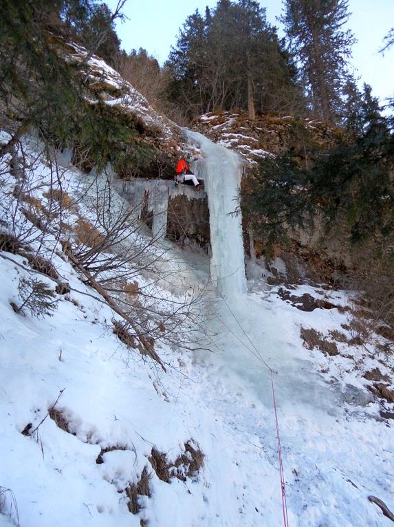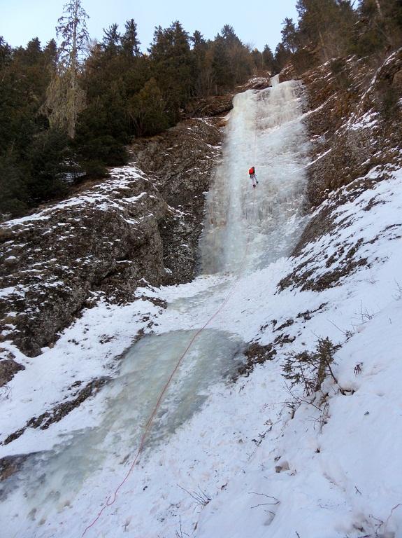 Diversamente dalla relazione di cui sopra, noi abbiamo salito una prima lunghezza di 55 m. fino a 80° in uscita, seguita a breve da un free-standing aggirato a sinistra, con passo in dry poco proteggibile, a causa del ghiaccio secco e fragile a rischio di crollo. Oltre, dopo un pendio di collegamento, si raggiunge un bel muro di 70 m. W4+, con diverse linee di salita. Discesa tutta su Abalakov. Con Bresaola60.