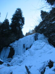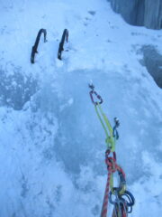 Cascata molto bella e incassata, si apre nell’anfiteatro sommitale. Abbiamo optato per la variante a sx dell’anfiteatro, 4/4+. Ghiaccio duro e fragile, chiodatura non sempre ottimale.