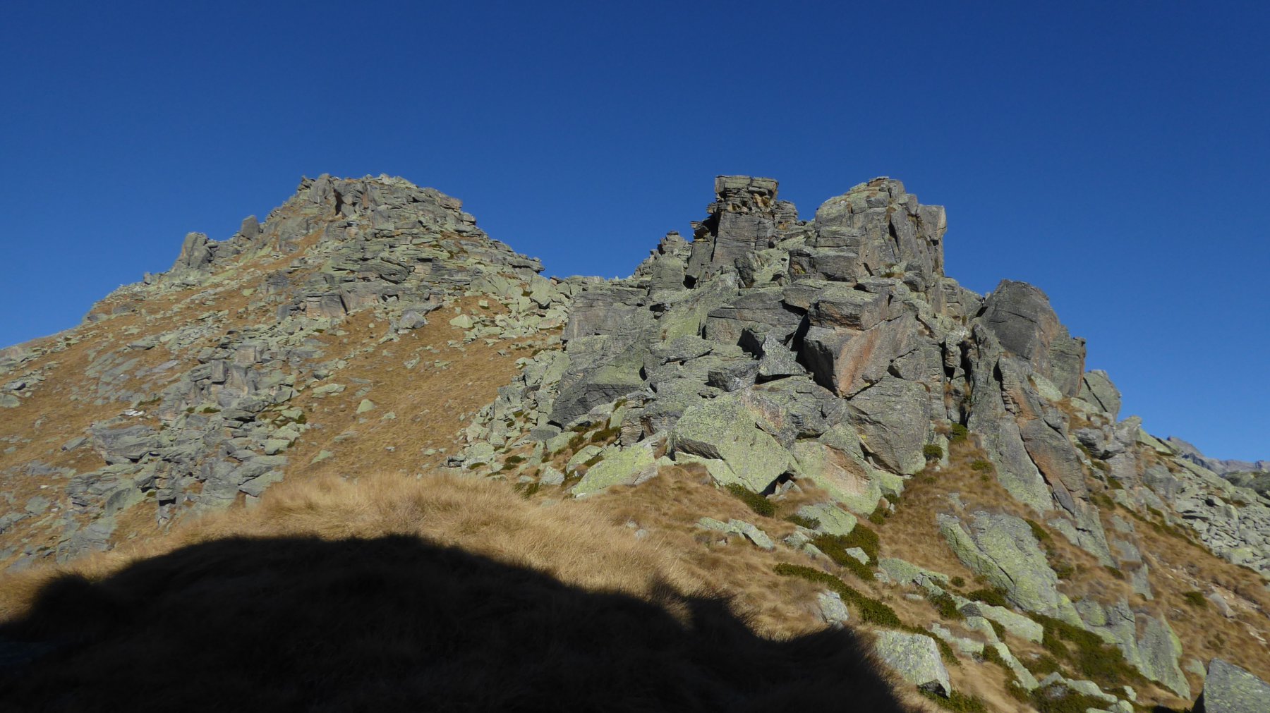 Discesa alla vicina bocchetta di quota 2556, discesa sul versante sud al piccolo combetto sottostante, scendere per un tratto sul lato destro, poi con l’approssimarsi dei dossi placconati, spostarsi verso sinistra e raggiungere la comba sottostante.