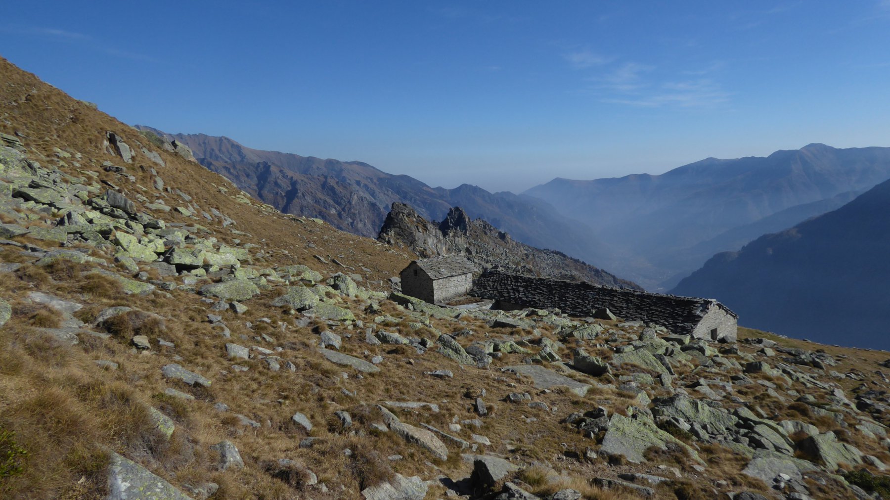 Fortunatamente ci si trova ormai fuori dal bosco, la visibilità è ottima ed è facile muoversi anche senza seguire una traccia obbligata. Prendere come riferimento un evidente gendarme di pietre accatastate che diviene presto visibile. Tenendo quest’ultimo sulla nostra sinistra si risale il prato in pendenza e si giunge ad un nutrito gruppo di baite (q. 1917) dell’Alpe Giua inferiore.