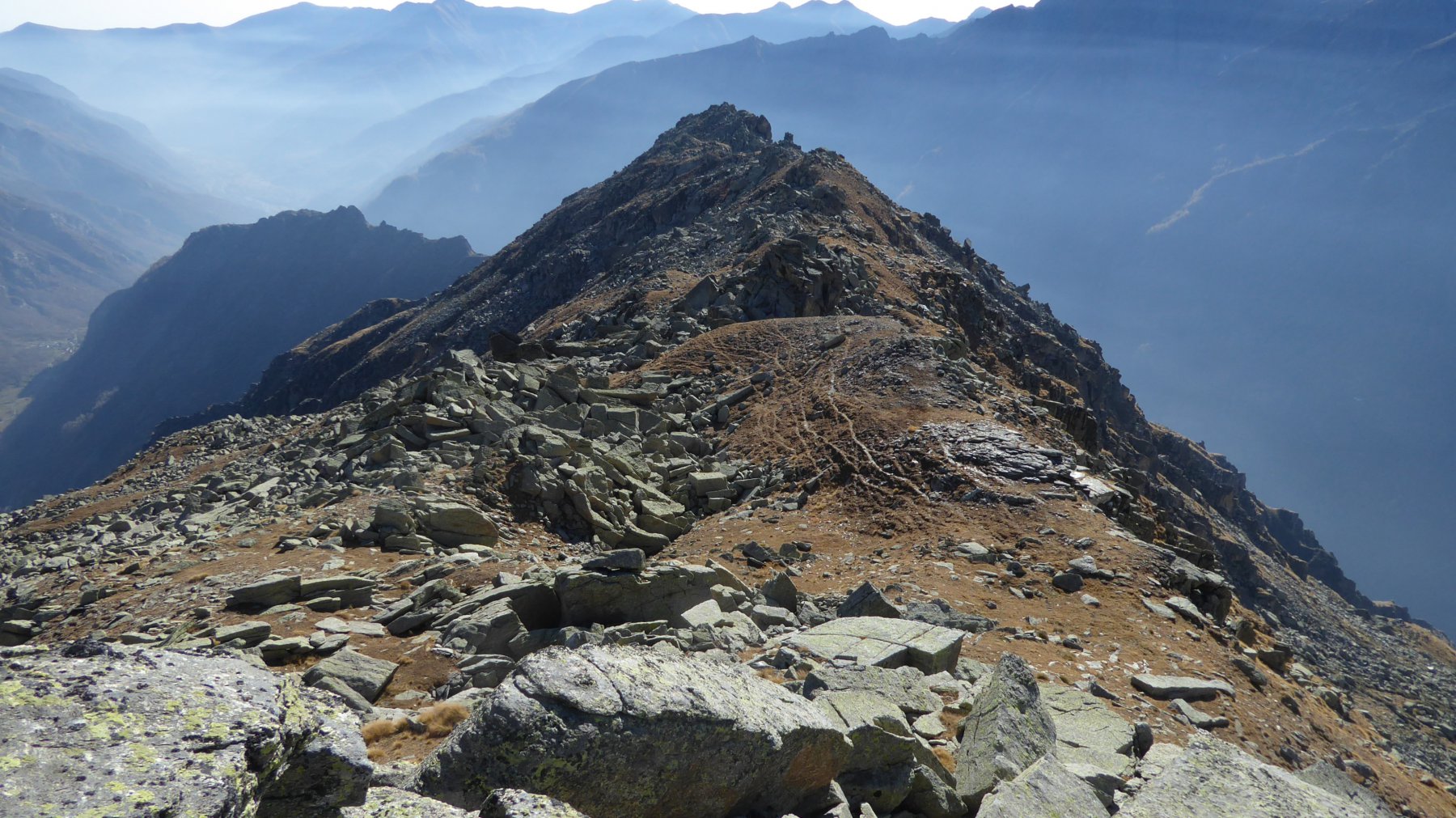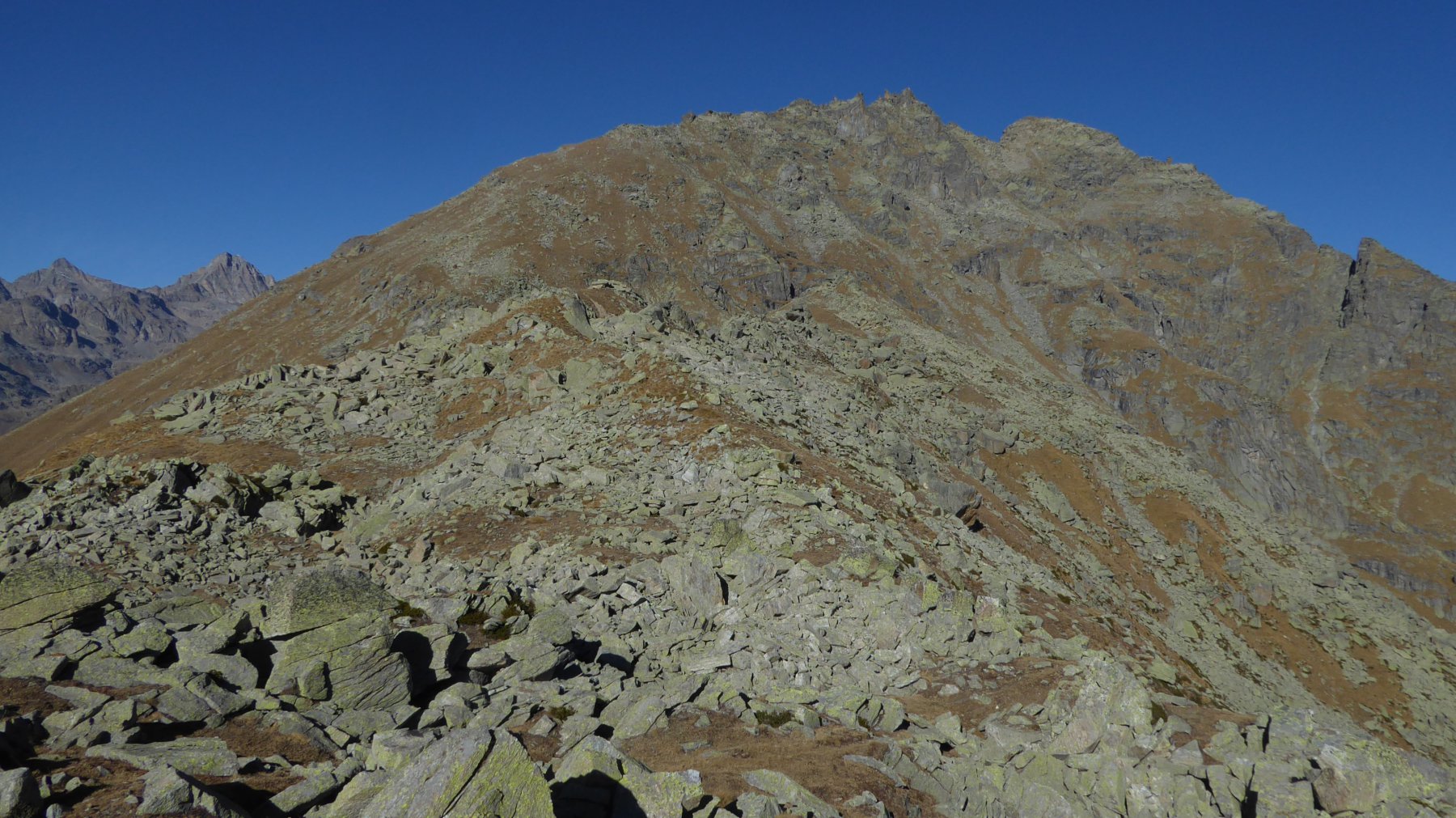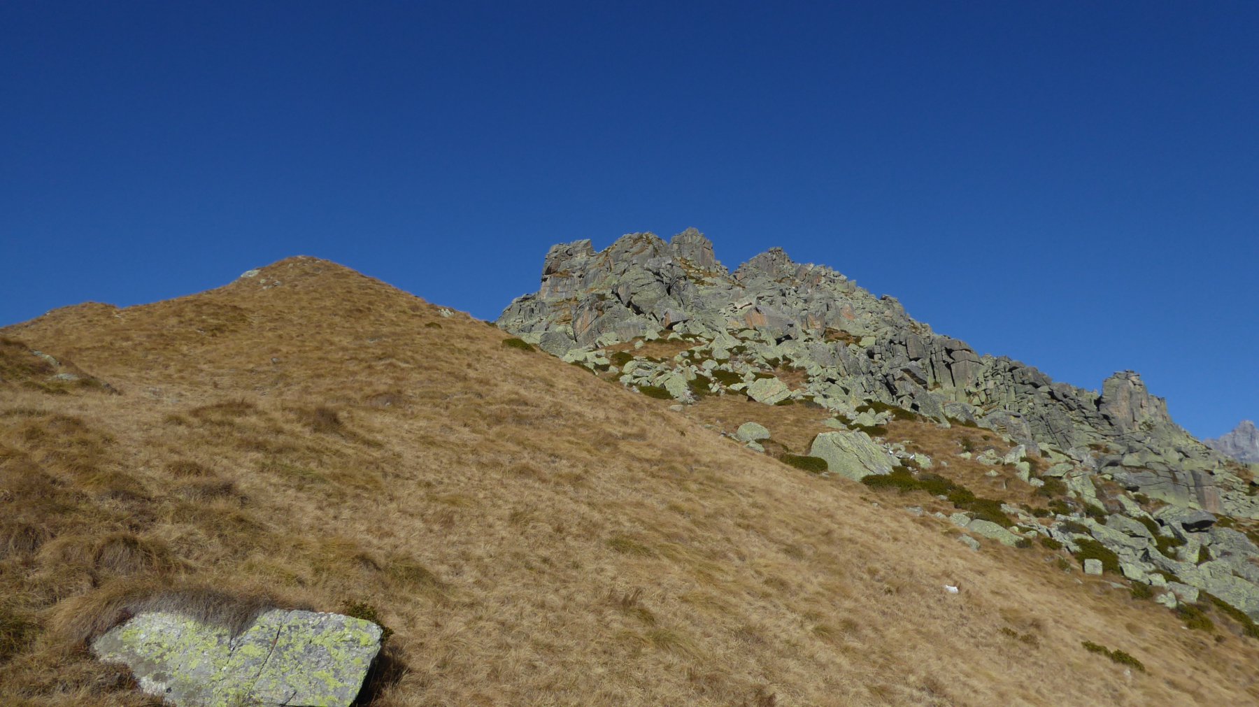 Di qui in poi le tacche del sentiero diventano rosse e meno evidenti per cui è necessario prestare un po’ di attenzione. Dopo un tratto in piano o quasi la traccia svolta decisamente a destra e inizia a salire rapidamente a tornanti fino intorno a q. 1700 quando rivolgendosi a est percorre un tratto in costa a pendenza moderata fino al gruppetto di baite q. 1755. Subito dopo i primi edifici il sentiero piega a sinistra (N) e attacca abbastanza direttamente il pendio. Le tacche rosse sono in questo tratto ancora meno evidenti che nel precedente per cui è facile perderle, ritrovarle e riperderle.