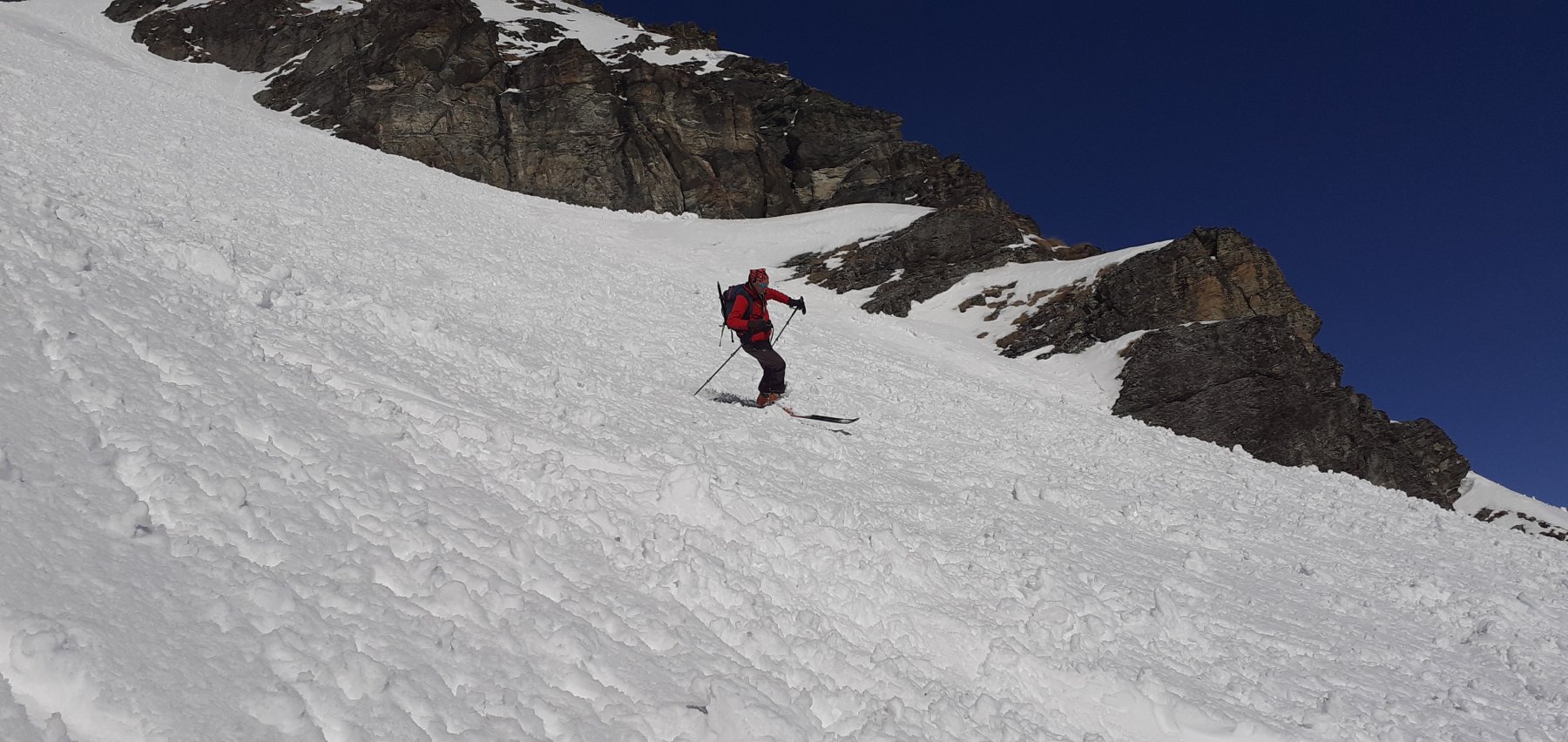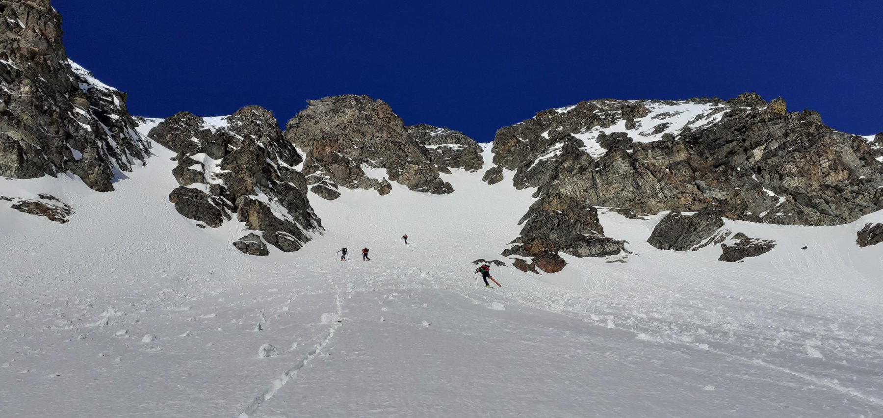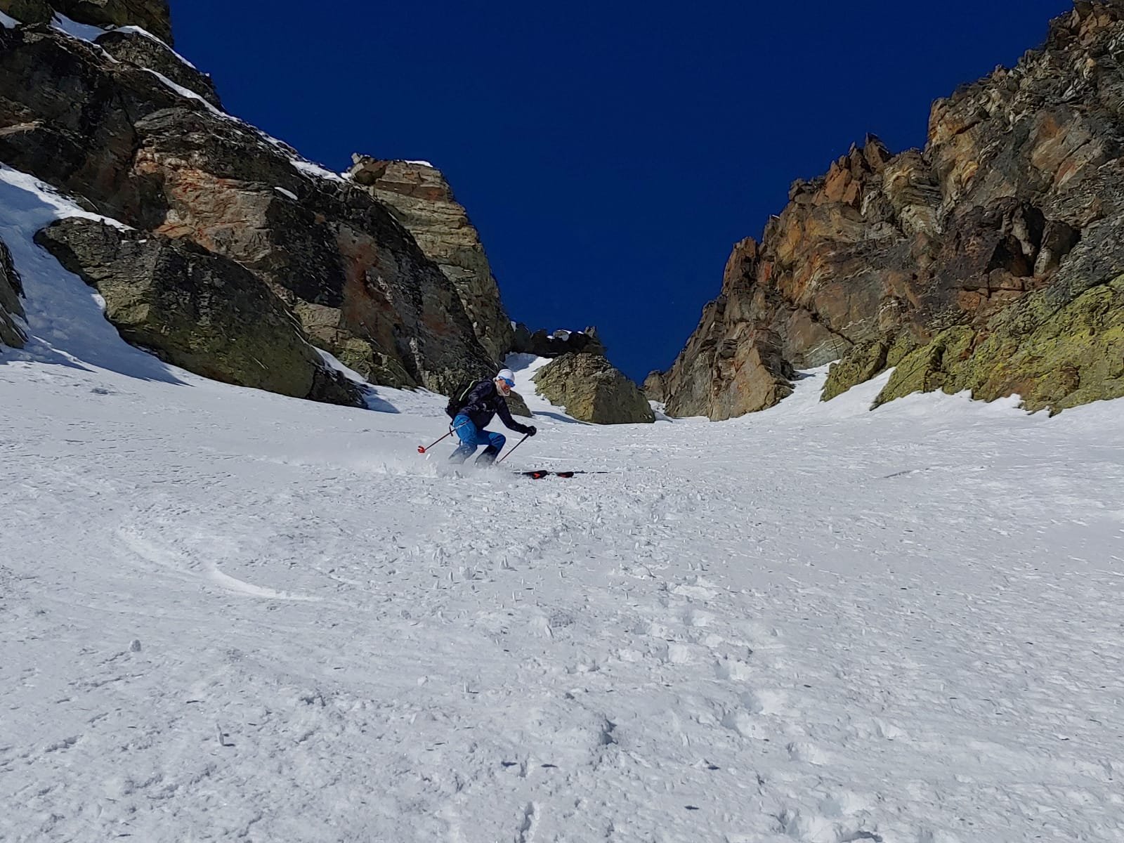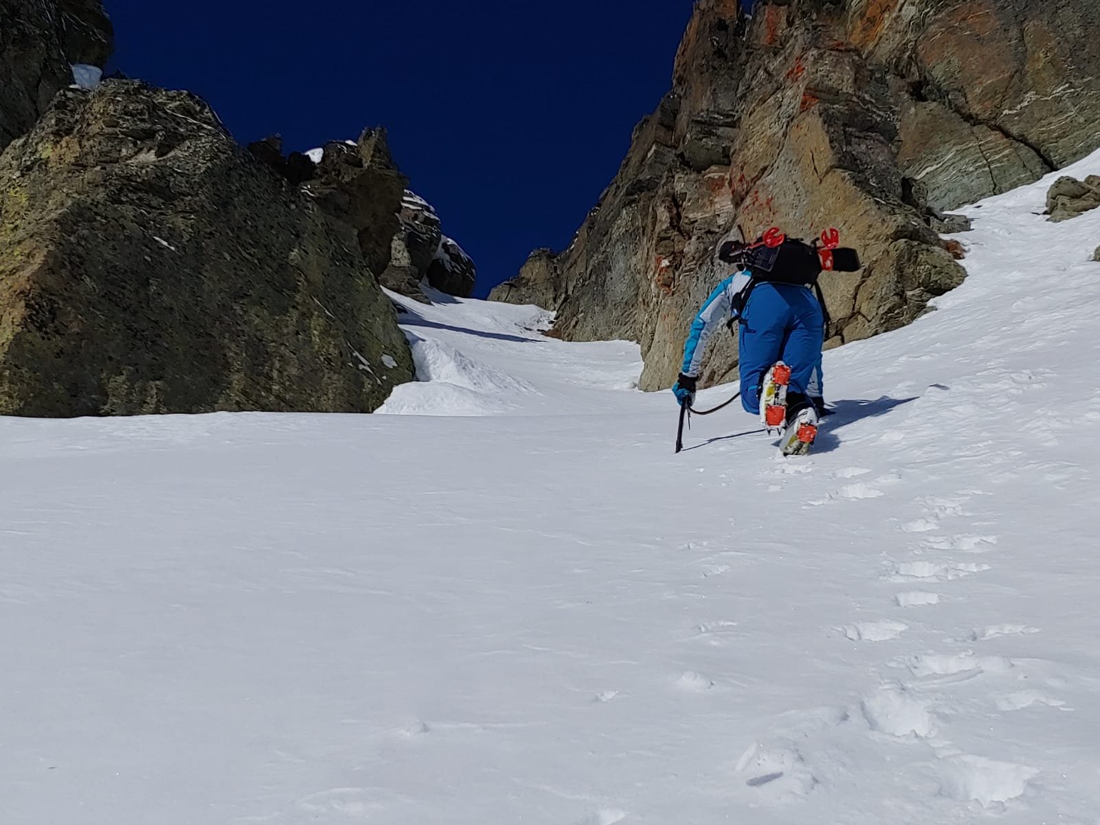 Prima parte identica all’itinerario per il Col Salvė. Poi giunti al colle si prosegue nella conca sotto il Colle Chalėby, il canale lo si ha di fronte , è ben visibile, quindi si inizia a salire il conoide finchė si riesce con gli sci per poi calzare i ramponi e risalire il canale a piedi , le pendenze variano intorno ai 40° e 45 ° per circa 200 mt di dislivello. Ad un certo punto il canale si sdoppia , tenere il ramo sx per poi sbucare direttamente sotto la cima .