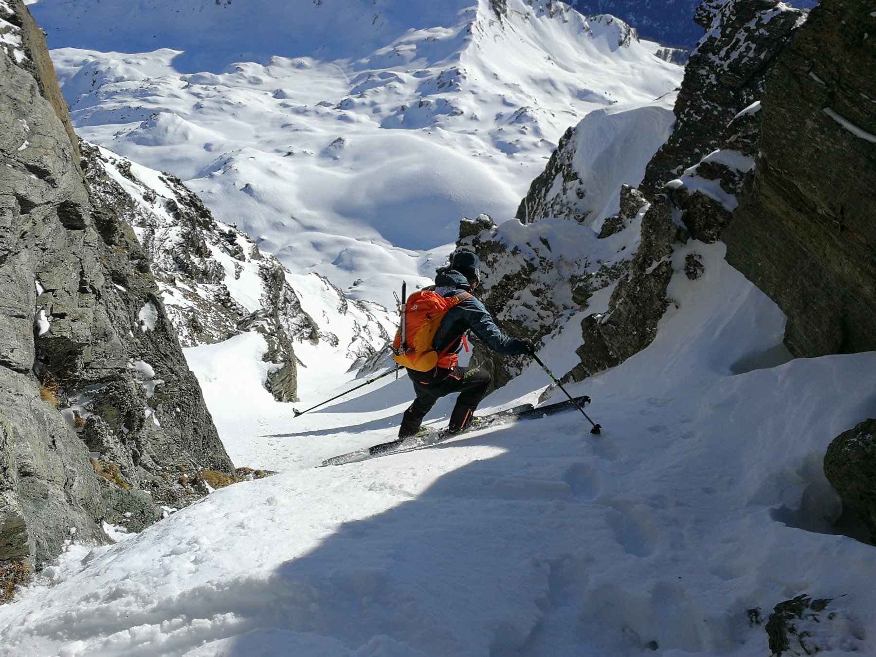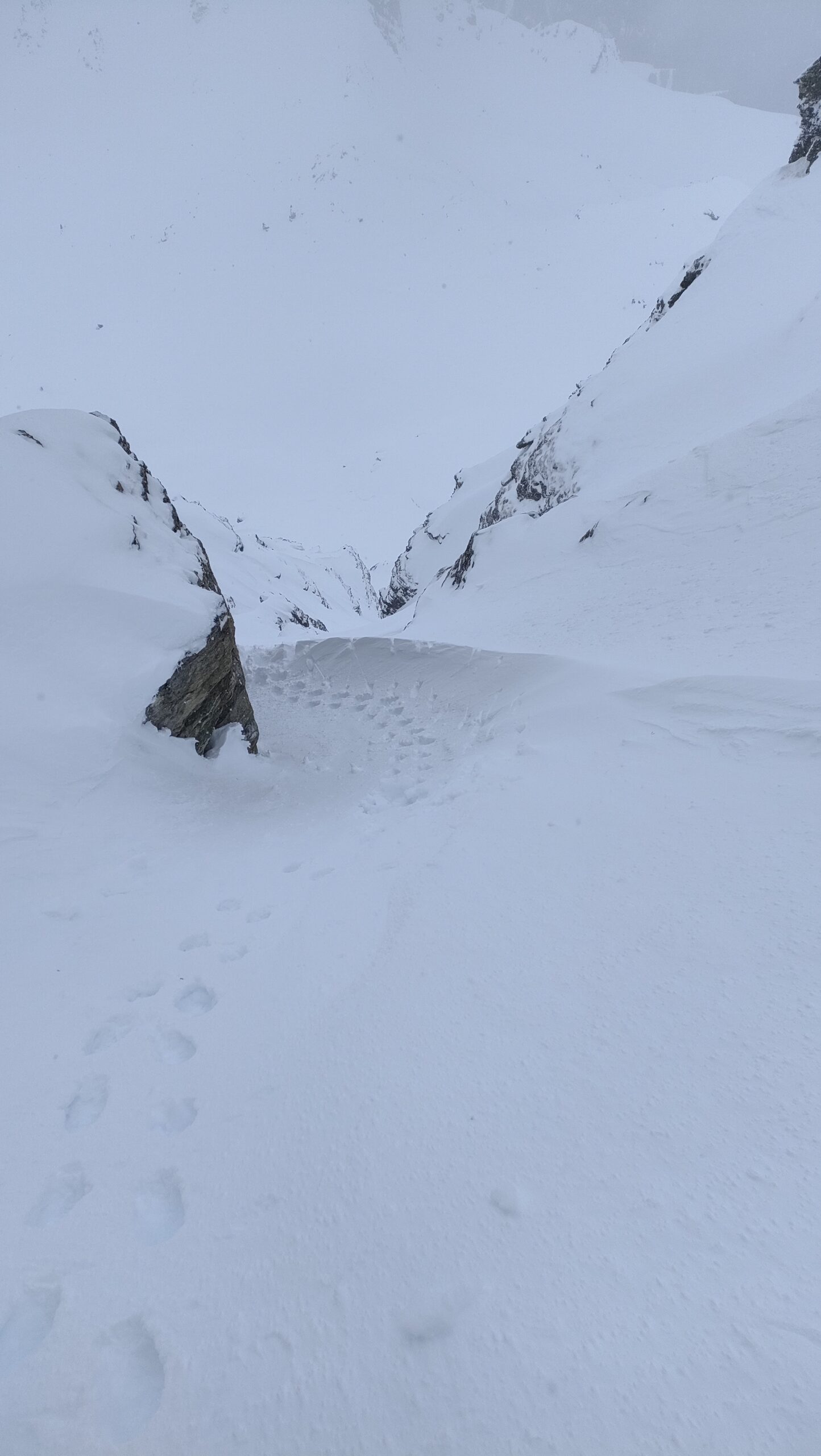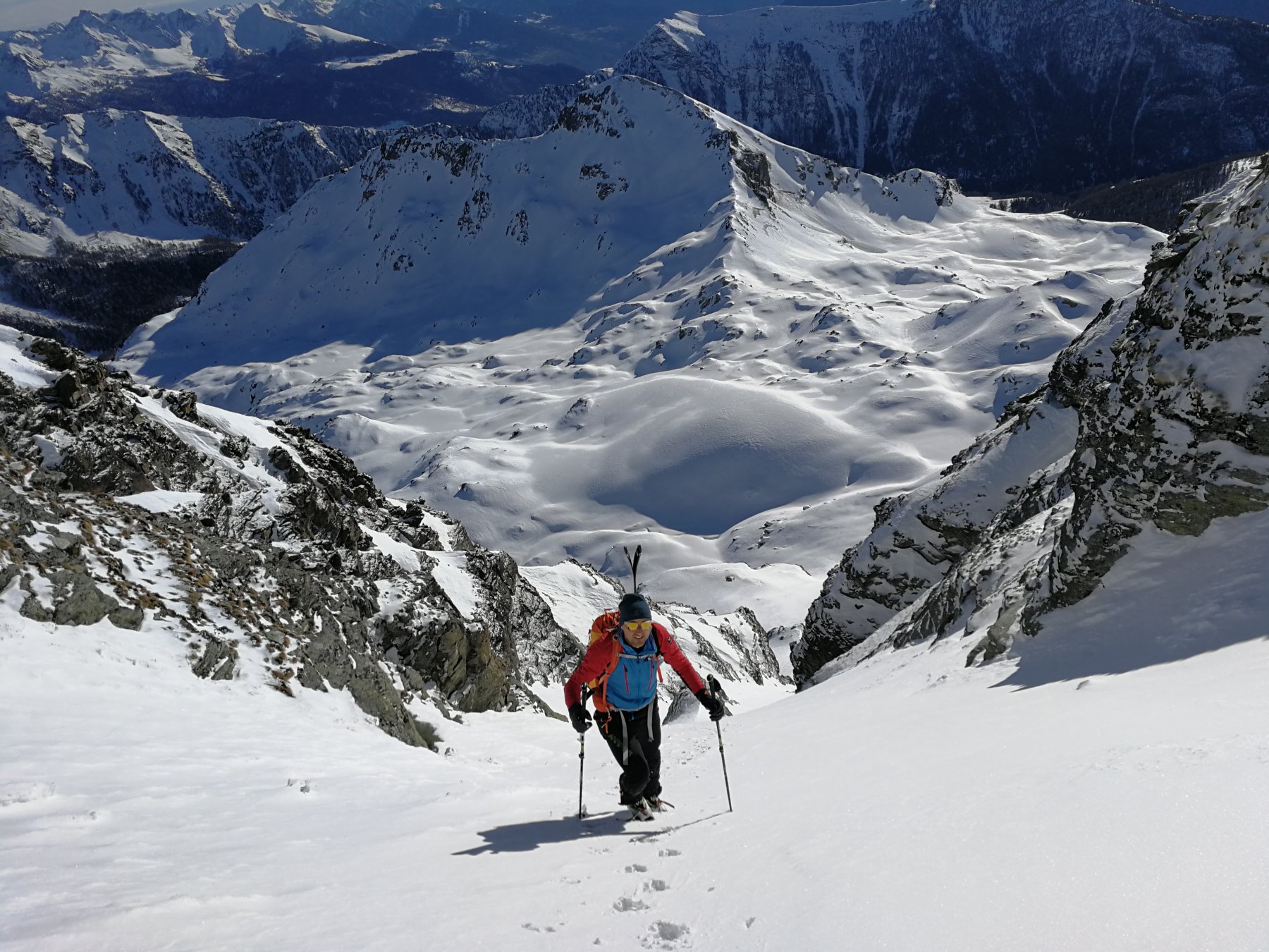 Prima parte identica all’itinerario per il Col Salvė. Poi giunti al colle si prosegue nella conca sotto il Colle Chalėby, il canale lo si ha di fronte , è ben visibile, quindi si inizia a salire il conoide finchė si riesce con gli sci per poi calzare i ramponi e risalire il canale a piedi , le pendenze variano intorno ai 40° e 45 ° per circa 200 mt di dislivello. Ad un certo punto il canale si sdoppia , tenere il ramo sx per poi sbucare direttamente sotto la cima .