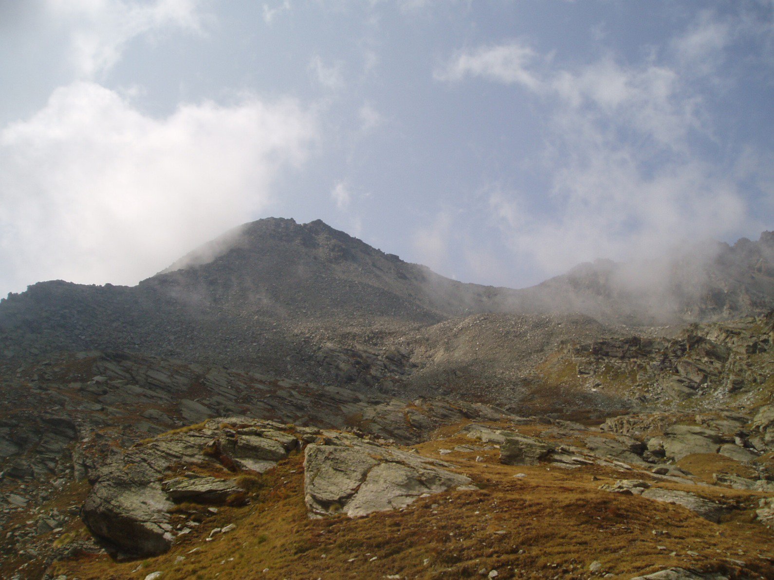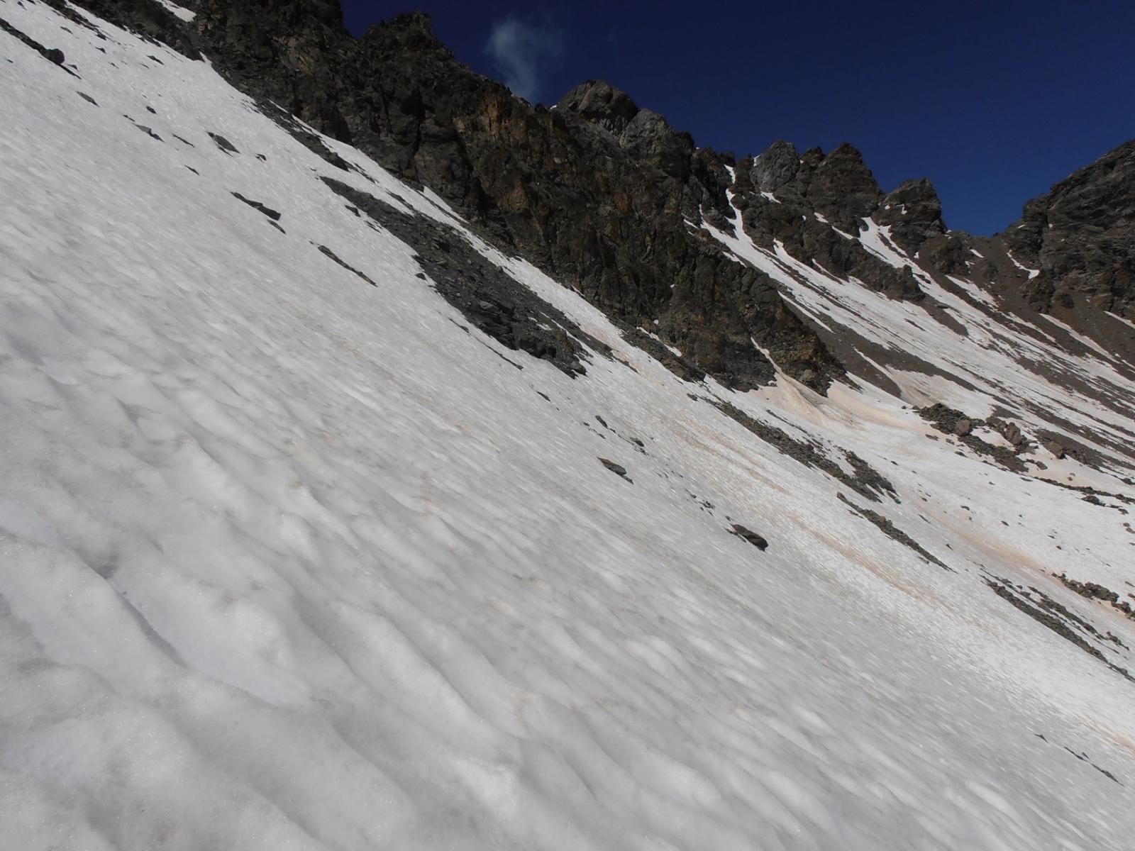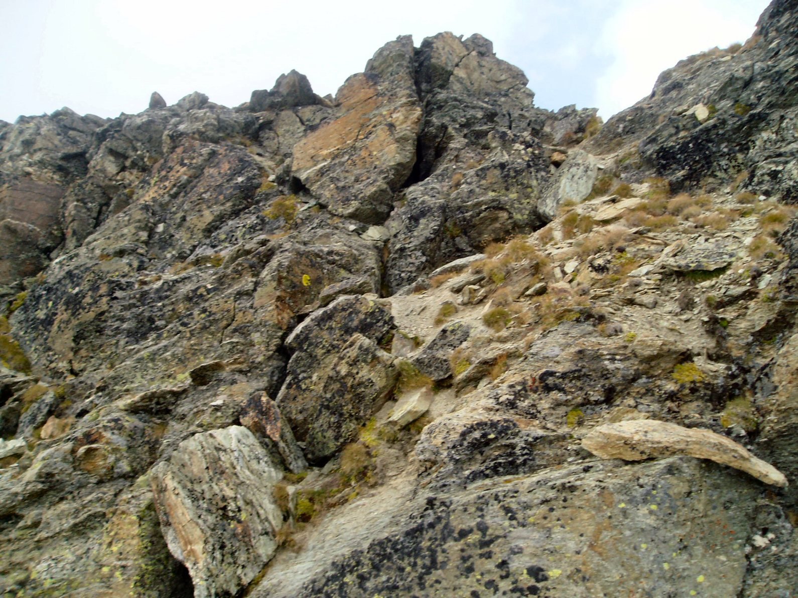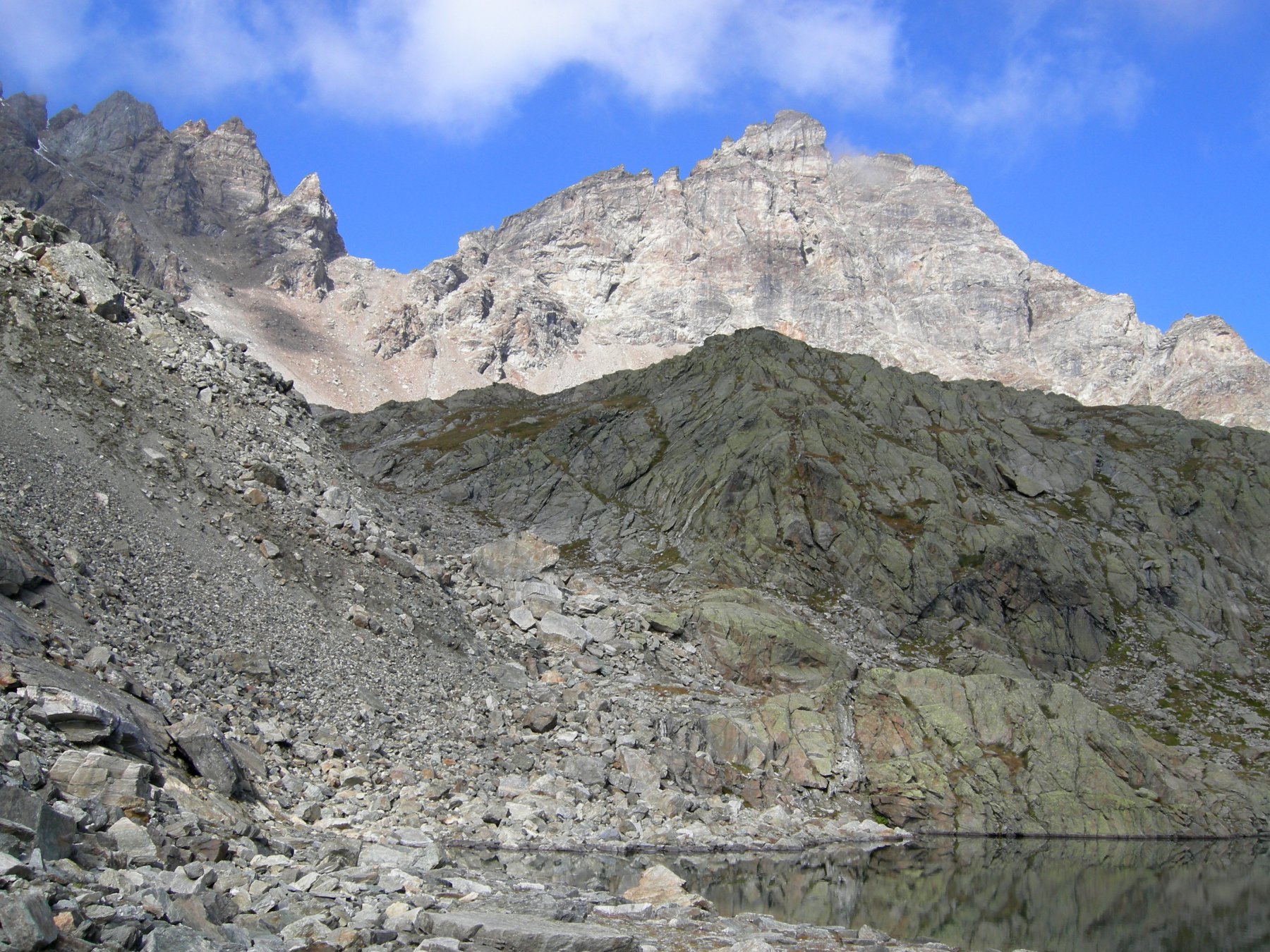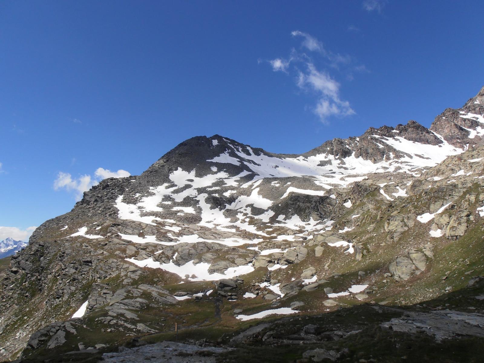 Lasciando il lago a destra, si prosegue salendo per facile sentiero la breve morena detritica, raggiungendo un pianoro con una enorme pietraia che però si attraversa rapidamente e comodamente, portandosi alla base del ripido pendio grigiastro (detriti) che adduce al colletto sovrastante. Qui la traccia diventa un po’ più ripida e faticosa, alcuni brevi passaggi risultano un po’ erosi ma si sale senza difficoltà. Raggiunta la sella a circa 2930 m, si passa sul versante sud della montagna, seguendo una comoda traccia che sfrutta un terrazzone sotto cresta. Rapidamente si arriva in un punto in cui il terrazzo si interrompe con una profonda fessura: qui occorre portarsi in cresta salendo per un facile gradone roccioso (I+).