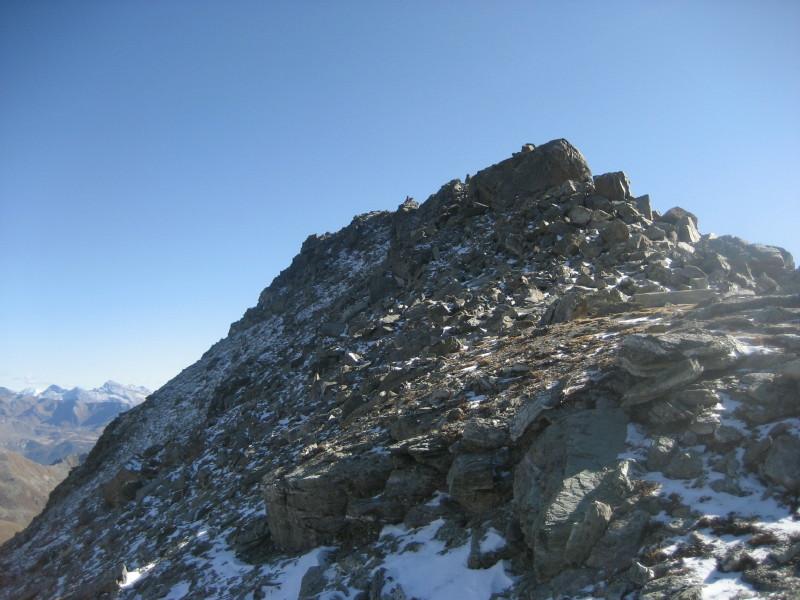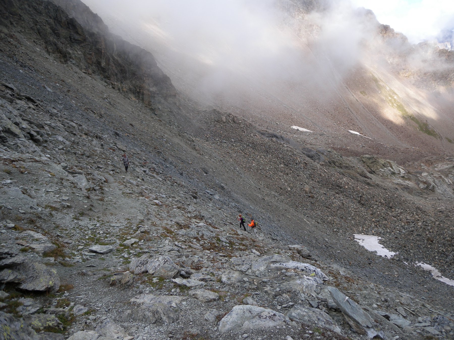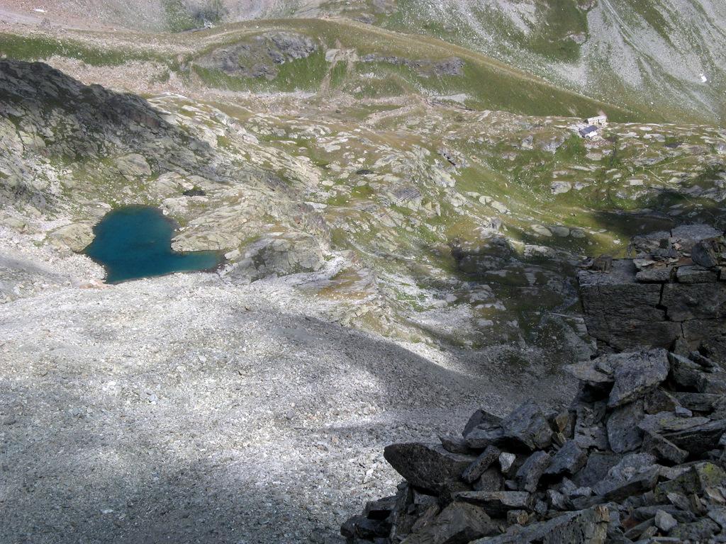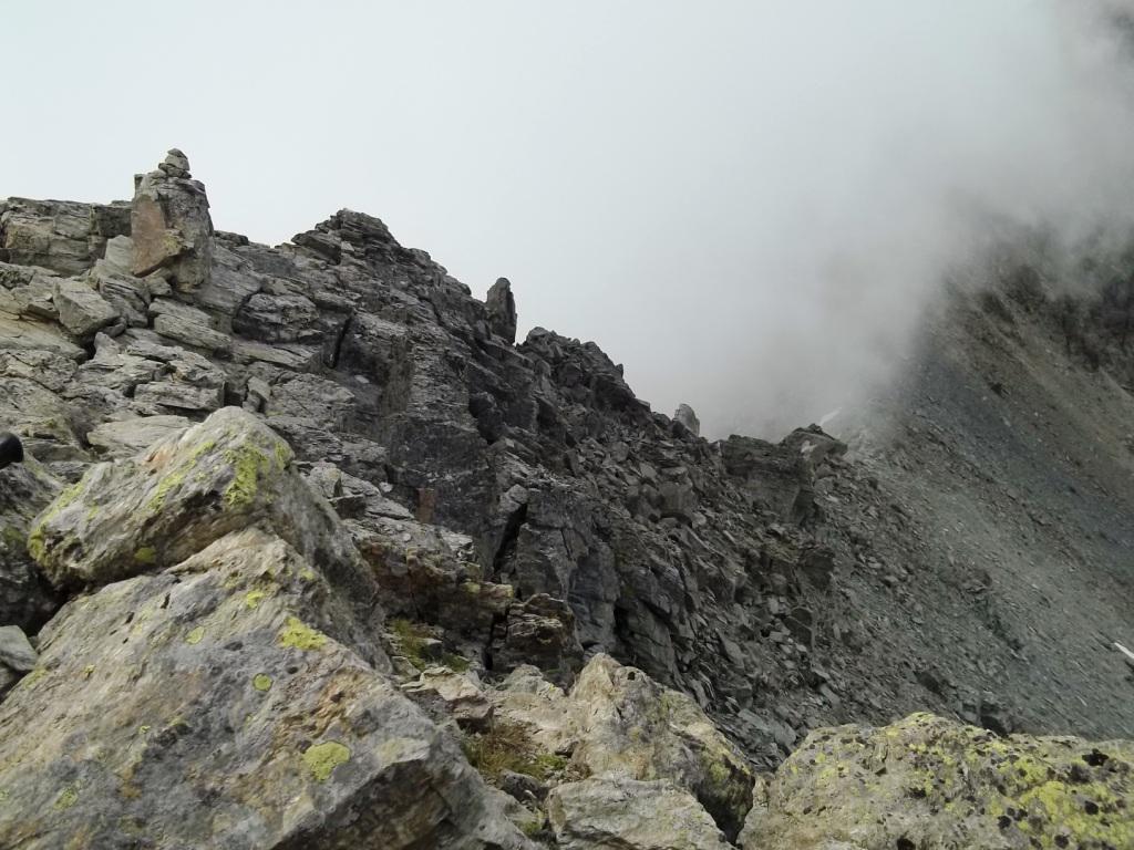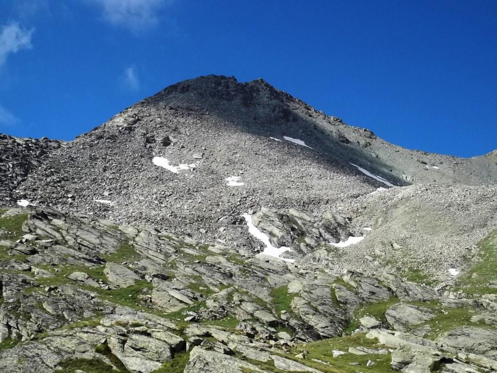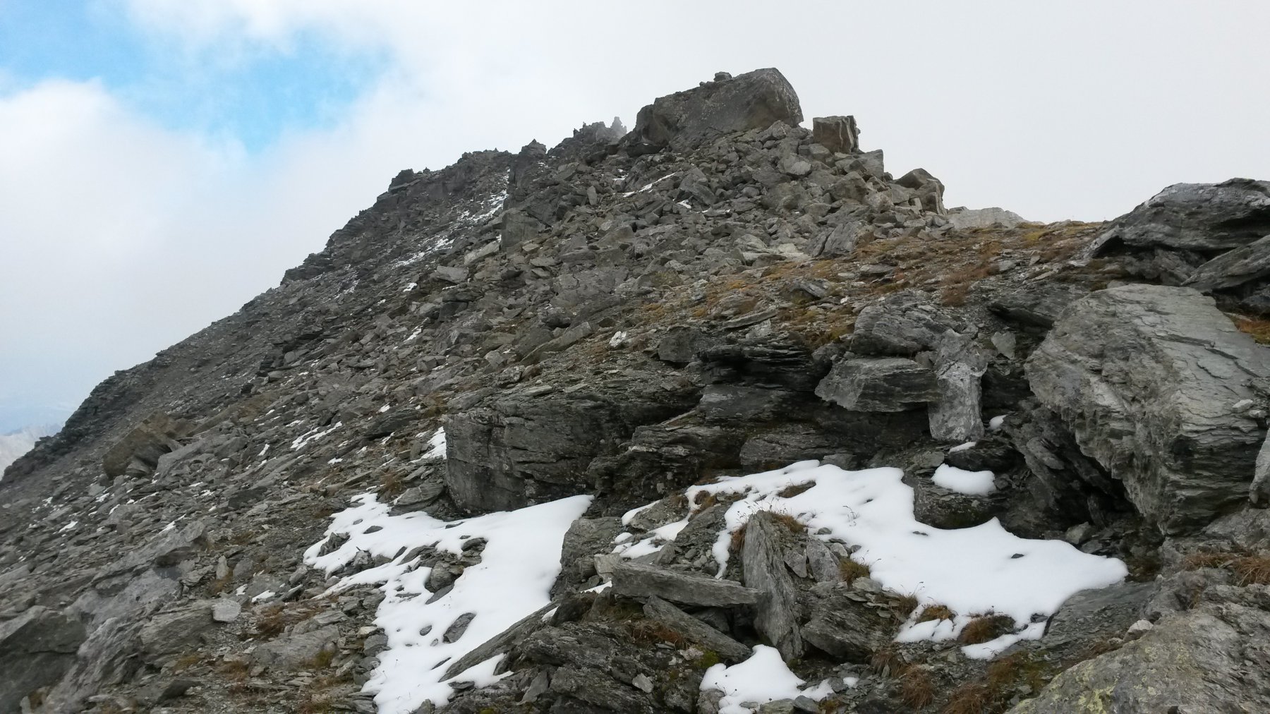 Lasciando il lago a destra, si prosegue salendo per facile sentiero la breve morena detritica, raggiungendo un pianoro con una enorme pietraia che però si attraversa rapidamente e comodamente, portandosi alla base del ripido pendio grigiastro (detriti) che adduce al colletto sovrastante. Qui la traccia diventa un po’ più ripida e faticosa, alcuni brevi passaggi risultano un po’ erosi ma si sale senza difficoltà. Raggiunta la sella a circa 2930 m, si passa sul versante sud della montagna, seguendo una comoda traccia che sfrutta un terrazzone sotto cresta. Rapidamente si arriva in un punto in cui il terrazzo si interrompe con una profonda fessura: qui occorre portarsi in cresta salendo per un facile gradone roccioso (I+).