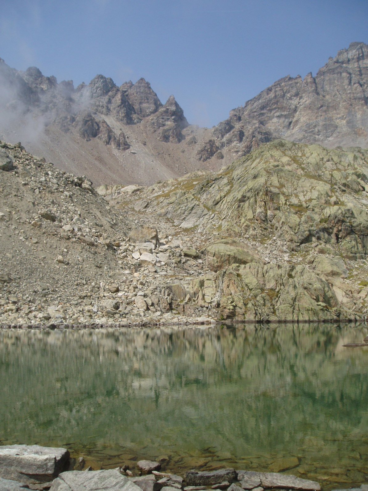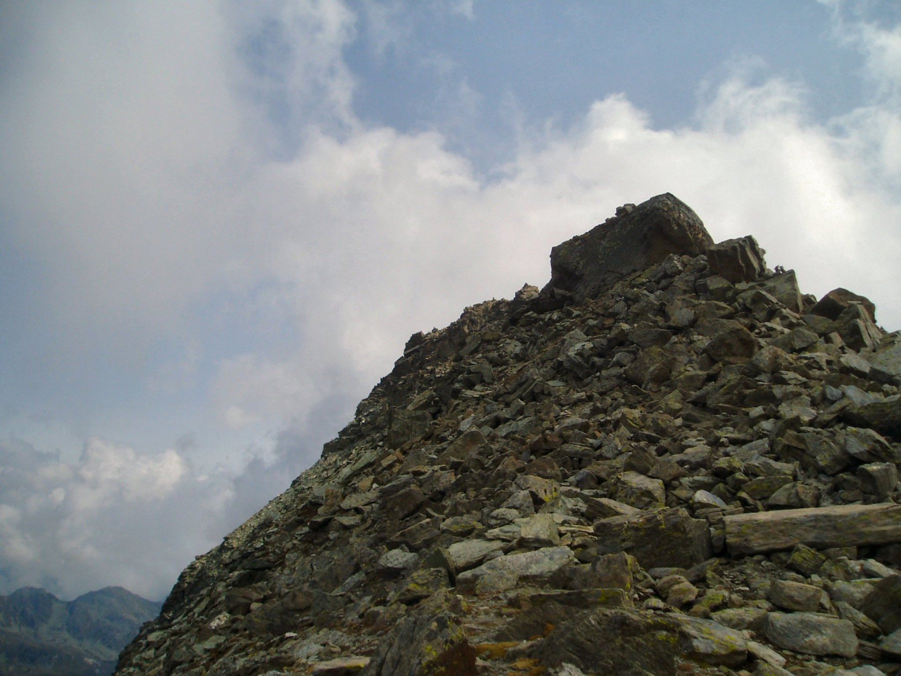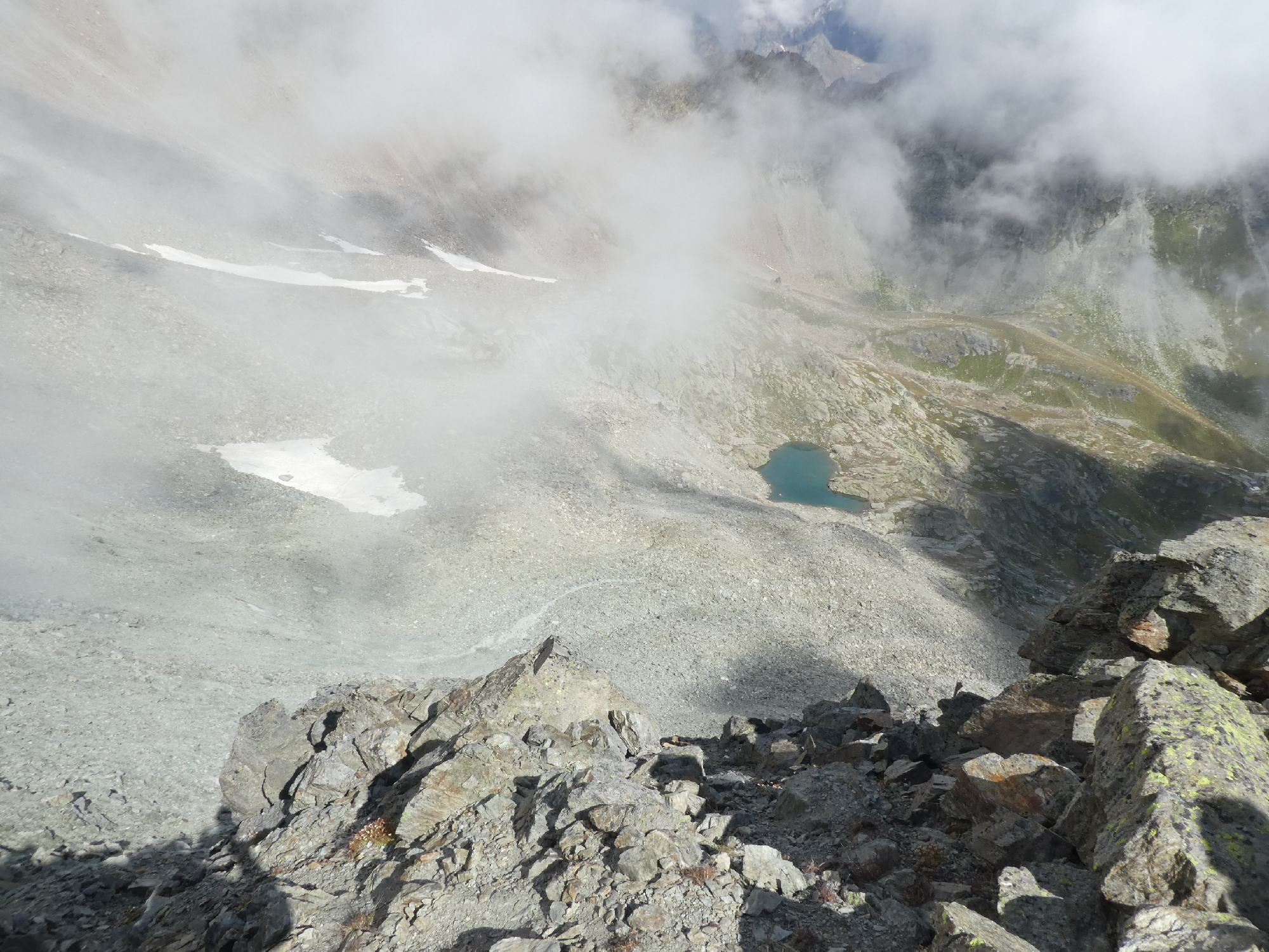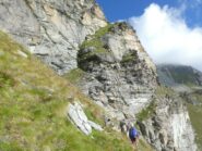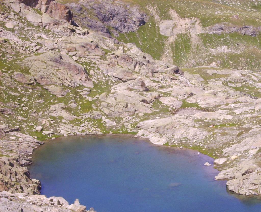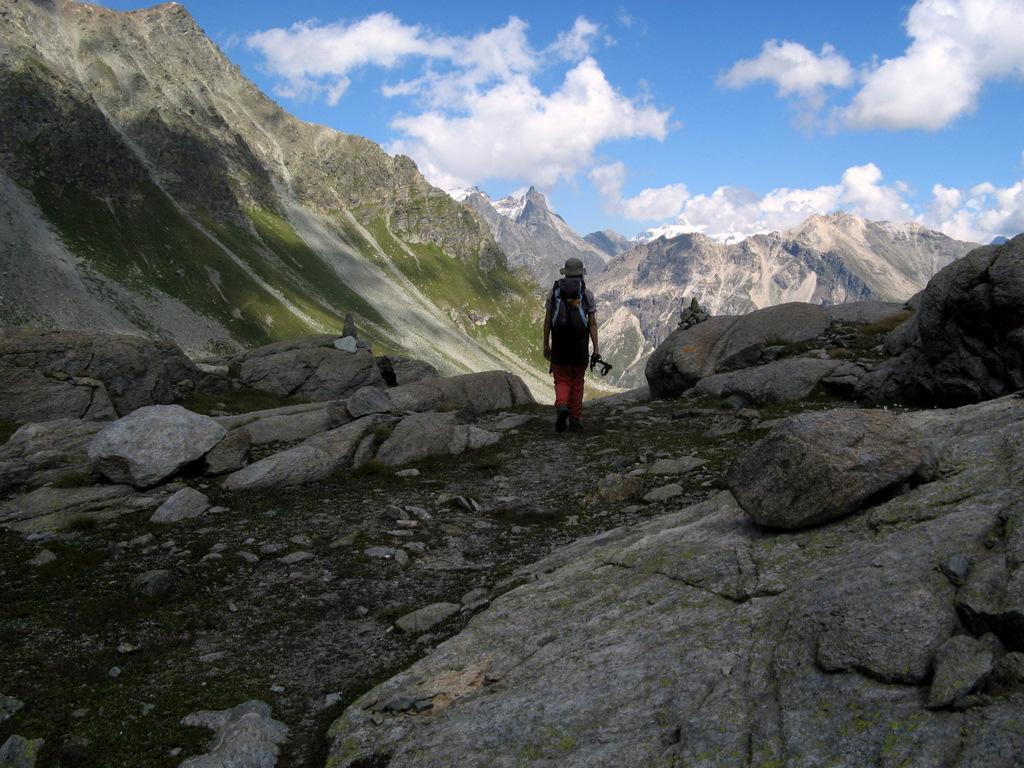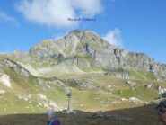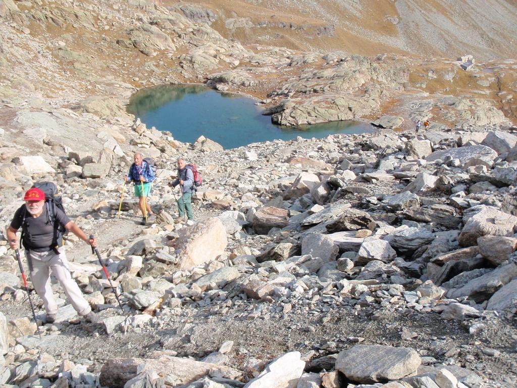 Lasciando il lago a destra, si prosegue salendo per facile sentiero la breve morena detritica, raggiungendo un pianoro con una enorme pietraia che però si attraversa rapidamente e comodamente, portandosi alla base del ripido pendio grigiastro (detriti) che adduce al colletto sovrastante. Qui la traccia diventa un po’ più ripida e faticosa, alcuni brevi passaggi risultano un po’ erosi ma si sale senza difficoltà. Raggiunta la sella a circa 2930 m, si passa sul versante sud della montagna, seguendo una comoda traccia che sfrutta un terrazzone sotto cresta. Rapidamente si arriva in un punto in cui il terrazzo si interrompe con una profonda fessura: qui occorre portarsi in cresta salendo per un facile gradone roccioso (I+).
