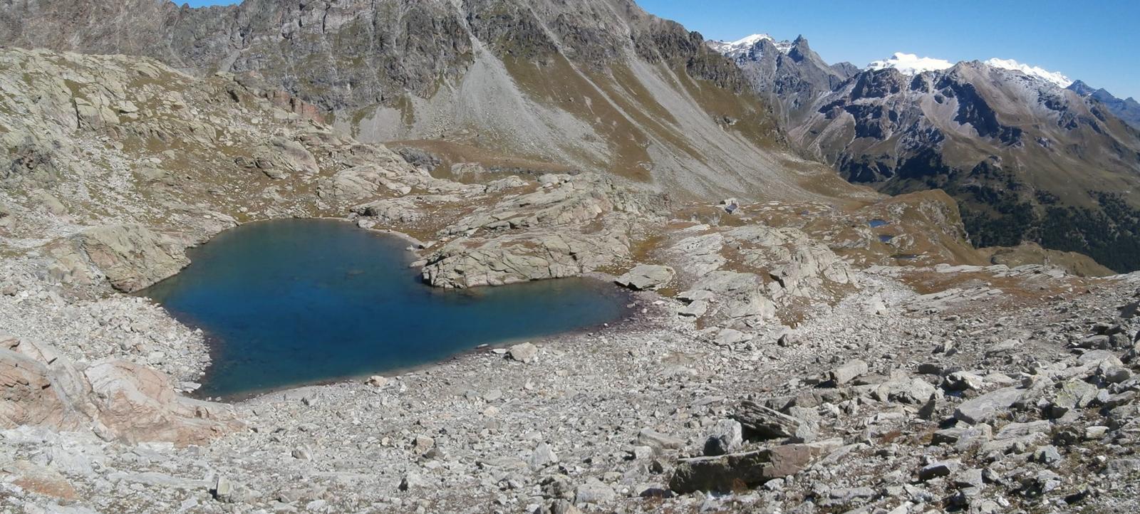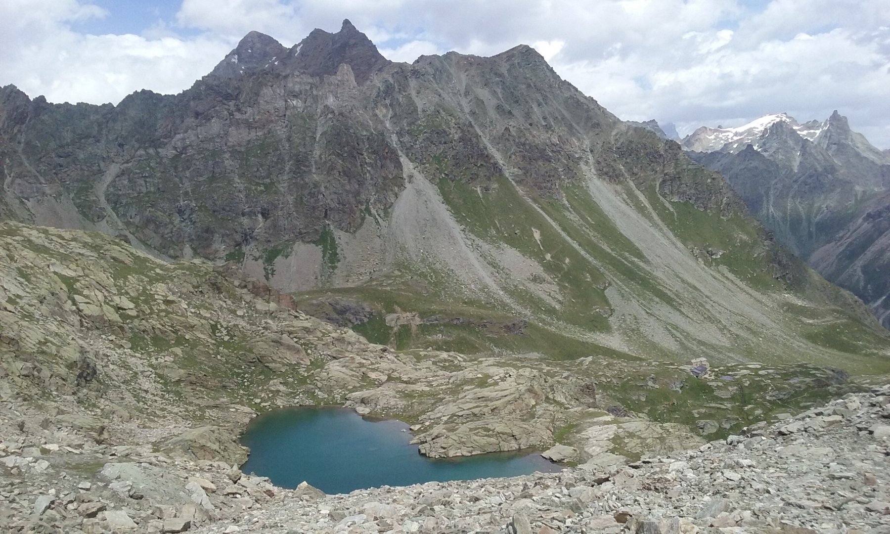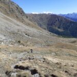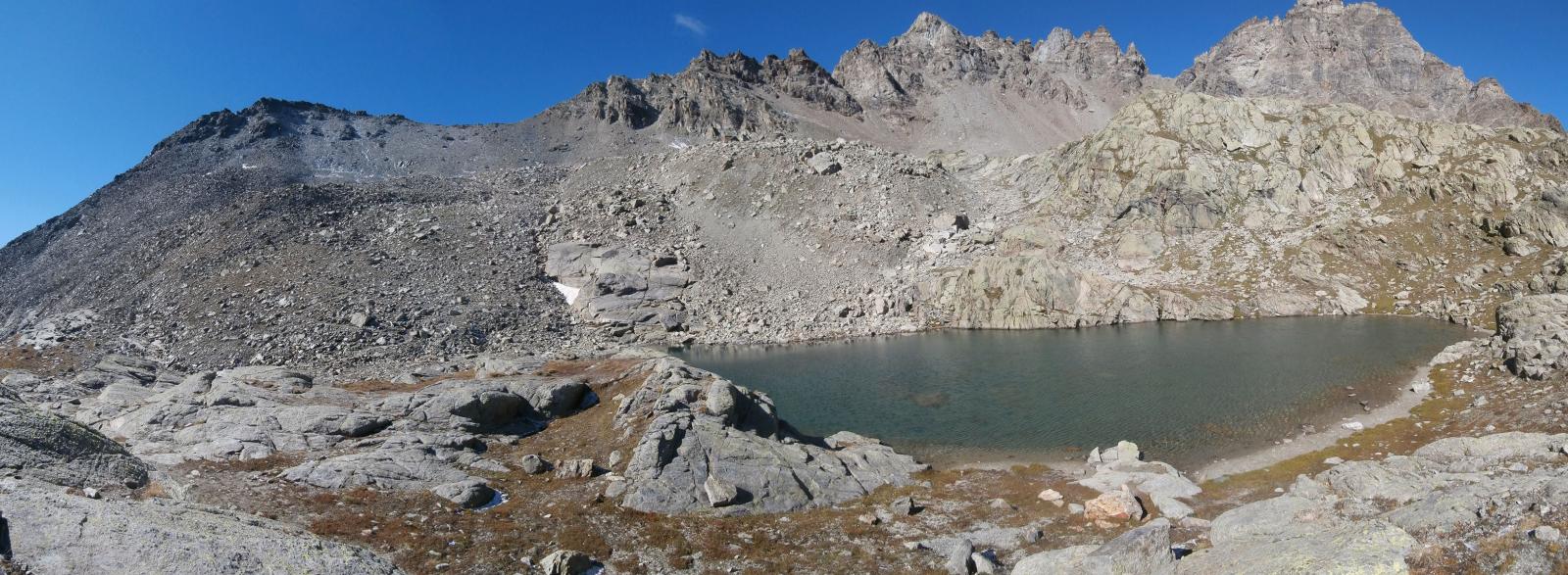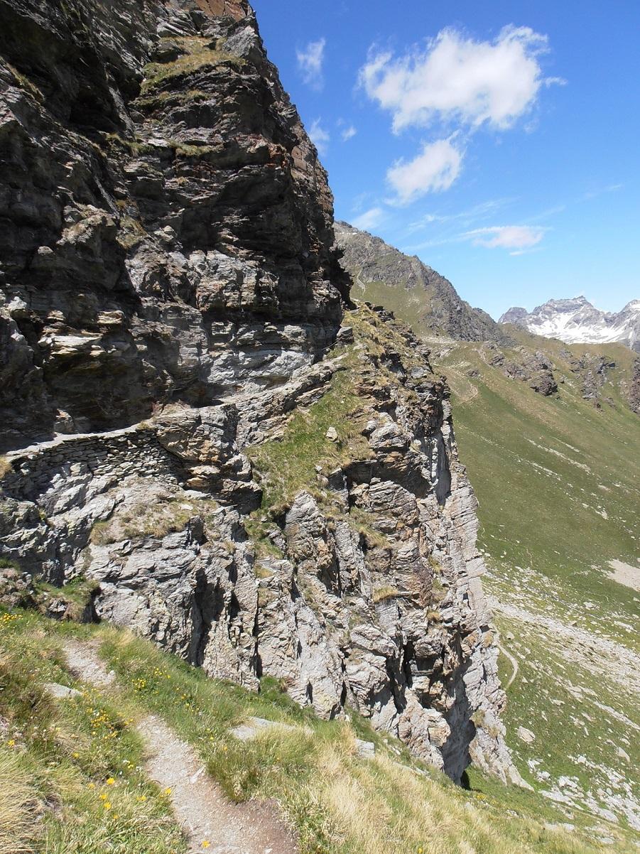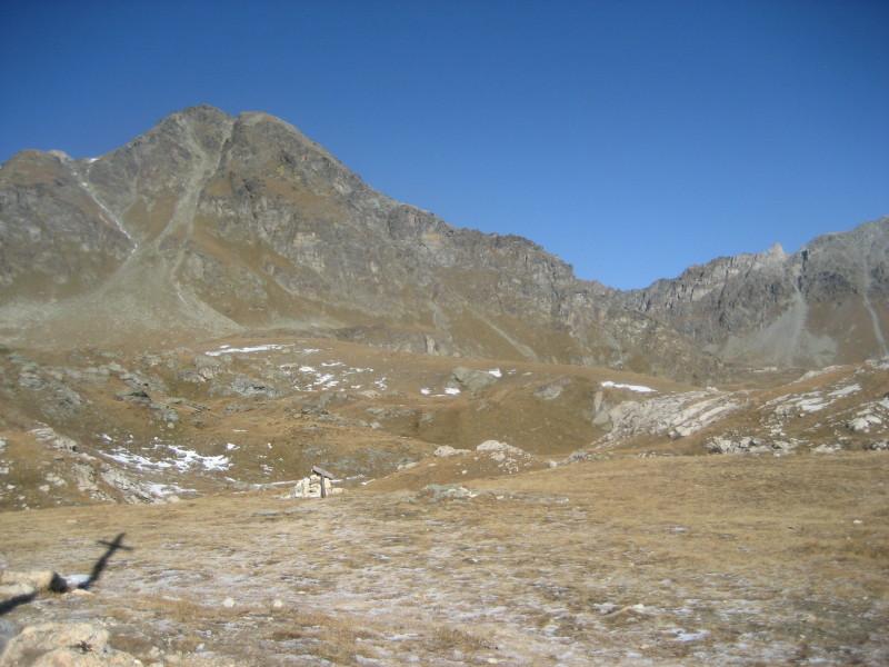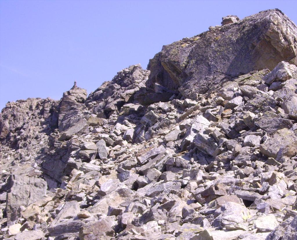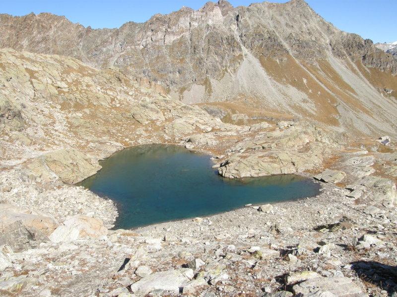 Lasciando il lago a destra, si prosegue salendo per facile sentiero la breve morena detritica, raggiungendo un pianoro con una enorme pietraia che però si attraversa rapidamente e comodamente, portandosi alla base del ripido pendio grigiastro (detriti) che adduce al colletto sovrastante. Qui la traccia diventa un po’ più ripida e faticosa, alcuni brevi passaggi risultano un po’ erosi ma si sale senza difficoltà. Raggiunta la sella a circa 2930 m, si passa sul versante sud della montagna, seguendo una comoda traccia che sfrutta un terrazzone sotto cresta. Rapidamente si arriva in un punto in cui il terrazzo si interrompe con una profonda fessura: qui occorre portarsi in cresta salendo per un facile gradone roccioso (I+).