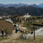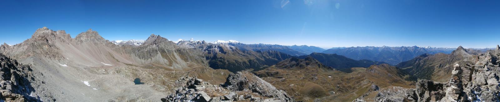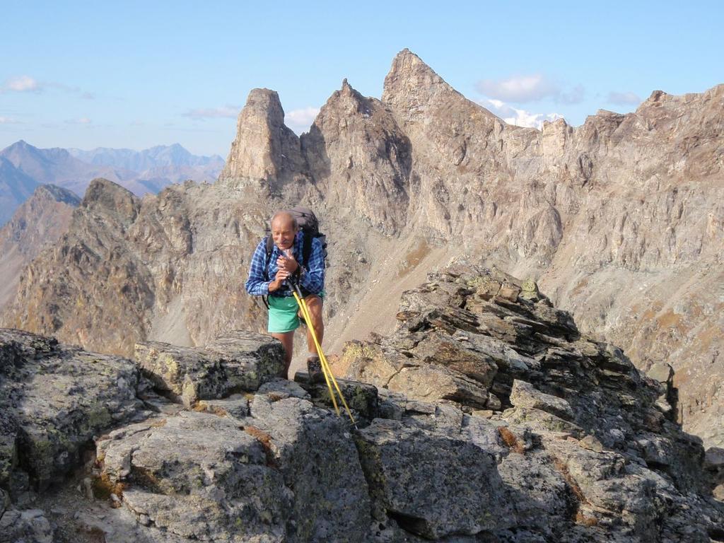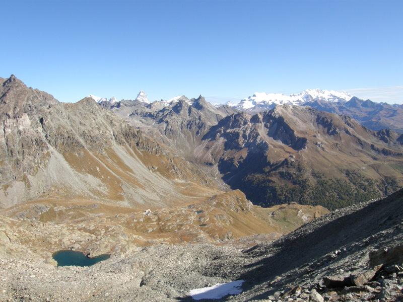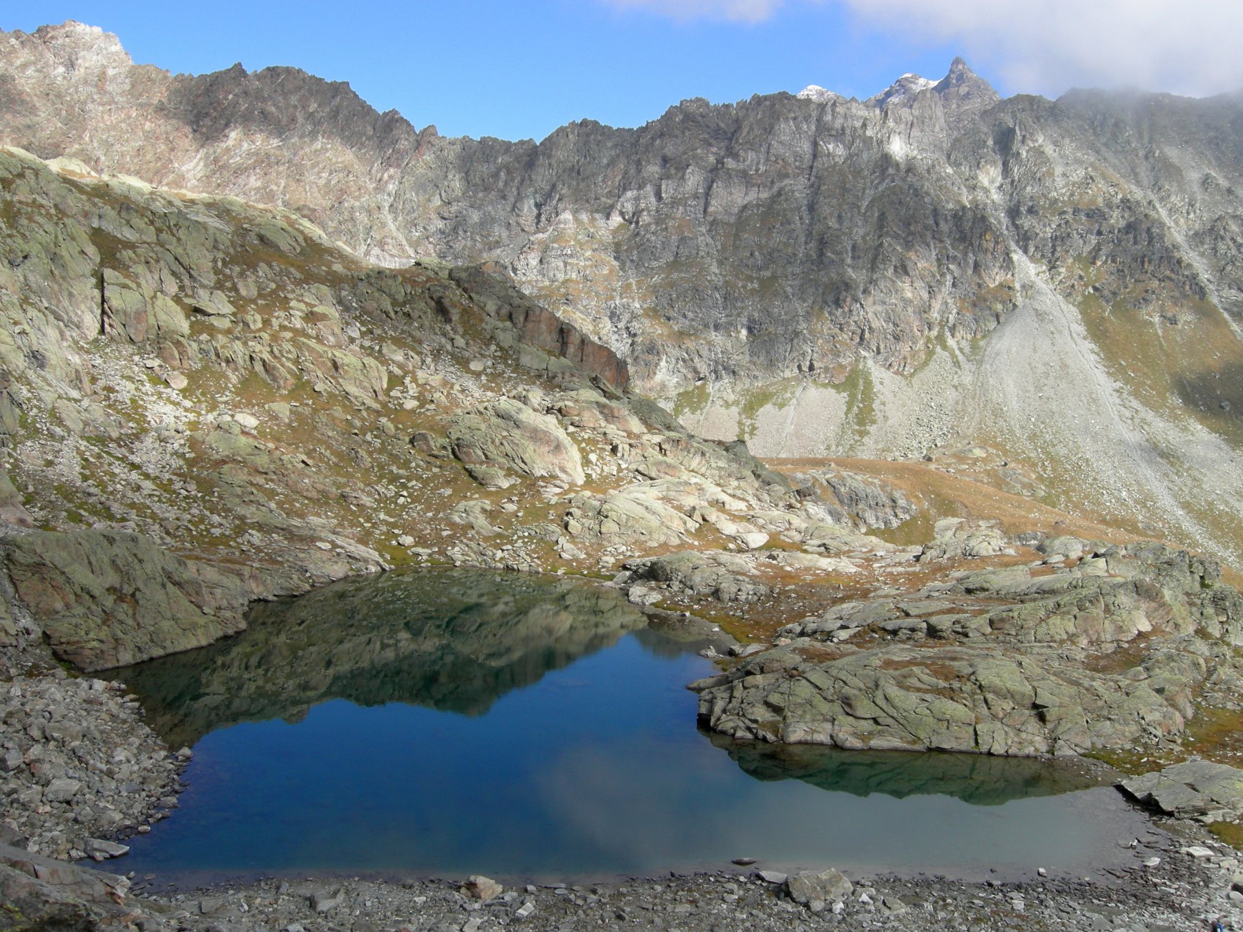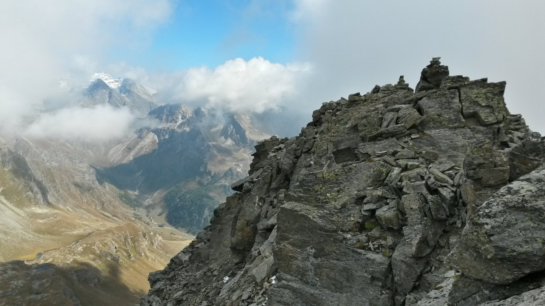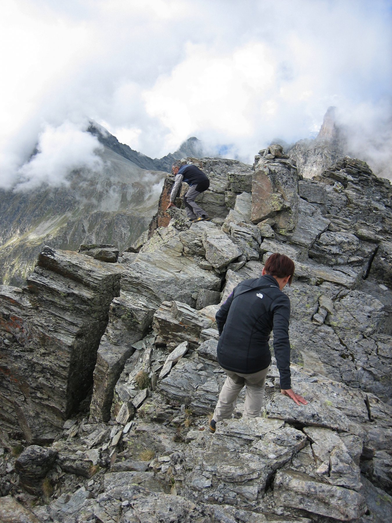 Lasciando il lago a destra, si prosegue salendo per facile sentiero la breve morena detritica, raggiungendo un pianoro con una enorme pietraia che però si attraversa rapidamente e comodamente, portandosi alla base del ripido pendio grigiastro (detriti) che adduce al colletto sovrastante. Qui la traccia diventa un po’ più ripida e faticosa, alcuni brevi passaggi risultano un po’ erosi ma si sale senza difficoltà. Raggiunta la sella a circa 2930 m, si passa sul versante sud della montagna, seguendo una comoda traccia che sfrutta un terrazzone sotto cresta. Rapidamente si arriva in un punto in cui il terrazzo si interrompe con una profonda fessura: qui occorre portarsi in cresta salendo per un facile gradone roccioso (I+).