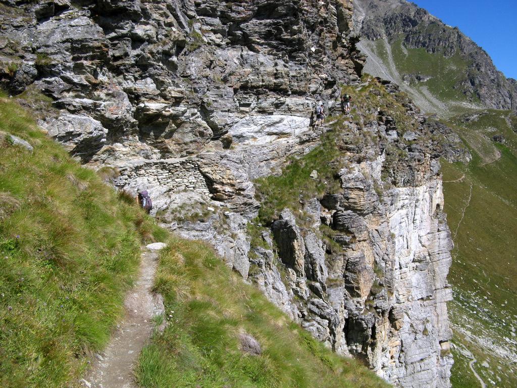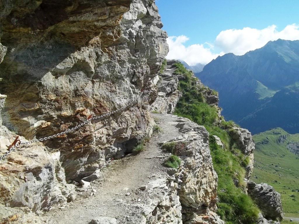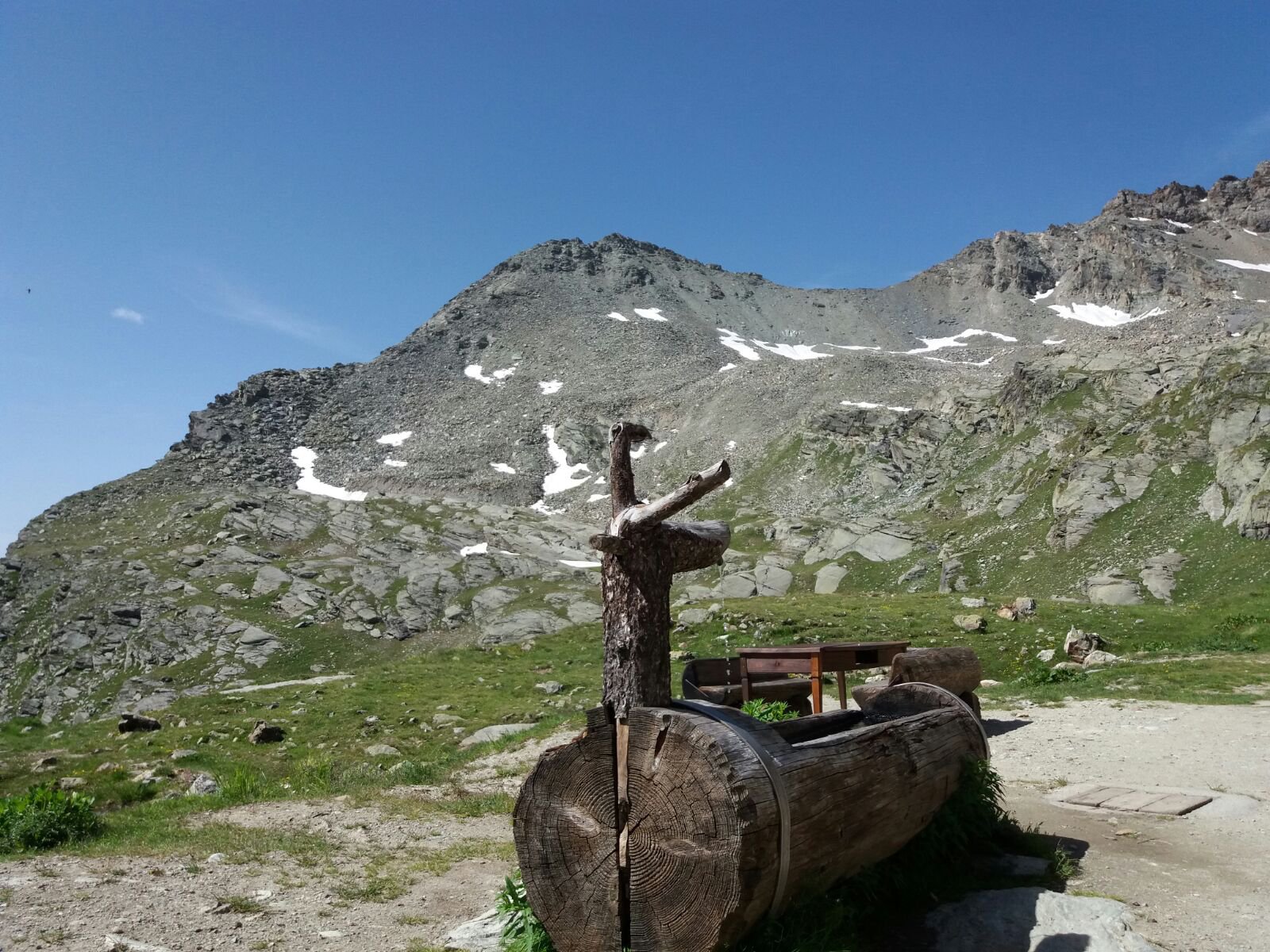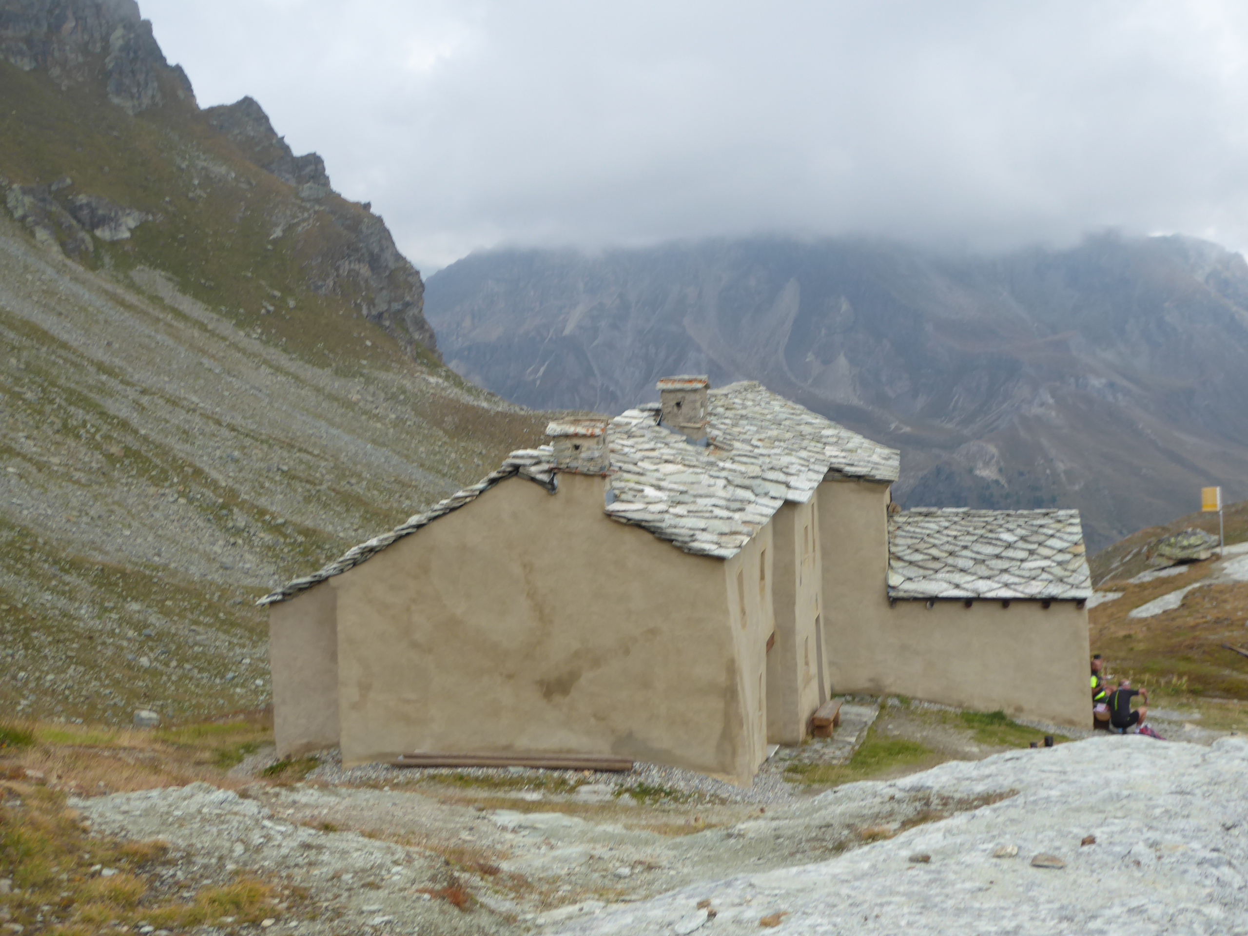 Si prosegue in leggera discesa, ignorando il sentiero che si stacca alla sinistra per il Col de Chaléby e, più sotto dopo aver attraversato alcuni ruscelli/sorgenti, si raggiunge una biforcazione: restando alti sulla sinistra si segue il sentiero del Passet, che un po’ più diretto, attraversa una serie di paretine rocciose esposte con tratti attrezzati da catene. Altrimenti si prosegue sul sentiero leggermente più basso, quello ufficiale, che passa al di sotto di queste pareti e con una lieve discesa, riprende poi a salire sul costone opposto, per terrazzi di erba che ospitano alcuni minuscoli laghetti arrivando in breve al Rifugio Cunéy 2656 m, con a fianco il bellissimo santuario.