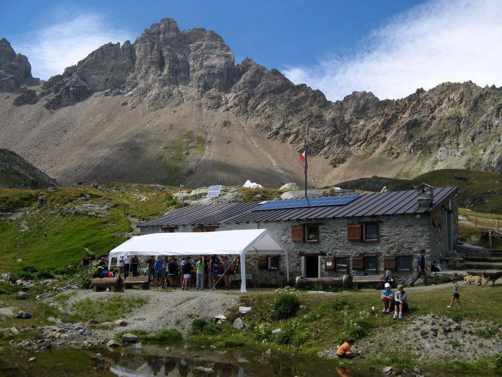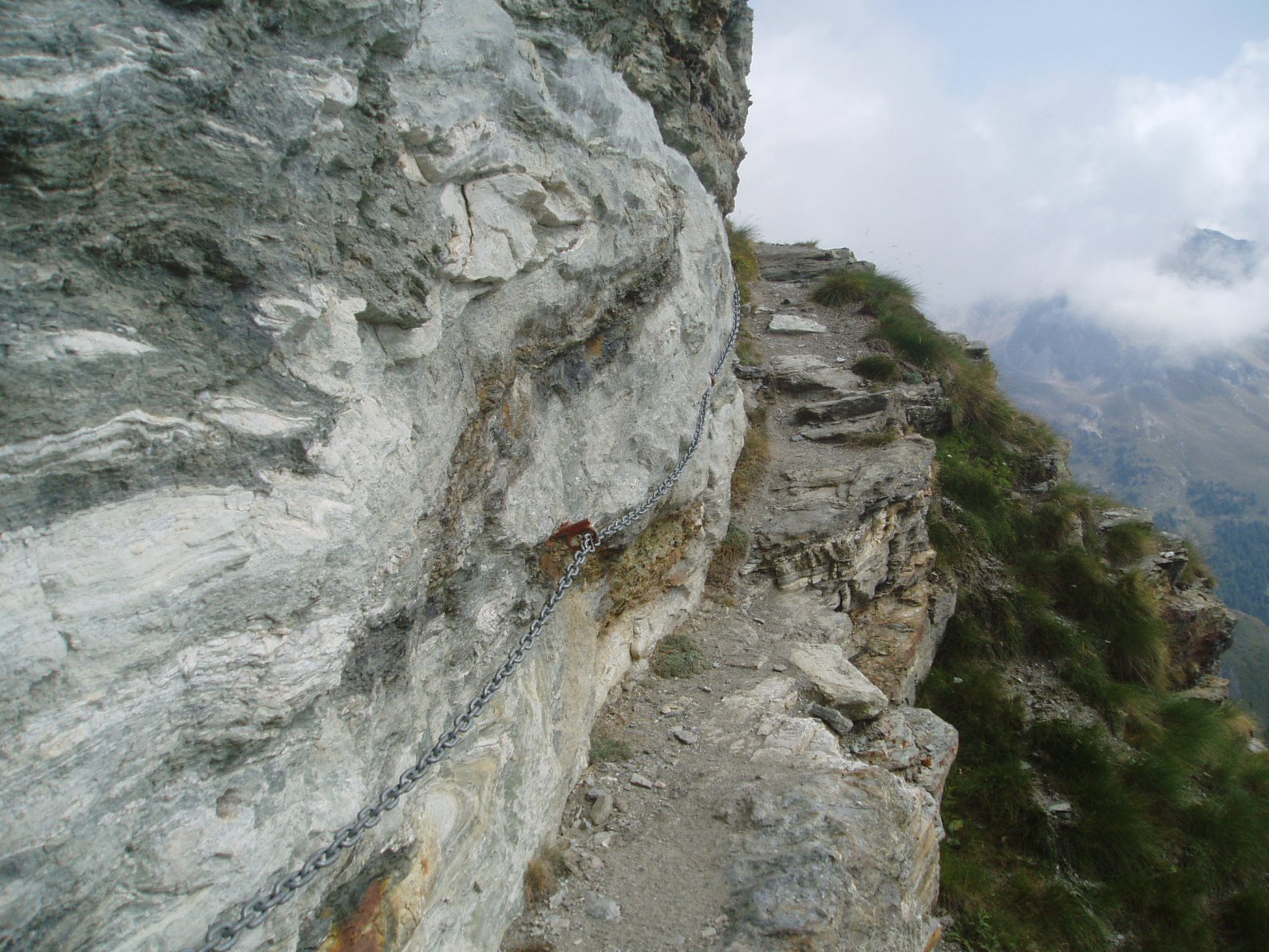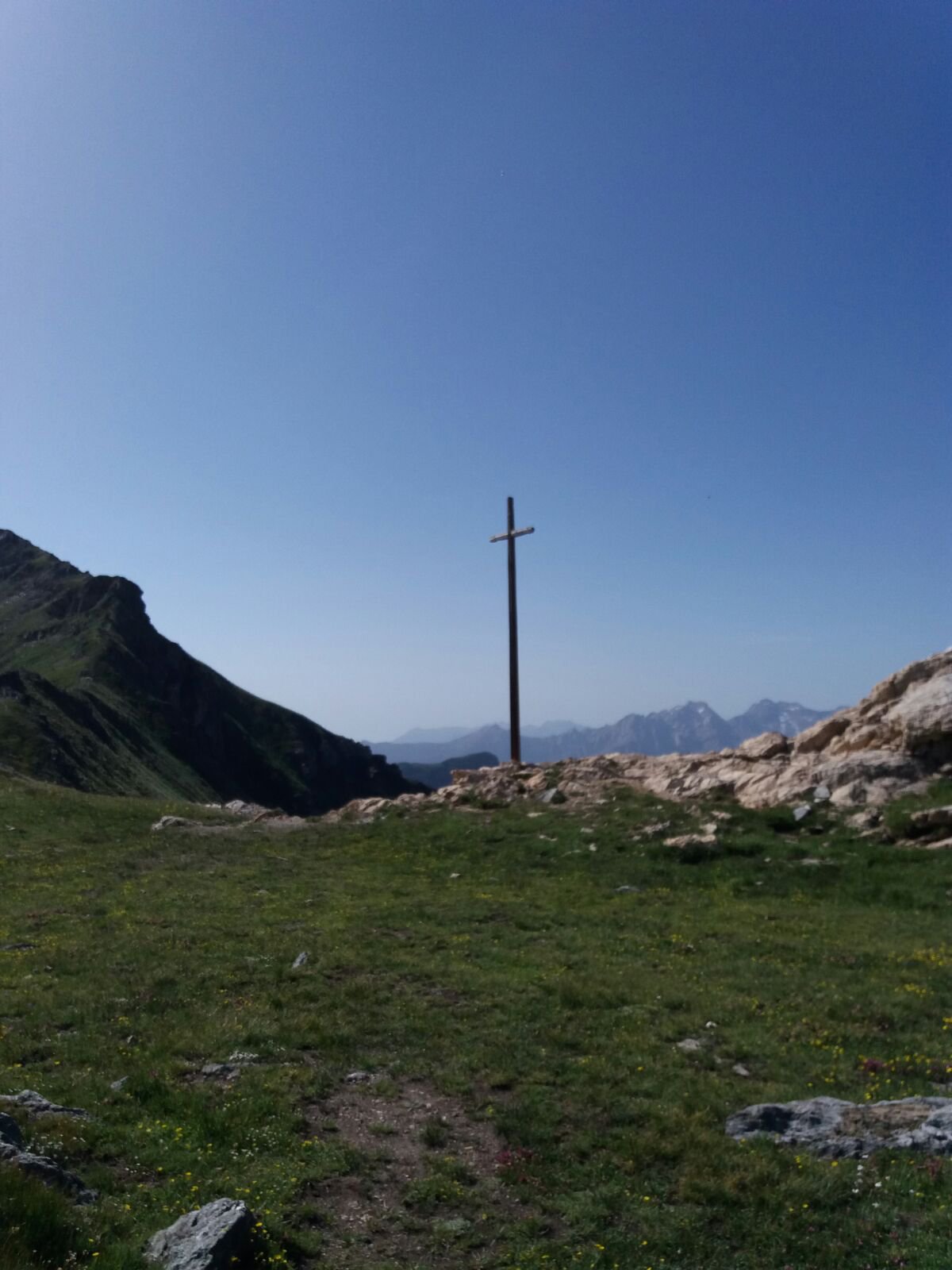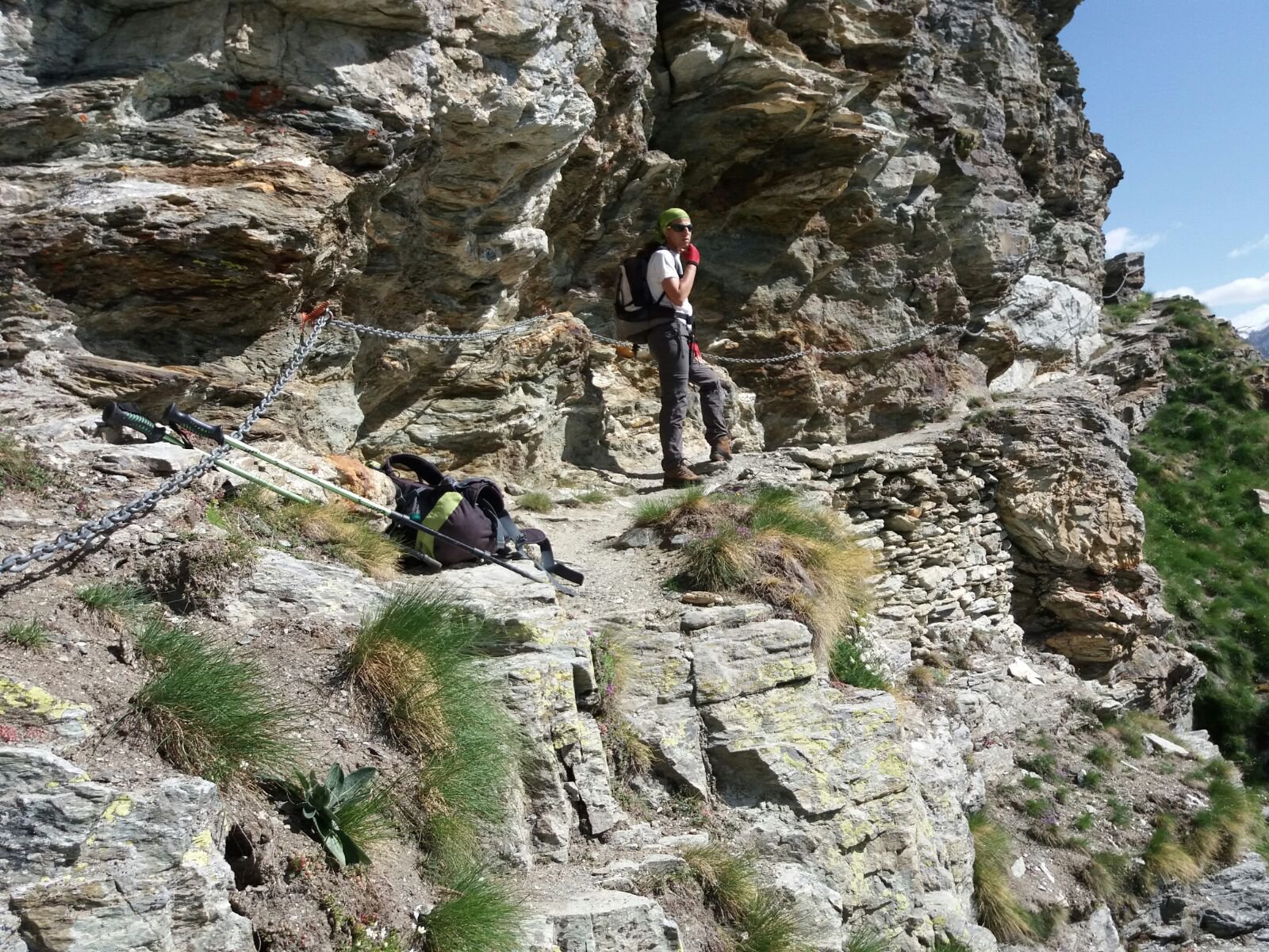 Si prosegue in leggera discesa, ignorando il sentiero che si stacca alla sinistra per il Col de Chaléby e, più sotto dopo aver attraversato alcuni ruscelli/sorgenti, si raggiunge una biforcazione: restando alti sulla sinistra si segue il sentiero del Passet, che un po’ più diretto, attraversa una serie di paretine rocciose esposte con tratti attrezzati da catene. Altrimenti si prosegue sul sentiero leggermente più basso, quello ufficiale, che passa al di sotto di queste pareti e con una lieve discesa, riprende poi a salire sul costone opposto, per terrazzi di erba che ospitano alcuni minuscoli laghetti arrivando in breve al Rifugio Cunéy 2656 m, con a fianco il bellissimo santuario.