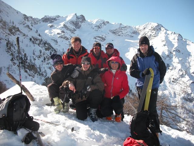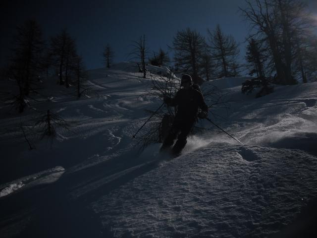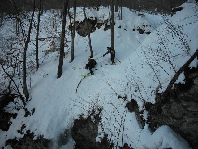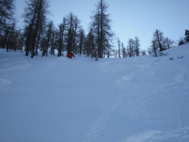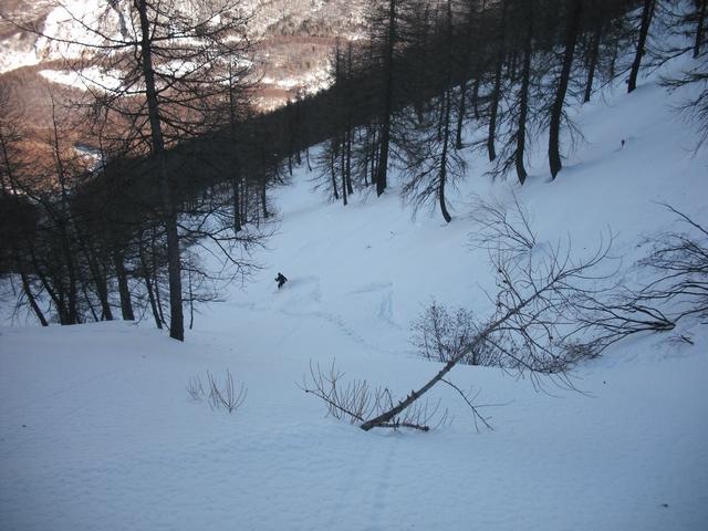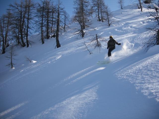 Discesa nel canalone che scende diretto su Bergemoletto risparmiato da quelli scesi ieri. In cima altri due che volevano fare la Gorgia Cagna ed hanno seguito la traccia sbagliata.