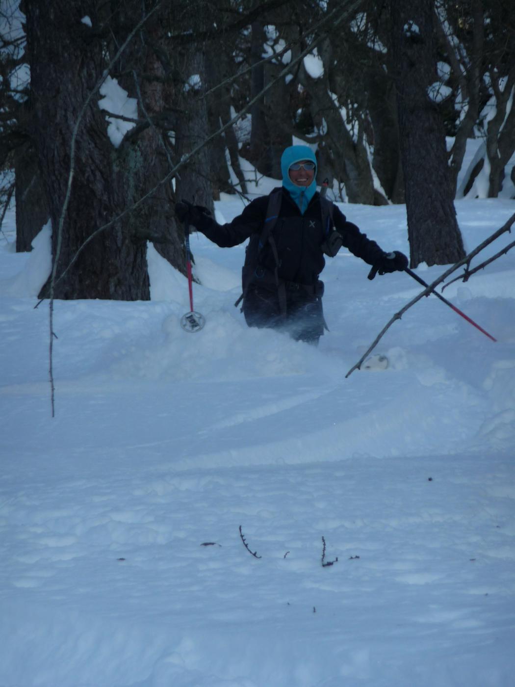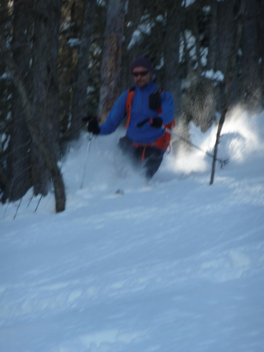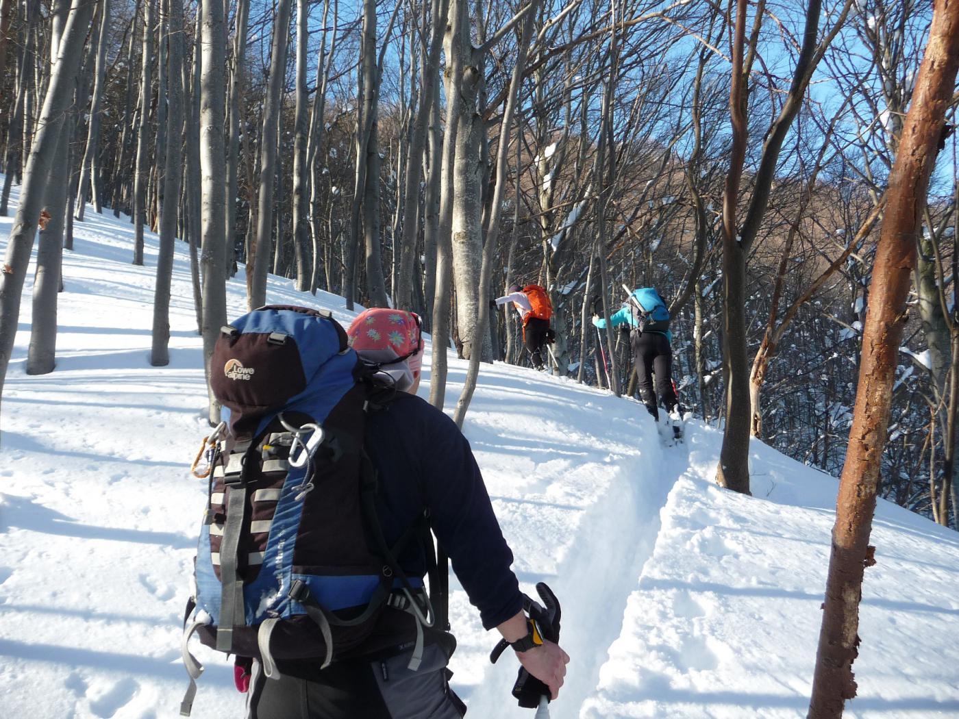 Saliti direttamente da fondovalle con buona traccia di moto da slitta fino a Moja poi tutta da tracciare. In alto oltre un metro di neve fresca quindi dovuta attenzione. Discesa su bella polvere con effetto slalom nel bosco fitto.