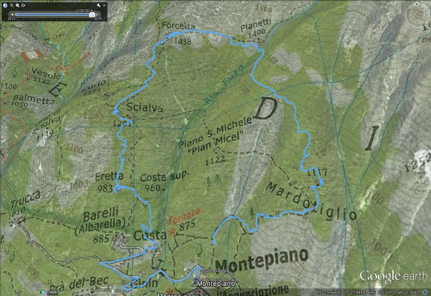 Da questo è già visibile l’alpe Forcetta 1438 m che si raggiunge seguendo con qualche acrobazia la vecchia mulattiera invasa dai noccioli e da rovi. Dall’alpe Forcetta ancora a sx dove si trovano i segni rossi del sentiero che da Baretti sale al Monte Arzola, si scende seguendo con attenzione i segni a Scialva 1201 m e poi a sx si raggiunge il bosco di faggi da qui direttamente alla strada asfaltata tra la frazioni Barelli e Costa.
