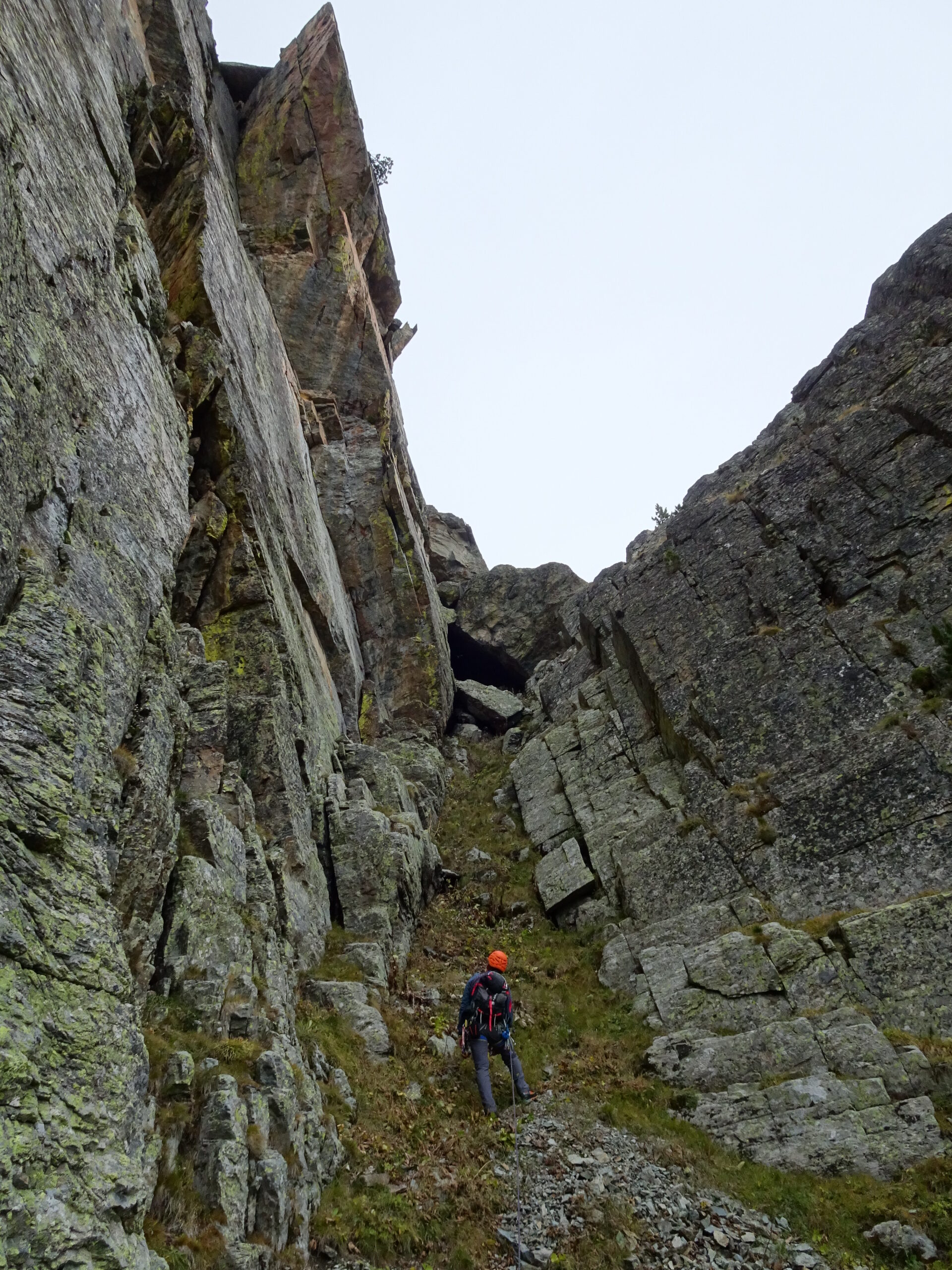 Proseguire ora nel camino che qui si fa canale erboso-detritico facile, con qualche facile saltino (II). Il canale in alto piega debolmente a dx e infine va a morire sotto a dei massi ciclopici accatastati, che formano un grande tetto (che si supera salendo le facili placche sulla dx). Risalire le paretine esposte a sud dei massi (II, un passo di III) e quindi proseguire nell’evidente canale-camino di dx.