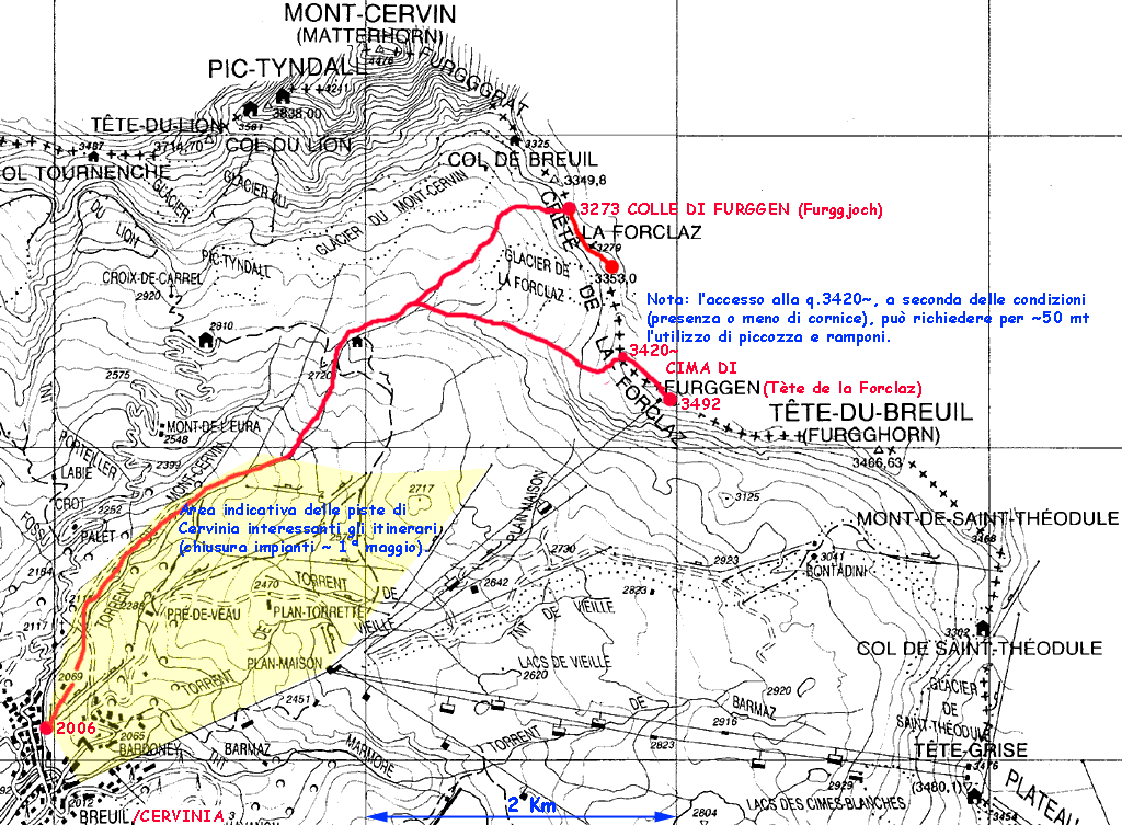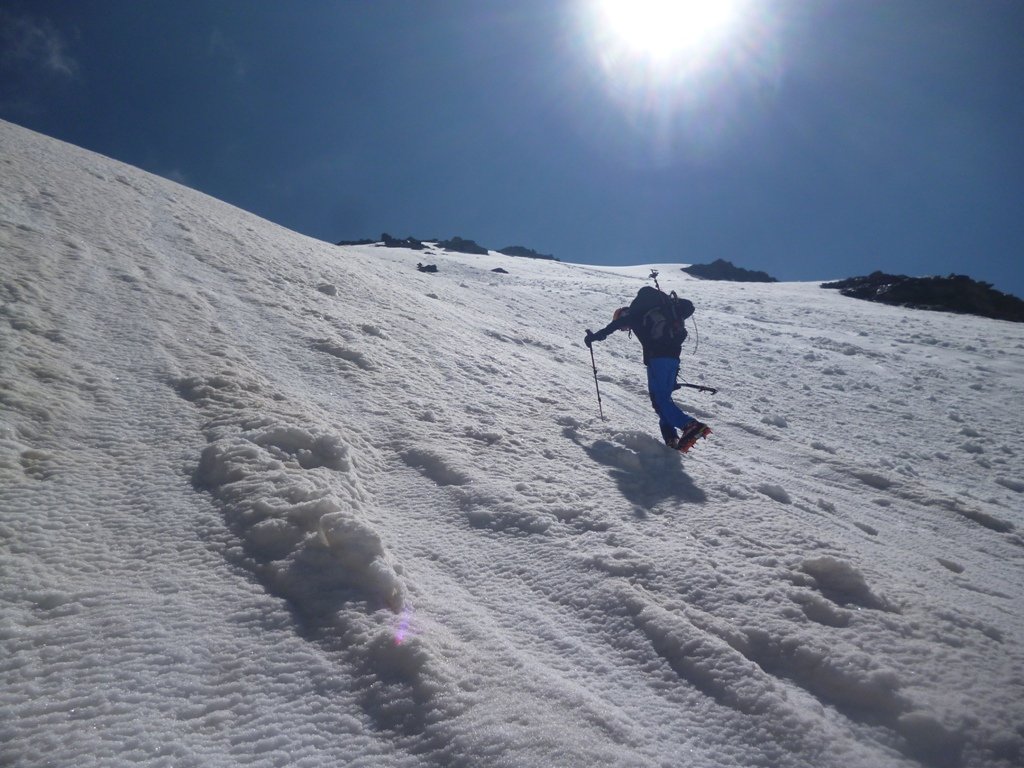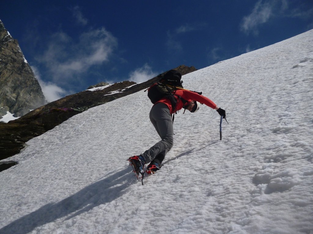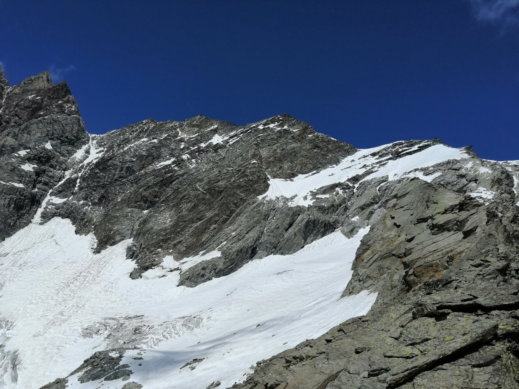 Da qui attraversando pietrame, nevai ed il ridotto ghiacciaio della Forca si punta all’evidente colle di Furggen che si raggiunge su pendii decisamente più ripidi. Dal colle voltare e destra e proseguire in direzione Sud fin sulla cima della nostra montagna, dapprima quasi in piano e poi per un ultimo ripido tratto.