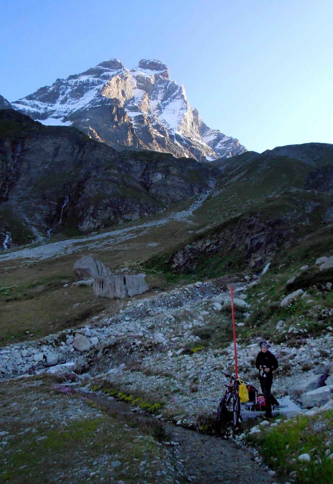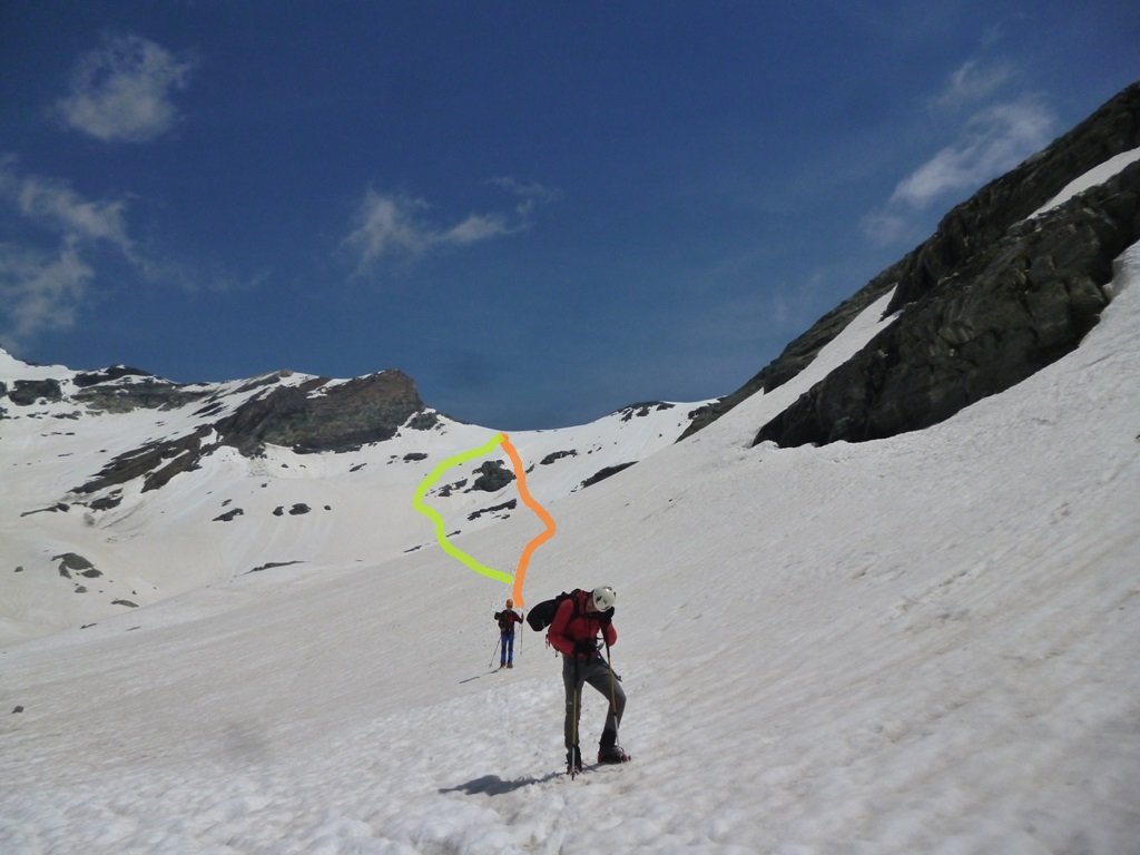 Si prosegue stando sempre alti sopra al fondo del vallone dove scorre il torrente Cervino, fino ad andare a raggiungere l’evidente morena laterale sinistra del ghiacciaio della Forca. Seguirne il filo sull’evidente traccia che la sormonta fin almeno sui 2800 metri.