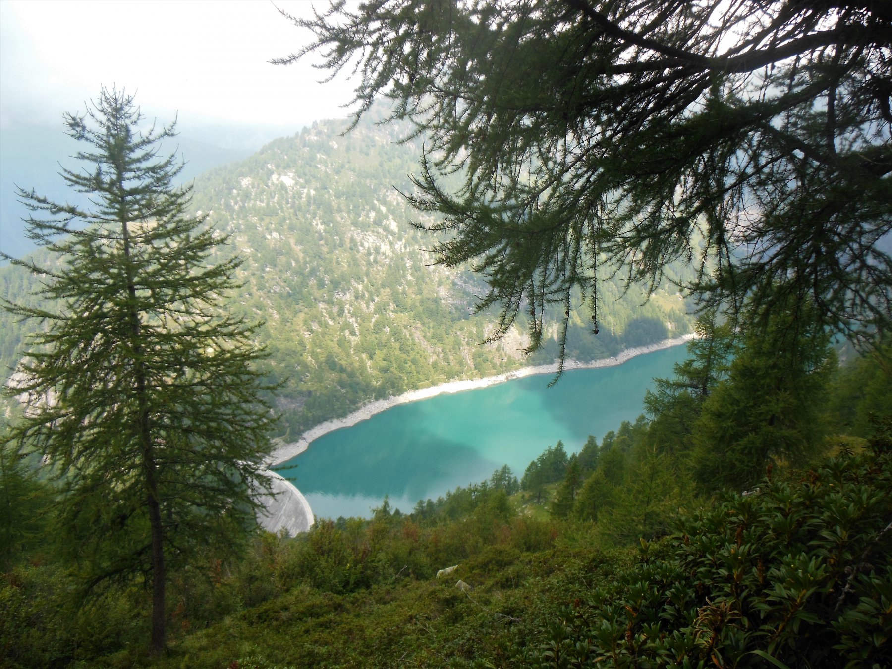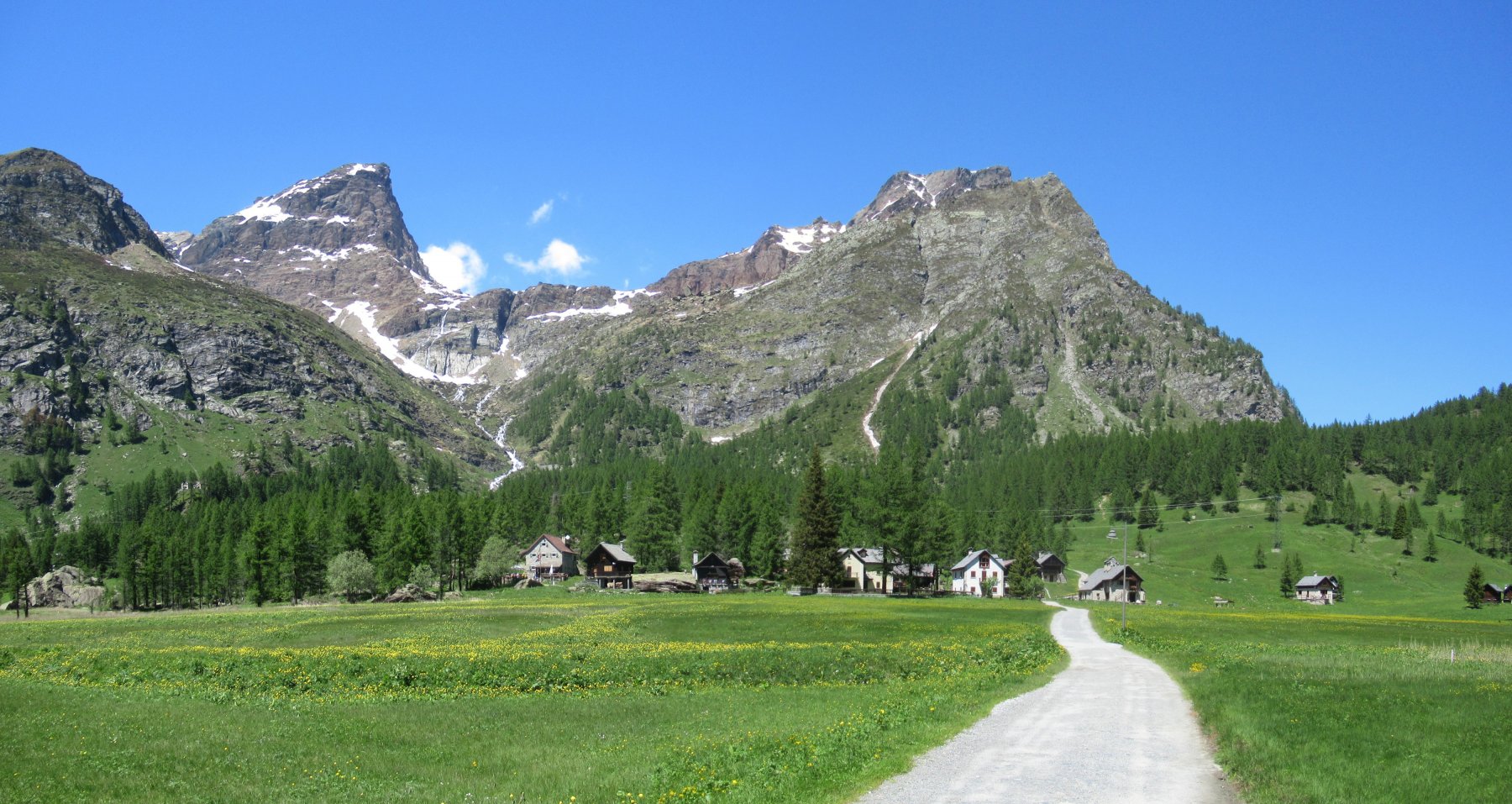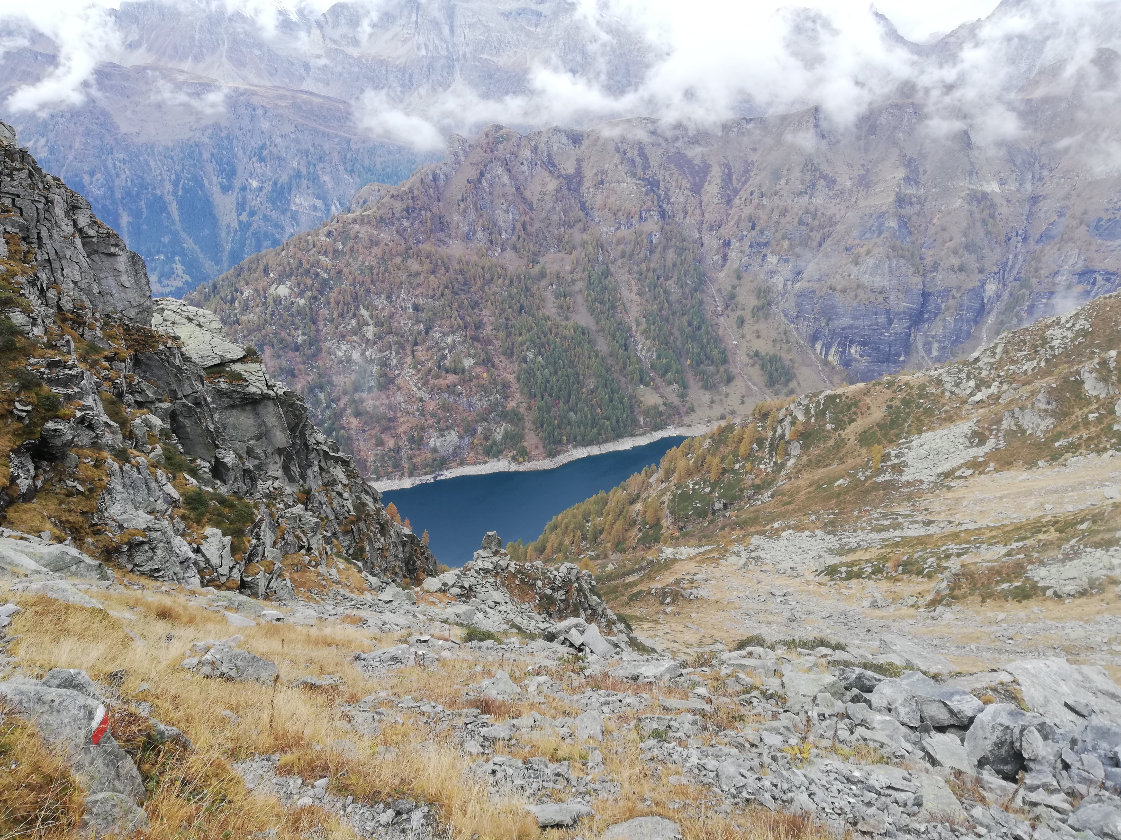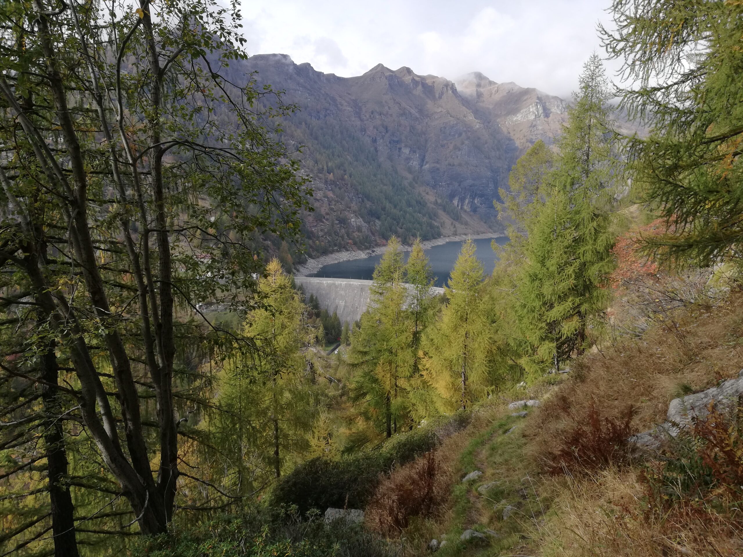 Presso la piazzola di parcheggio, un po’ a destra, reperire il sentiero, segnalato in bianco-rosso ma poco visibile, che con pochi tornanti conduce al canale di scarico della diga. Lo si attraversa su una passerella in cemento e si prosegue verso destra. Il sentiero, poco visibile e causa della vegetazione ma ben segnalato in bianco-rosso, supera un torrentello (vecchia corda fissa), e con alcuni saliscendi porta all’alpe Suzzo alto (mt.1667). E’ presente una palina con cartelli indicatori, ma la nostra direzione non è segnalata. Occorre reperire, presso la palina stessa, una traccia che sale verso il lariceto, ritornando nella direzione di Agaro (in pratica si fa un tornante presso la palina). Il sentiero, ora più evidente, entra nel bosco. Dopo qualche minuto si incontra un sentiero poco evidente che si stacca a destra per l’Alpe Puntolo (cartello di legno su un larice poco visibile). Lo si ignora, e si prosegue dritto in direzione dell’Alpe Vargnana, le cui baite sono da qui già visibili in alto su di un costone di fronte a noi.