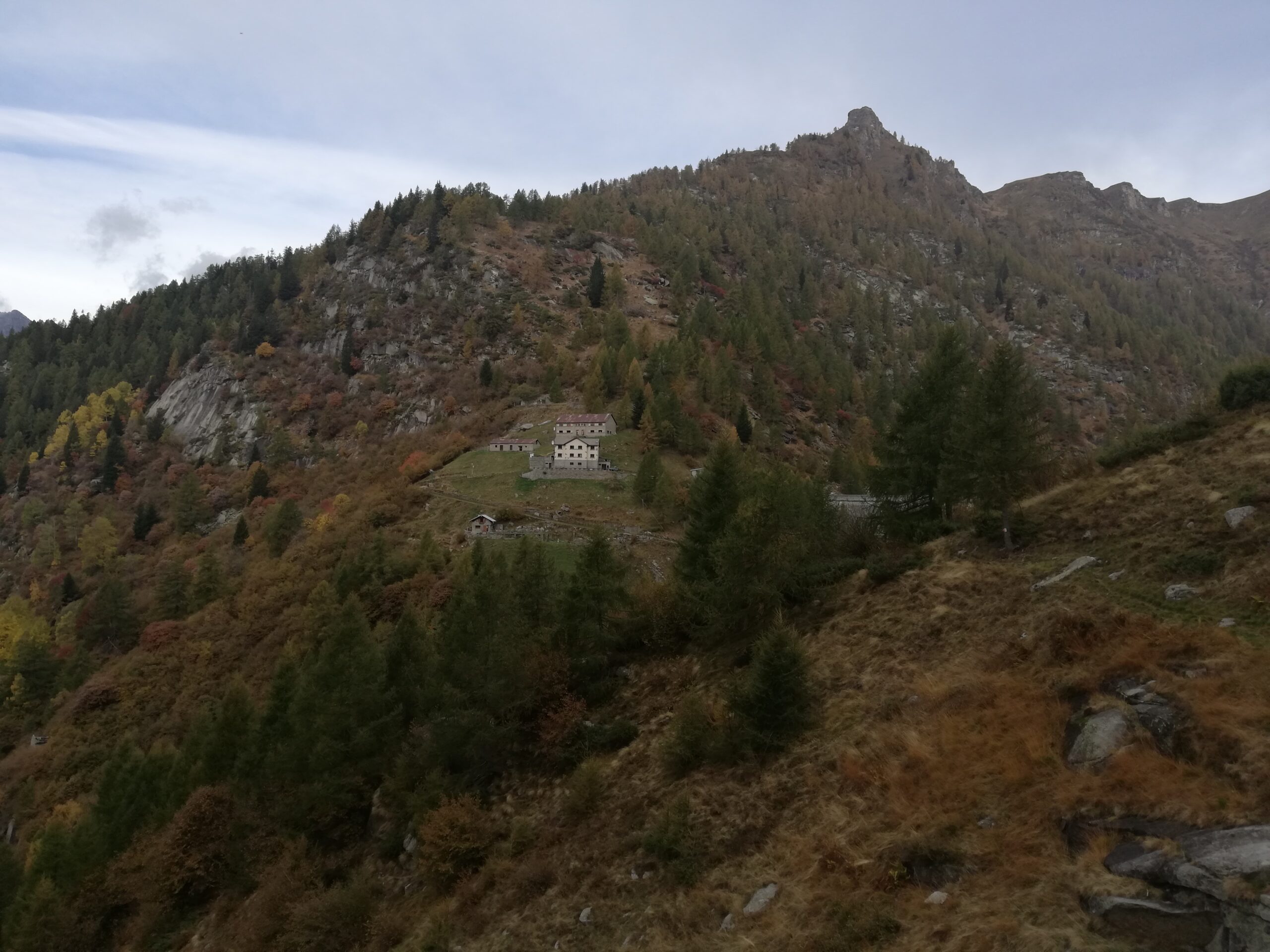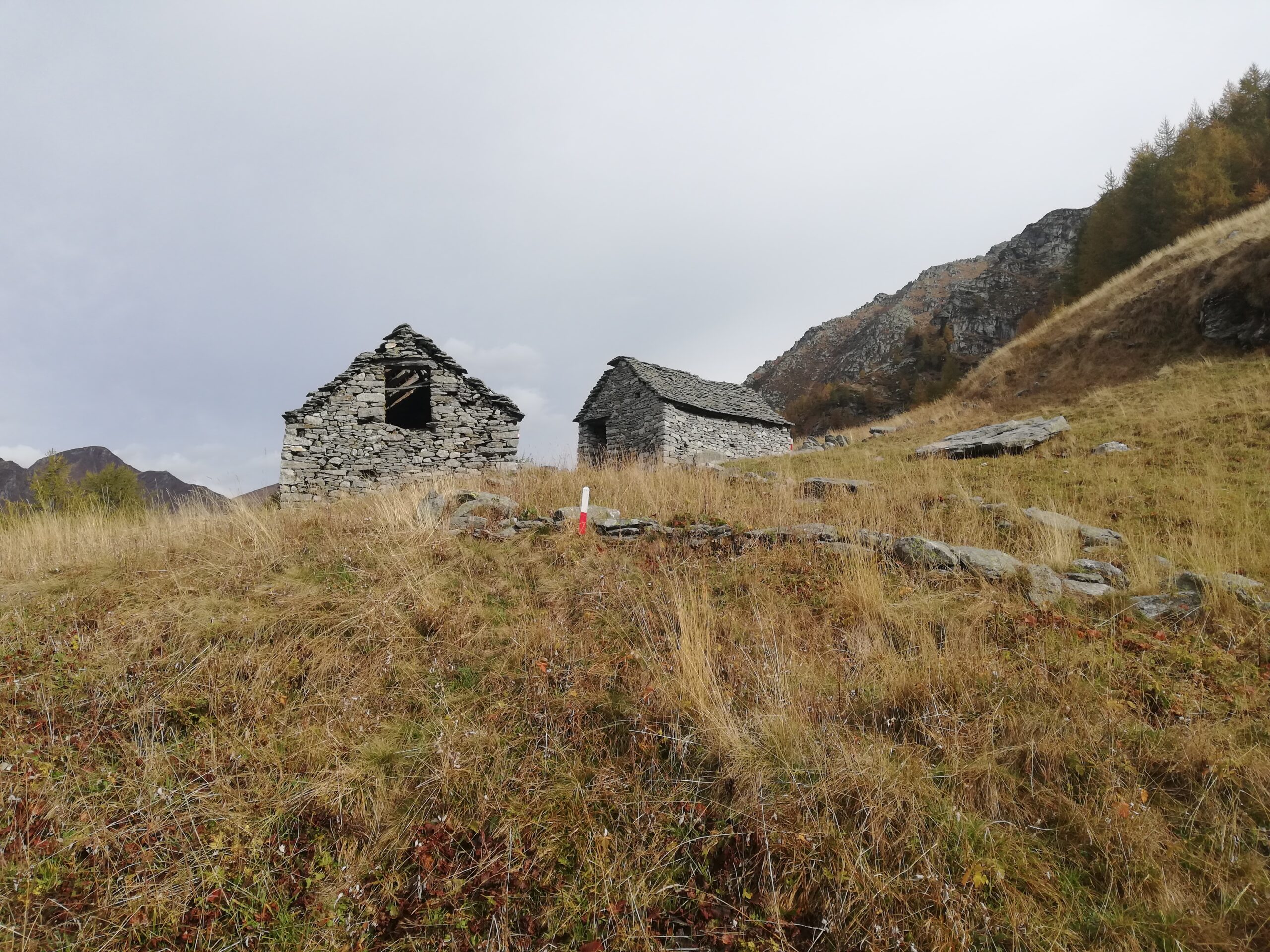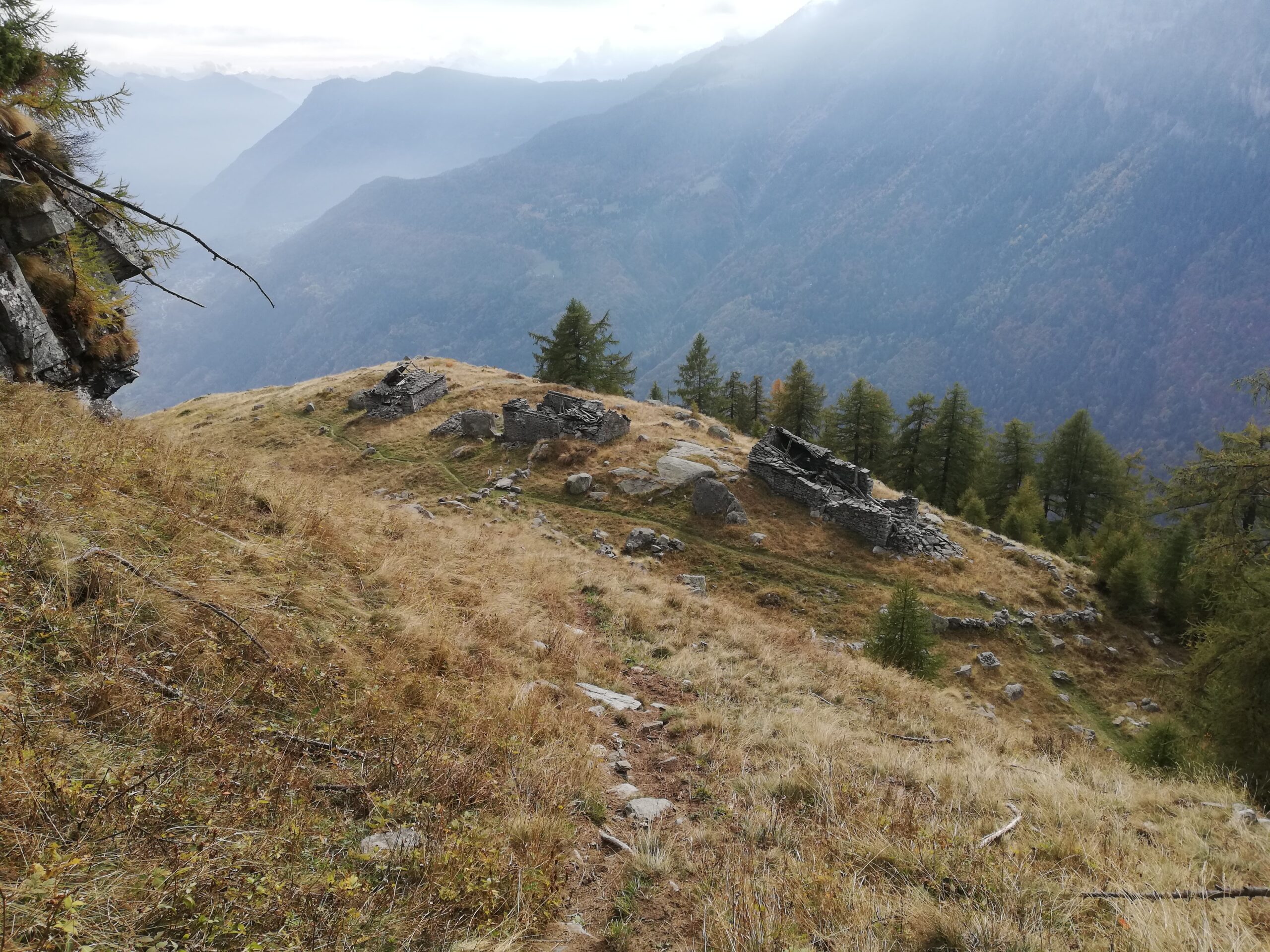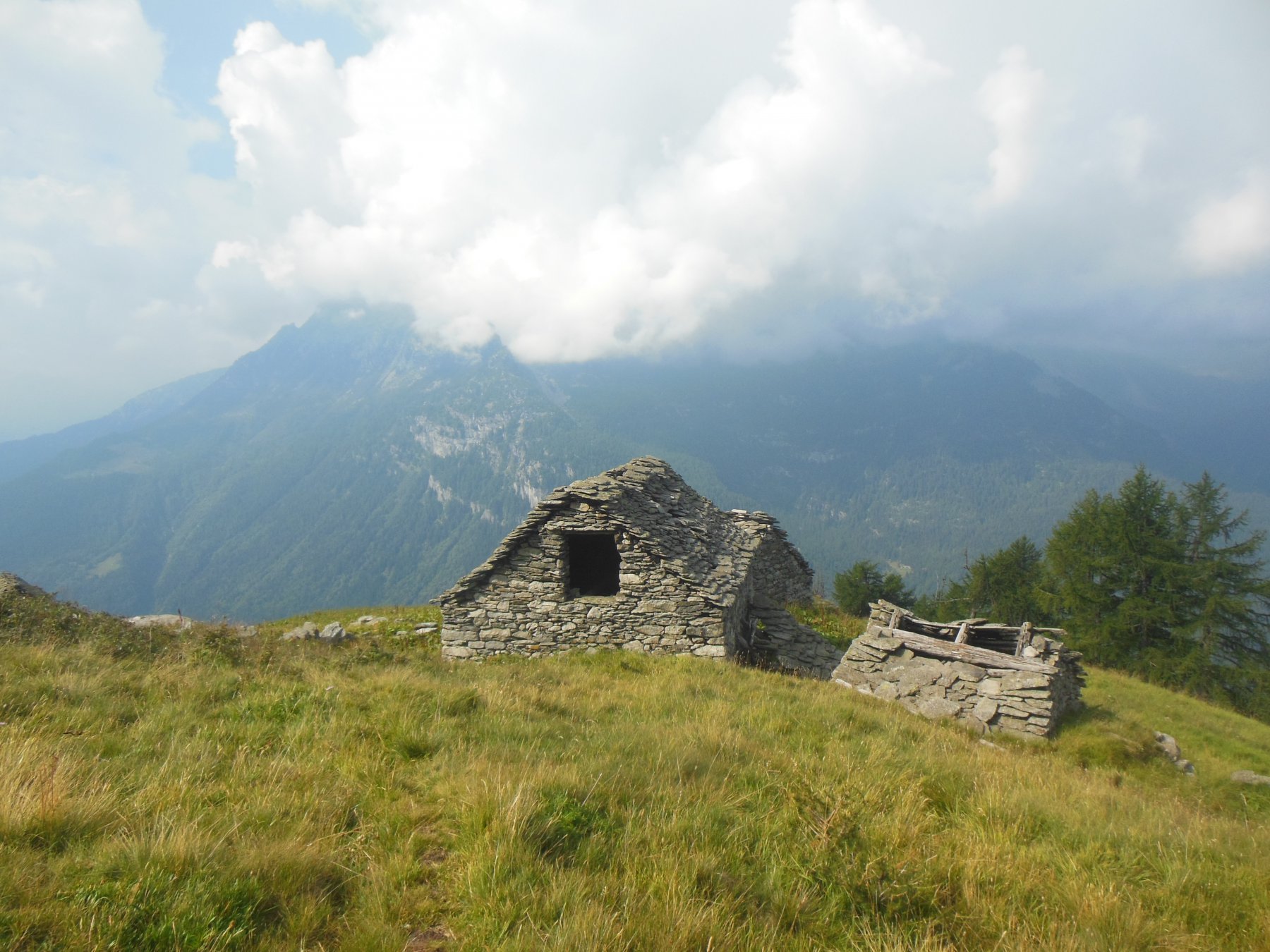 La traccia, infida a causa della vegetazione che la nasconde, conduce a guadare un ruscello con cascatella. Oltrepassatolo, la traccia scompare quasi del tutto, ma si riesce ad indovinare il percorso che, tra erba e roccette conduce alla soprastante Alpe Vargnana (mt. 1891). Si passa a sinistra del primo gruppo di due baite, mentre il secondo gruppo di due baite si passa sulla destra. A questo punto occorre ignorare una traccia poco evidente che sale verso destra, che conduce fuori percorso sotto le pendici della Loccia dei Robbi. Occorre invece reperire una traccia, ancora meno evidente, che prosegue dritto, con pendenza modesta. La traccia, fortemente ostacolata dalla vegetazione, conduce ad oltrepassare un ruscello. Si risale sull’altra sponda a guadagnare un ripido prato (in basso a sinistra rimasugli di costruzioni). Occorre svoltare decisamente a destra, fare alcuni tornantini nel prato (la traccia è qui praticamente del tutto assente), e guadagnare il costone appena sovrastante nei pressi della quota 2043. Tale punto è individuabile grazie alla presenza, poco al di sotto della quota stessa, di un larice secco (è l’unico presente) già visibile da quando si passa il ruscello, e che può essere utilizzato come riferimento nel caso si perda del tutto la traccia. La quota 2043 altro non è che un piccolo pianoro prativo, con dei rimasugli di un ometto in pietra. Qui la guida CAI-TCI (l’unica fonte disponibile che descriva la gita) dice di proseguire per il costone. Si tratta di una indicazione palesemente ERRATA, il costone è in gran parte roccioso, per nulla invitante e del tutto impercorribile.