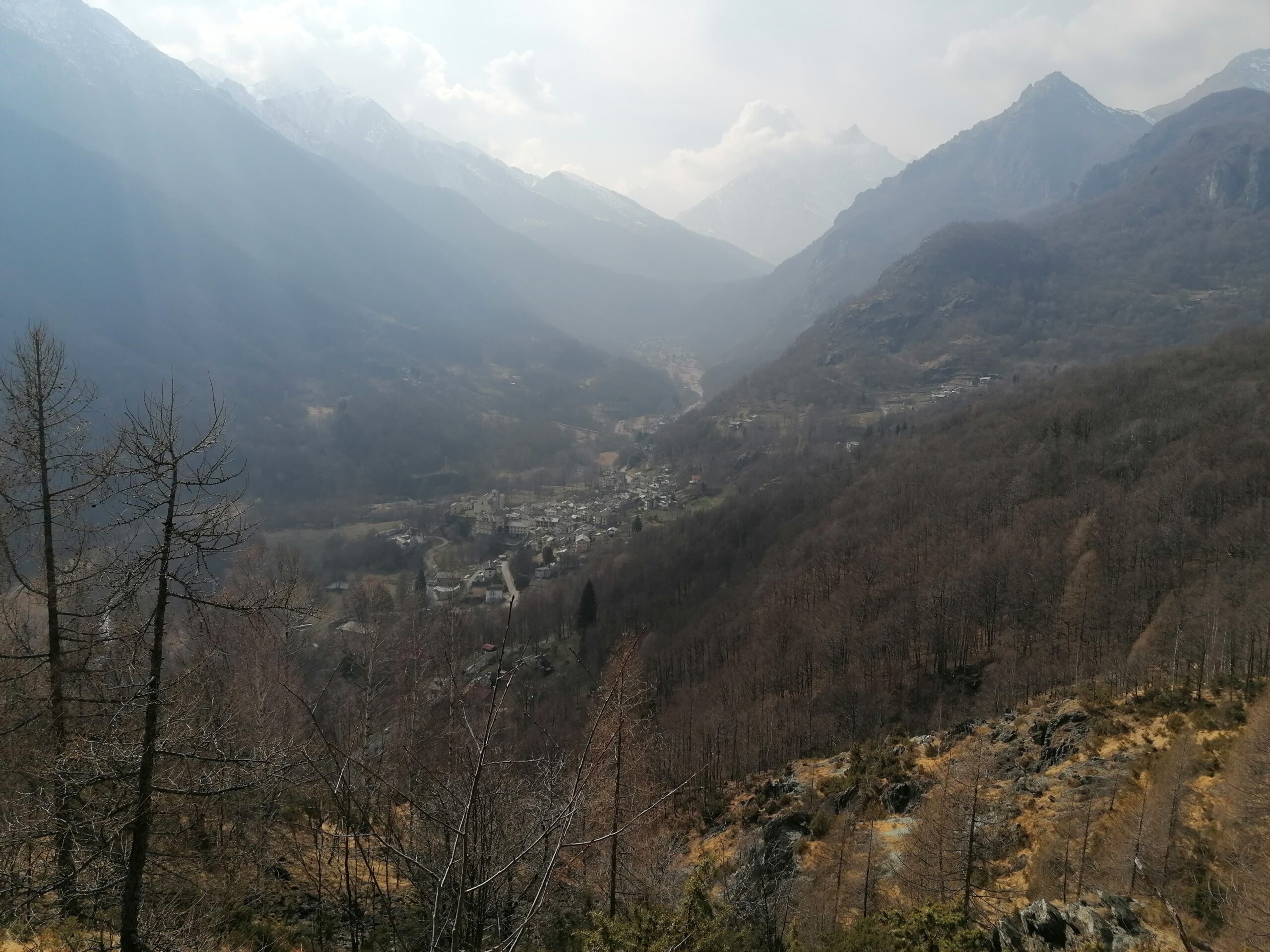 Il sentiero si inerpica deciso nei boschi, raggiungendo numerosi gruppi di baite : Saùna, Tinetta, Colletto e infine Parneri 1181 m da cui in un paio di minuti si raggiunge un pilone votivo con uno splendido panorama sulla vallata (libro di vetta).