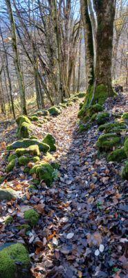 Da lì scendere sulla provinciale fino al ponte. Attraversare il bellissimo ponte di pietra del 1477, ed imboccare il sentierino che sale ripido verso destra. Il sentiero compie alcune svolte nel bosco prendendo quota, quindi giunti a ridosso di alcune torrette rocciose, piega definitivamente verso est.