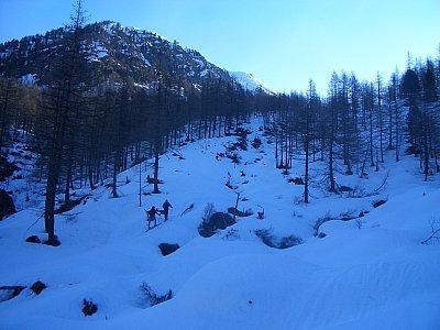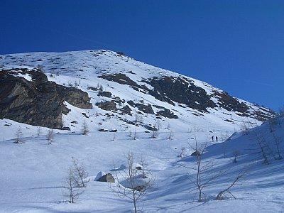 Salire sulla strada per il Giulian; dopo il ponte, seguire l’ indicazione sulla sinistra; prima nel bosco(rado) poi allo scoperto, risalire due serie di salite + falsopiani. Arrivare alla conca dei 13 laghi(coperti da neve) e proseguire sulle dorsali a sinistra, verso il fondovalle. Si arriva alla cresta finale a sinistra della “porta di Cialancia”, e poi in vetta. Utili coltelli/rampant per traversi frequenti, abbastanza ripidi.