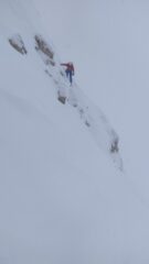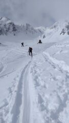 Neve dal parcheggio. Una decina di macchine in totale. In tanti oggi erano diretti al col Fourchon. Ho visto due persone tracciare verso il col St Rhemy e altri due verso la Lessache. È uscito uno “sputo” di Sole e ho preferito girare verso il Fourchon per godermelo… è durato poco: è scesa la nuova e ha iniziato a nevischiare. Neve migliore verso la Lessache dove prende meno sole. Il canale è ben riempito ma la crosta la fa da padrona. Nel conoide occhio a qualche pietra.