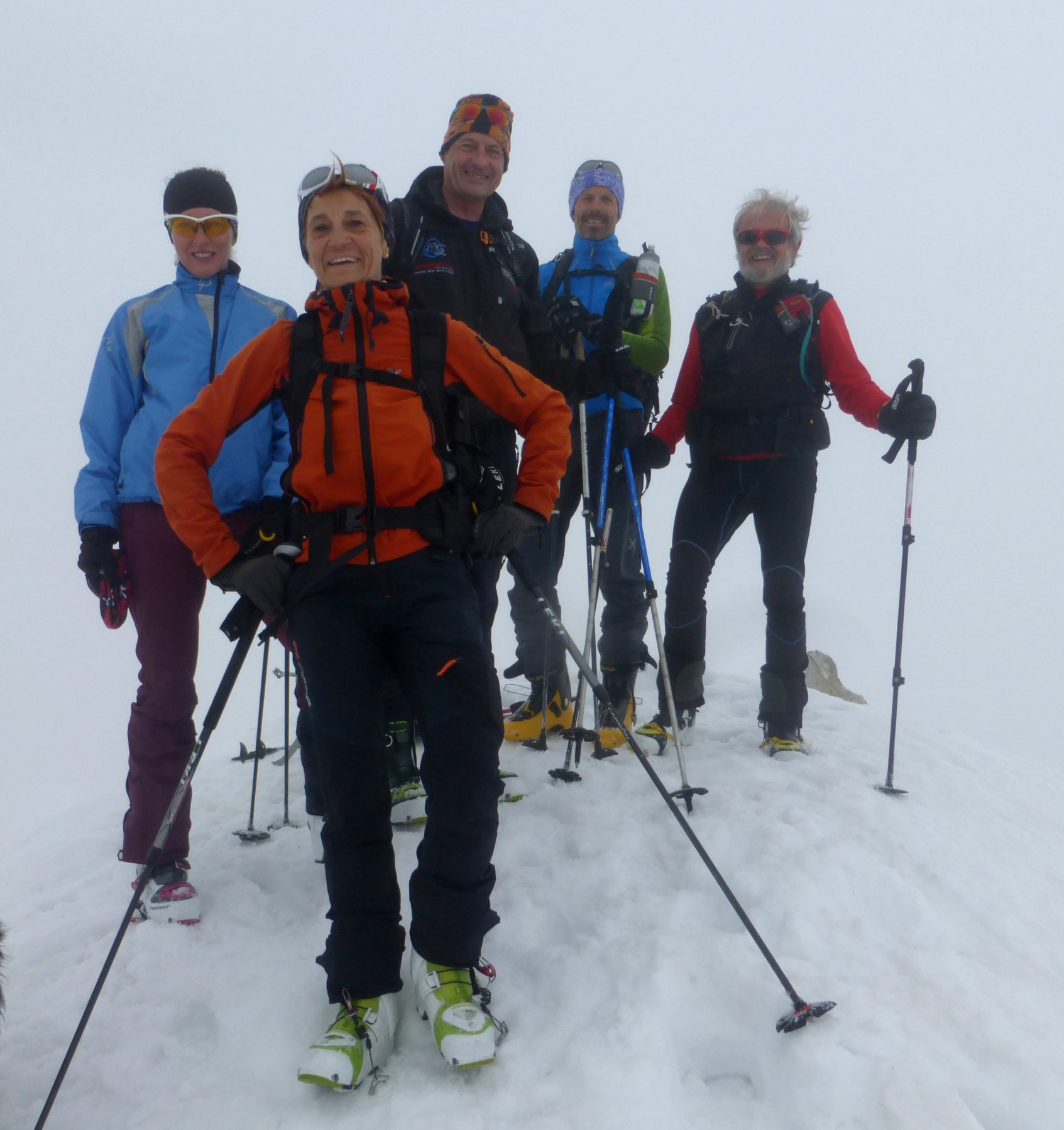 partiti presto, ma senza alcun rigelo, polenta già al mattino, alle 9 in cima , rinunciato al Pain de Sucre perchè sia le nuvole che la neve non erano invitanti, comunque bella gita con gli amici e qualche bella risata insieme riempiono lo stesso la giornata .