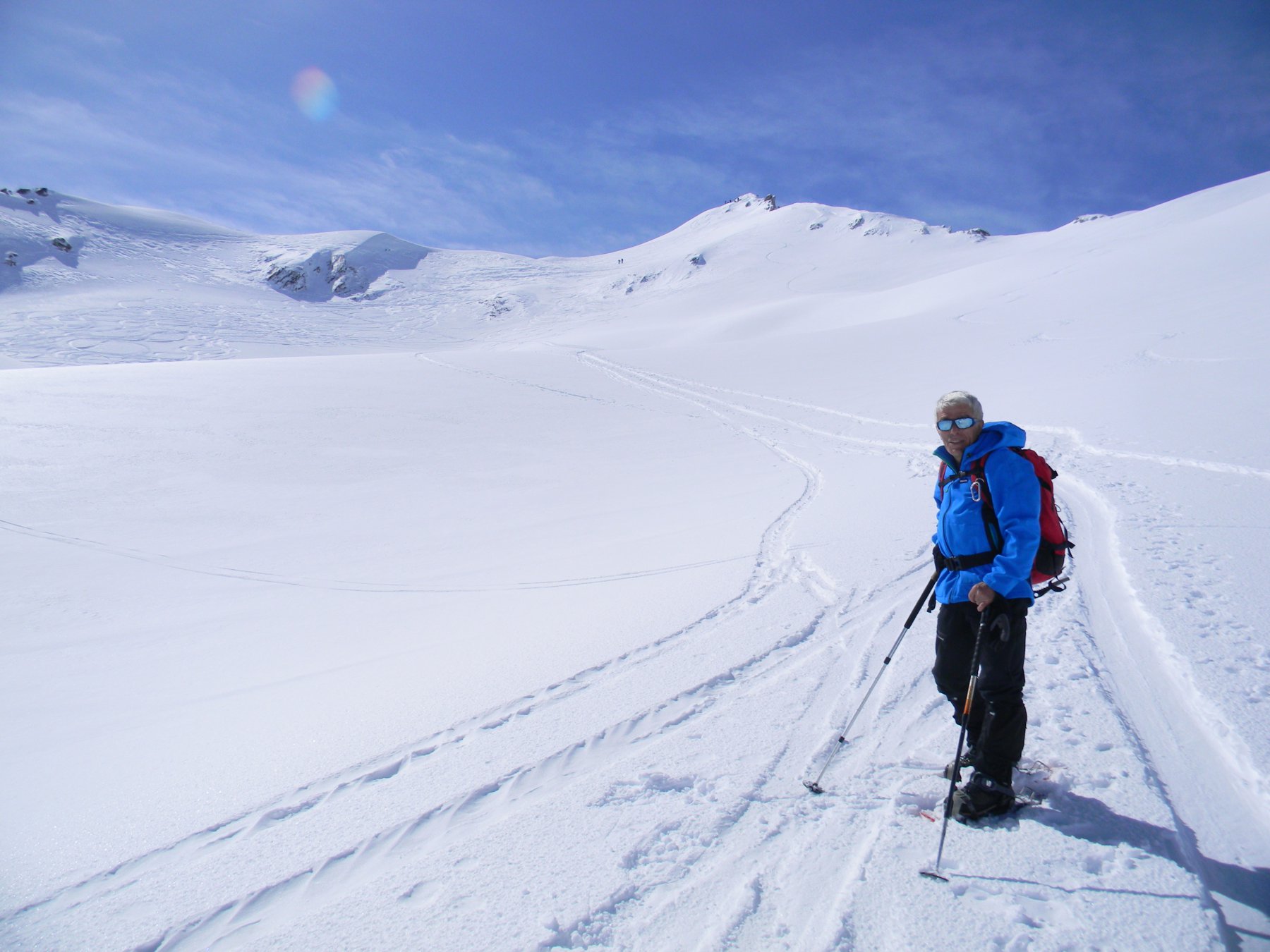 oggi in compagnia di Antonio e Giuliof in ottima forma e di Claudio, tutti e tre con racchette, personalmente con gli sci la discesa non è stata appagante inquanto tardiva, la rifaccio di sicuro, comunque le attuali condizioni sono eccellenti…chissà per quanto però, clima estivo haimè.
