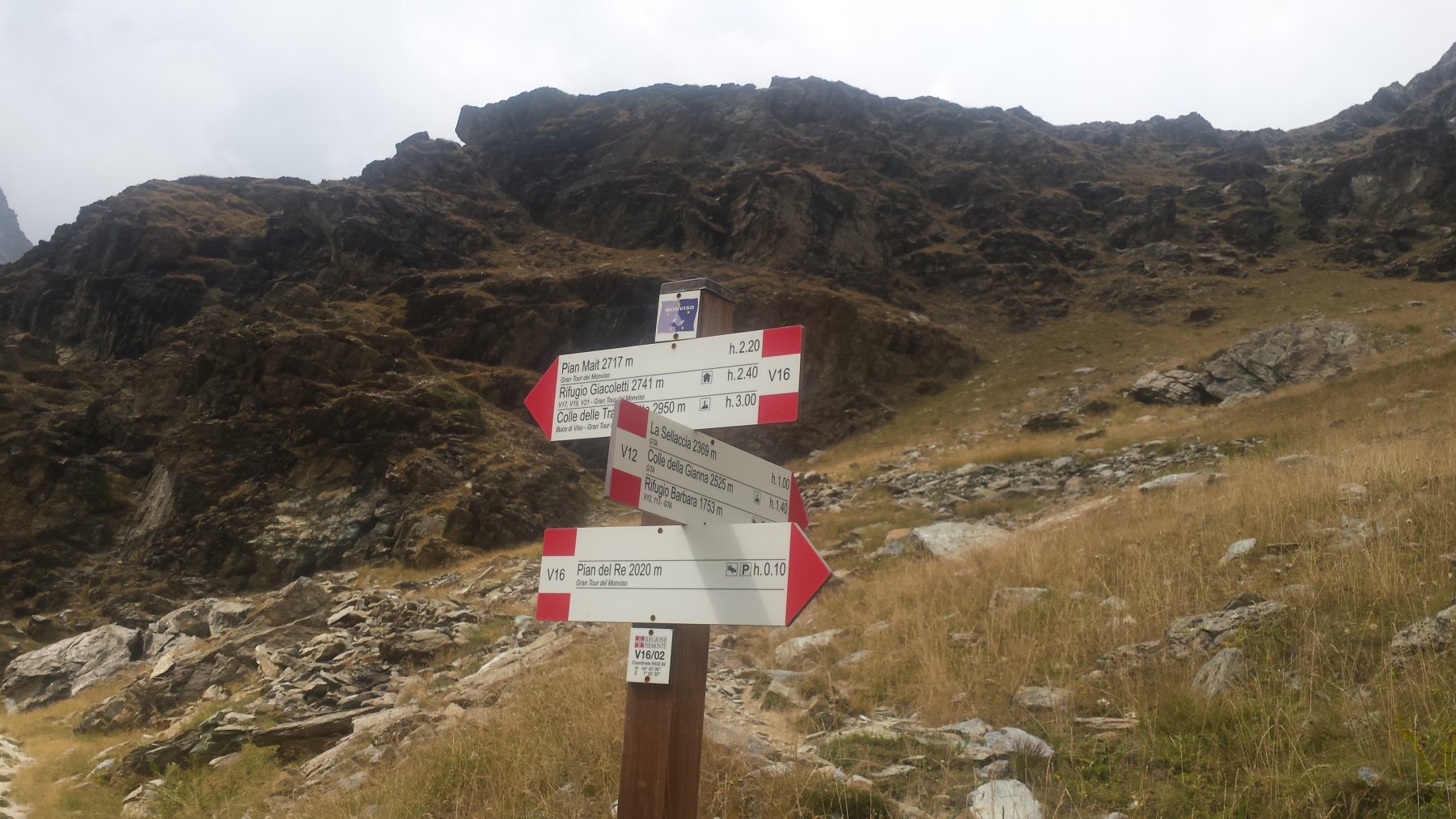 Seguito il sentiero V12 che 200 m. dopo Pian del Re si stacca sulla dx (indicazioni Colle della Gianna) e che dopo 100 m dsl devia decisamente a sx (tacche rosso/bianche) e prosegue a mezza costa sopra la stradina ghiaiosa del V16. Ci si ricongiunge alla stessa a quota 2400.