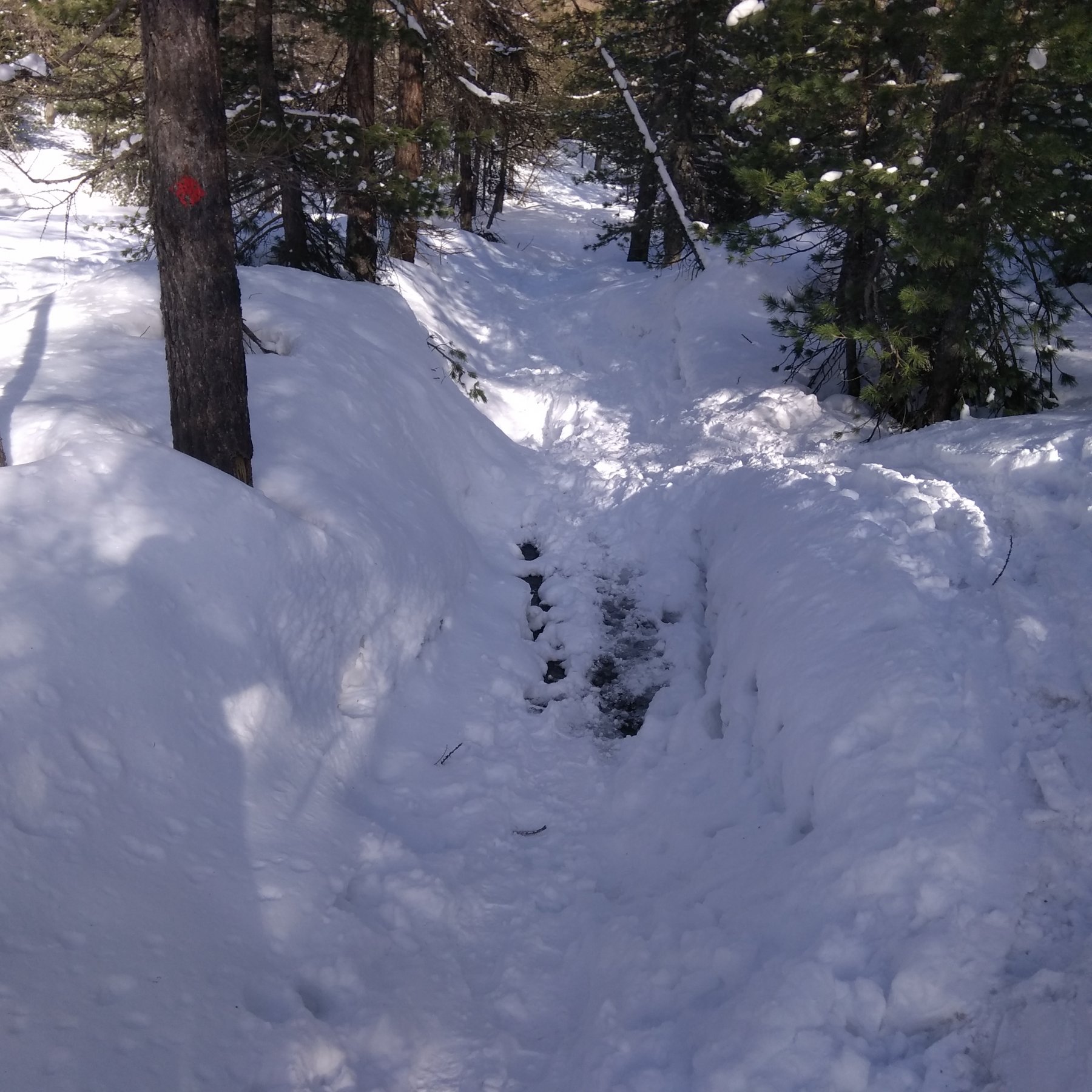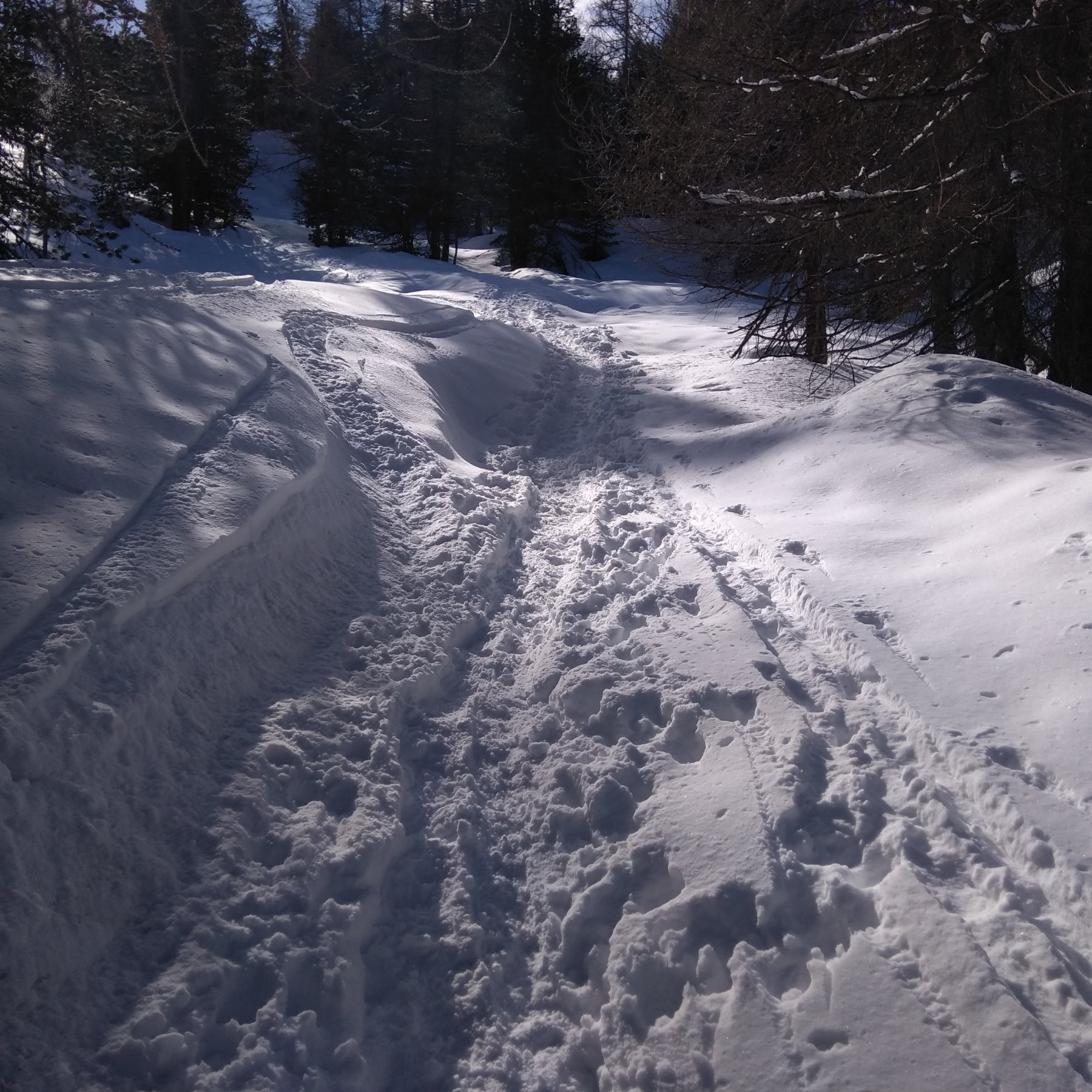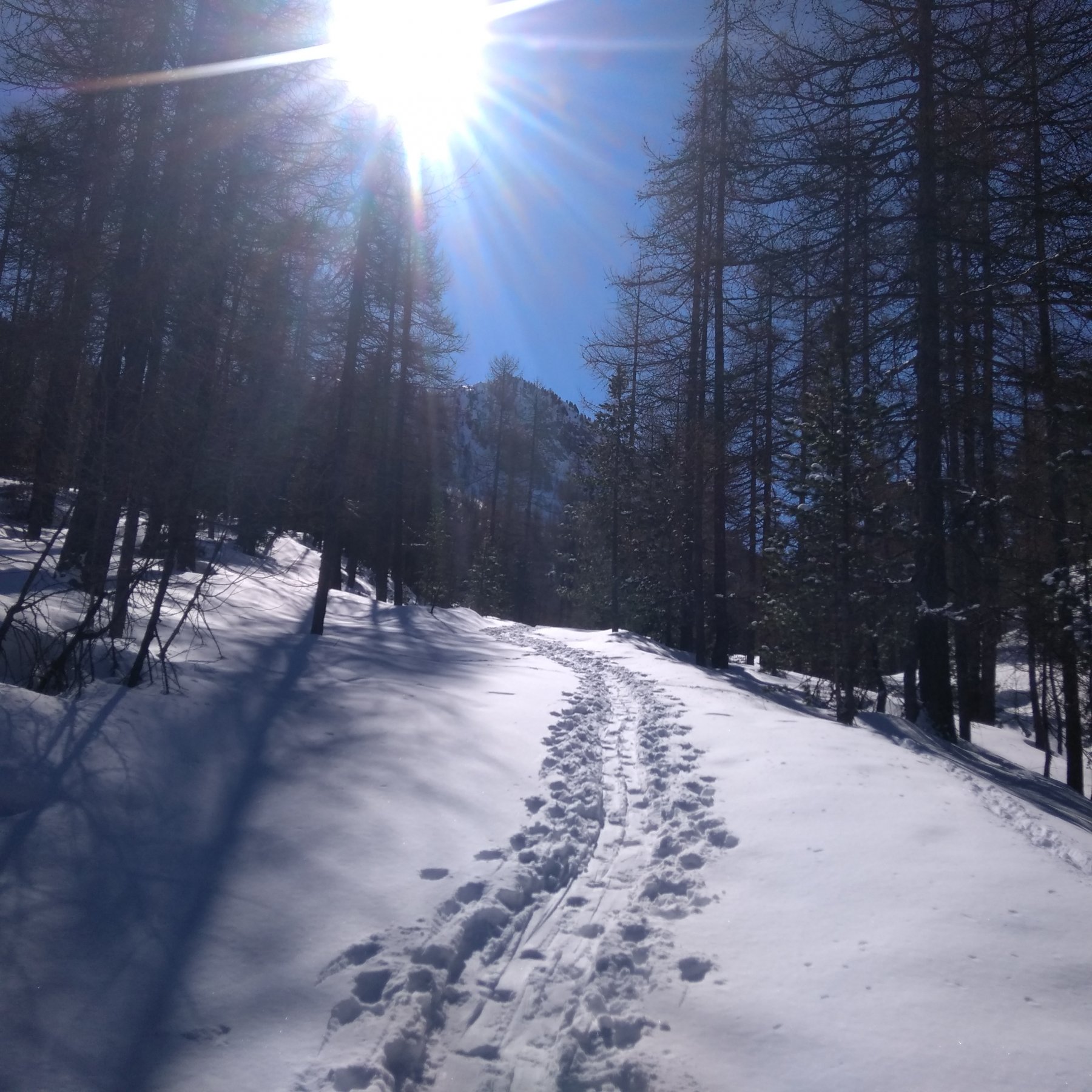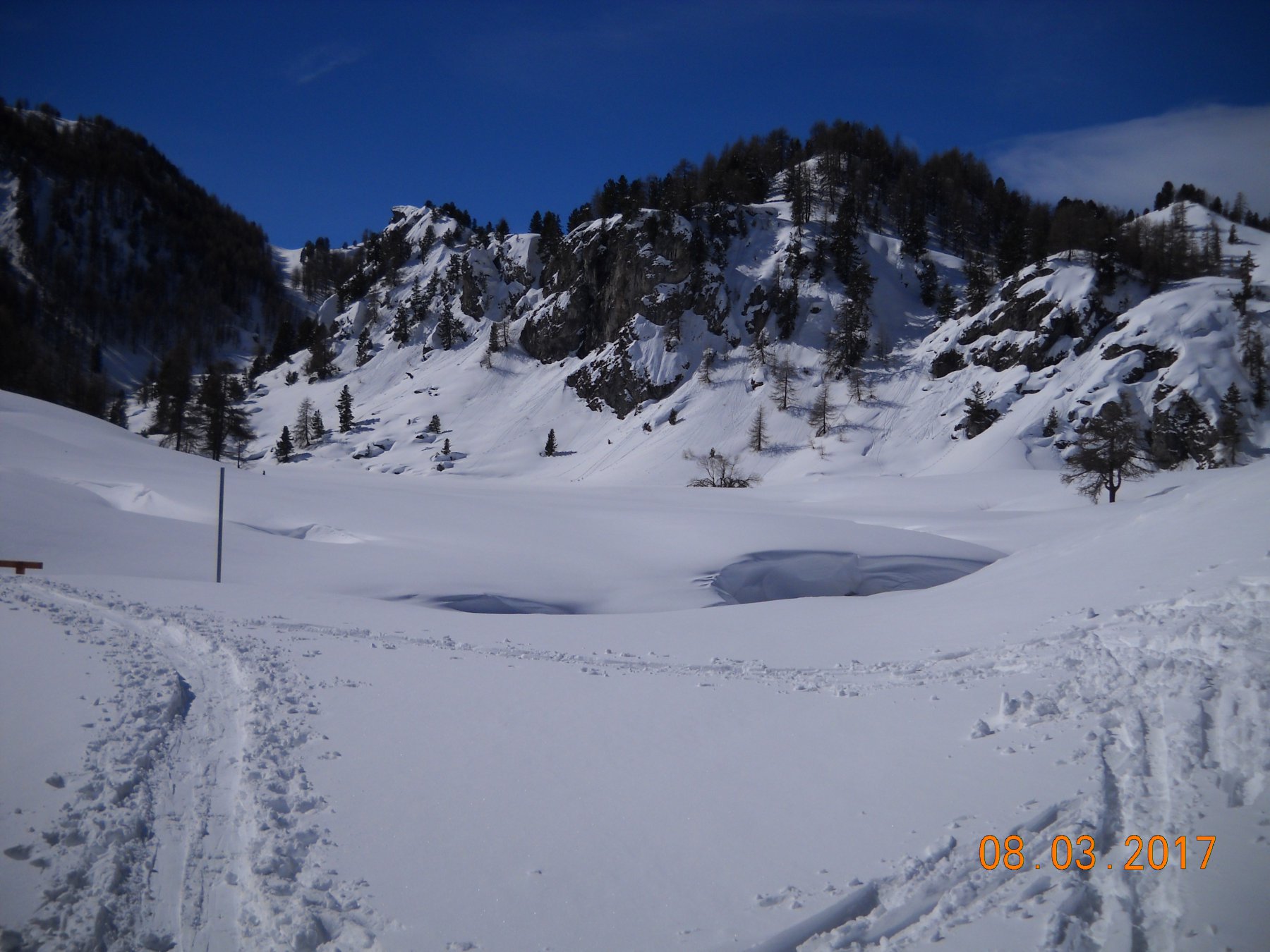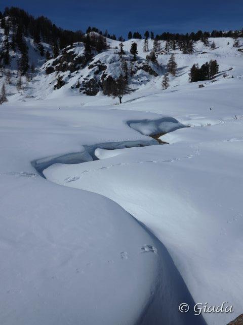 Si tralasciano alcuni bivi, uno per Ruilles l’altro per Chabaud per proseguire nel fondo del valloncello, fino a ritornare sulla strada carrozzabile poche centinaia di metri prima della conca del Lago Nero.