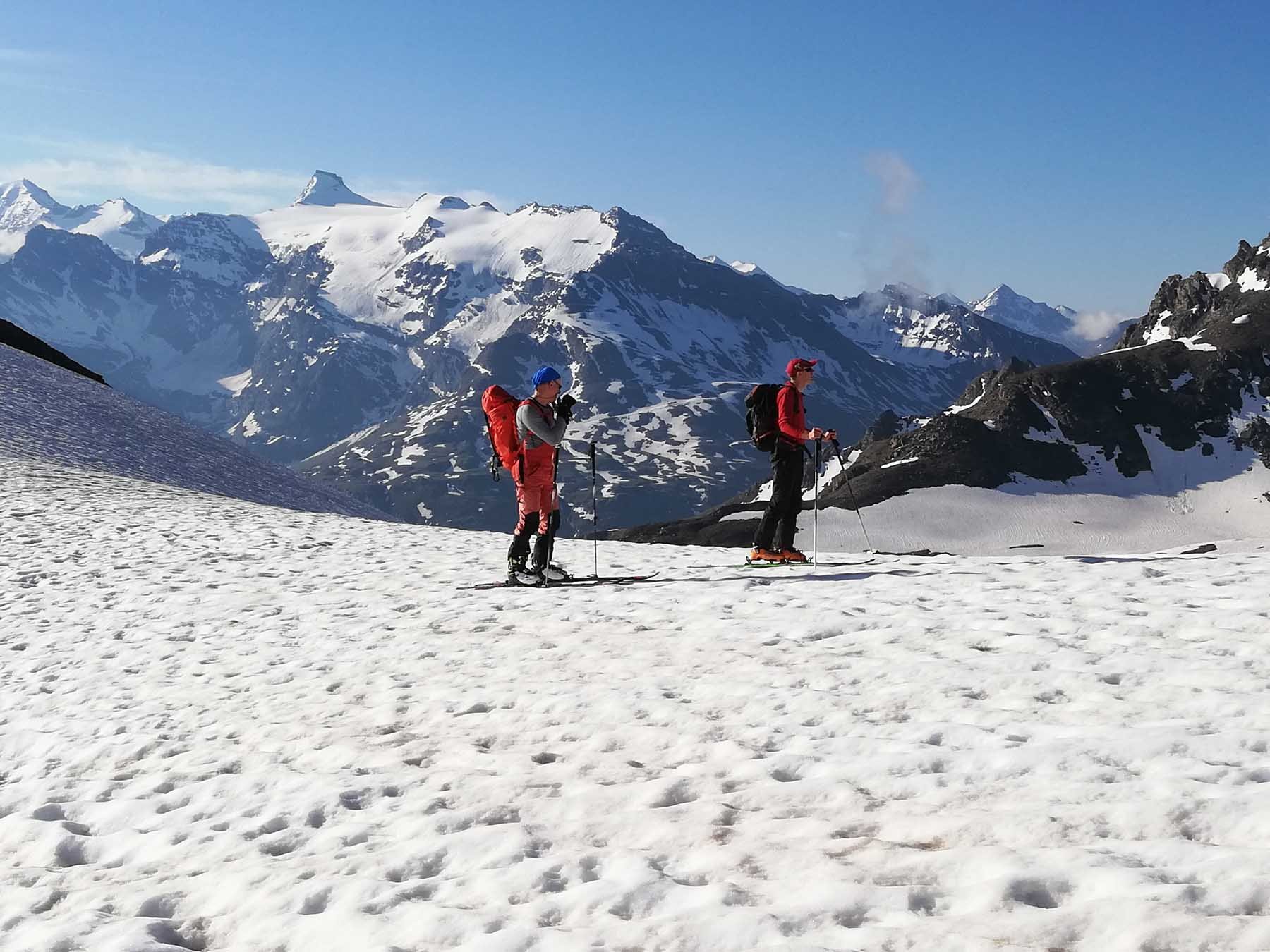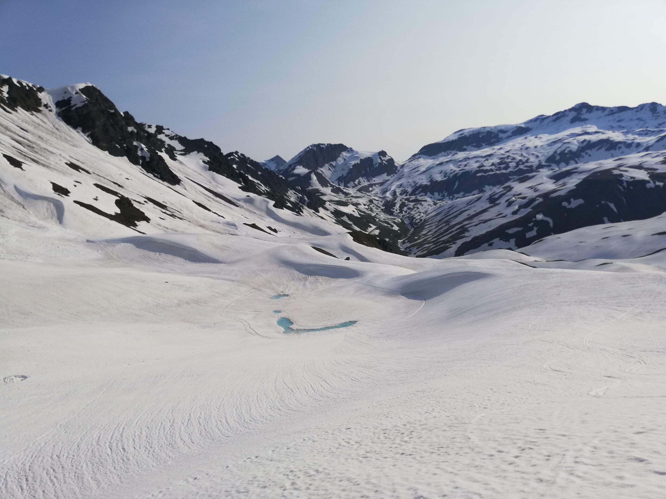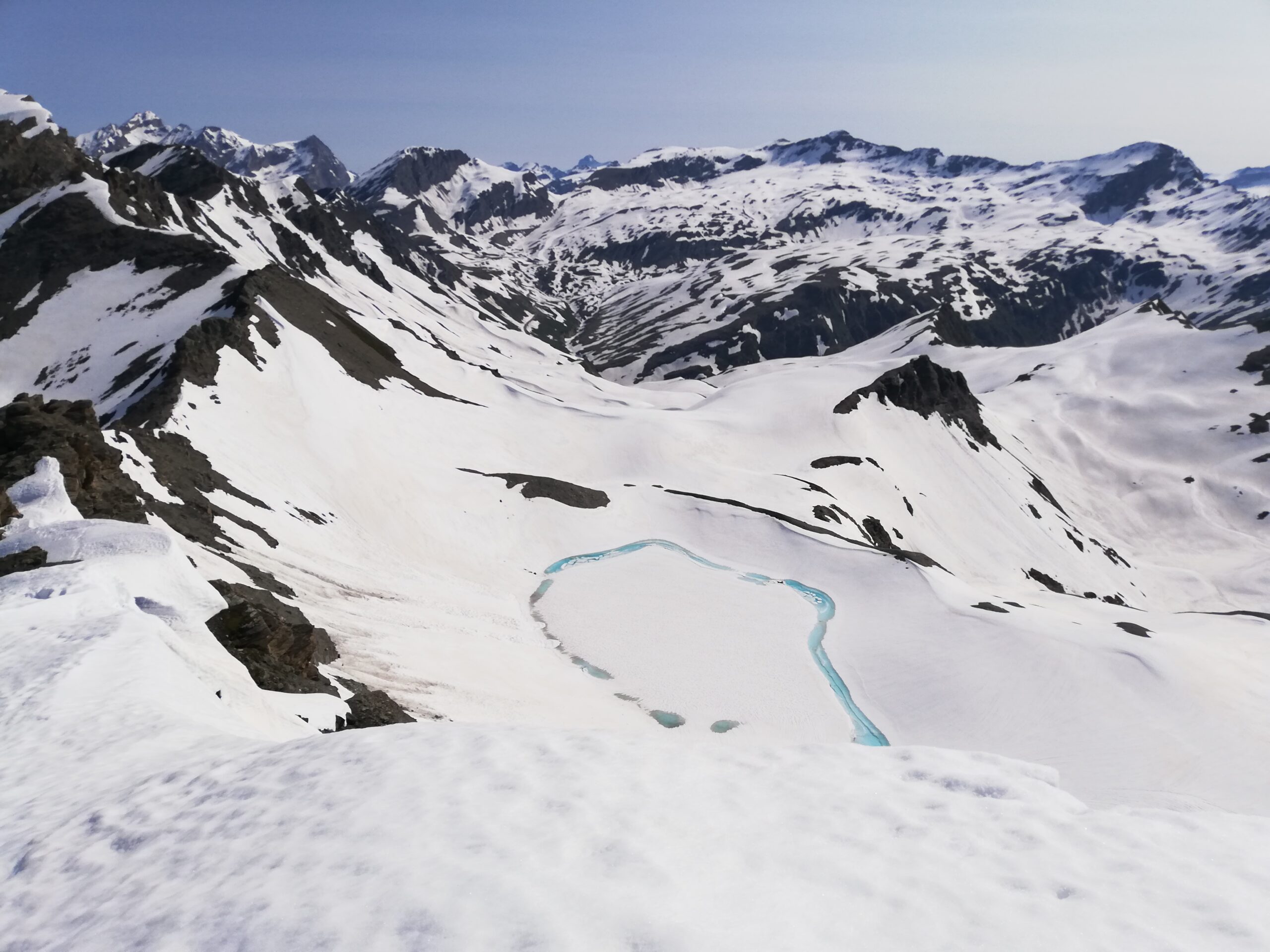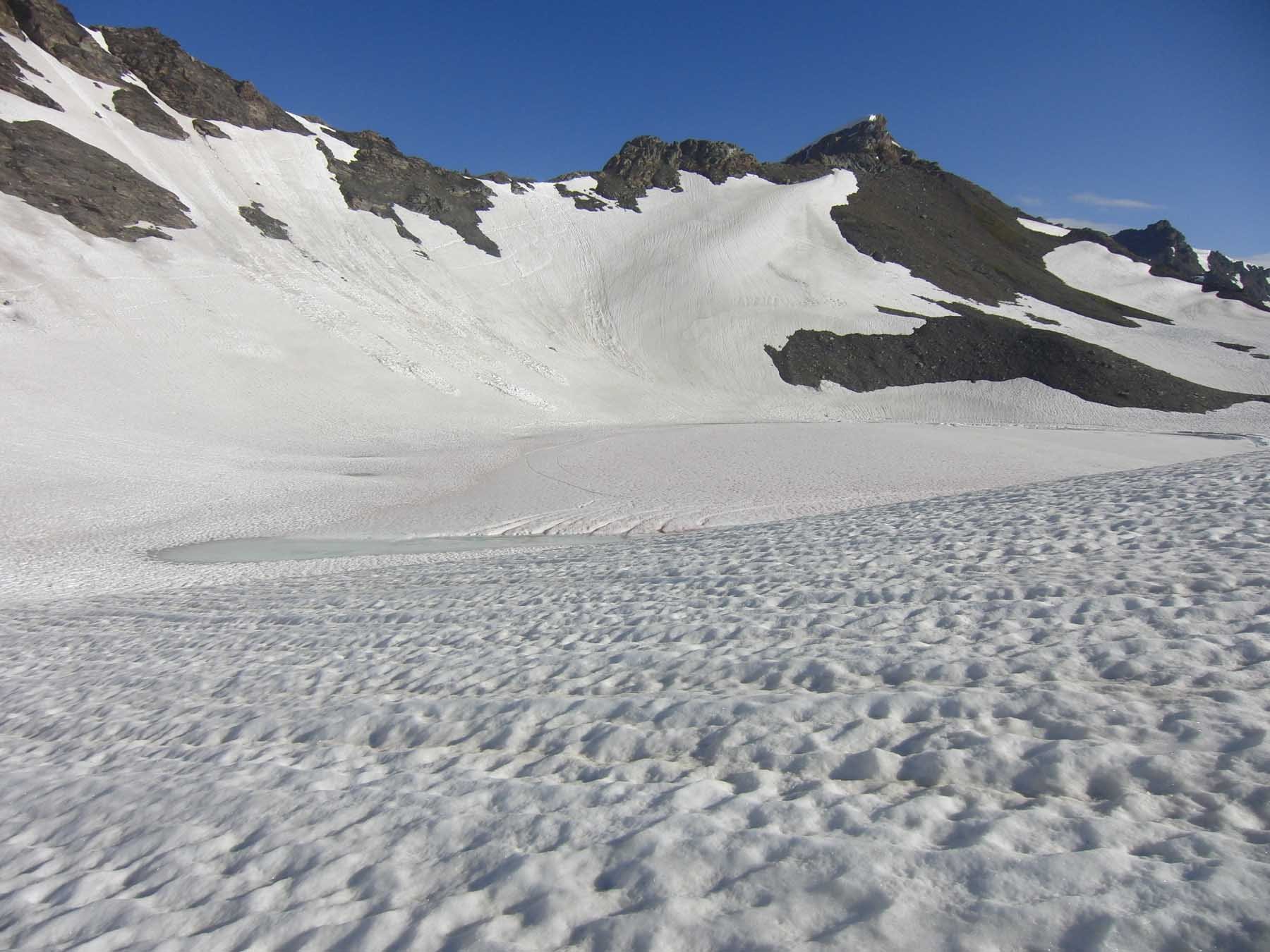 Traversata. Dal colletto dopo la Combe de la Jave non salire al Col des Fours ma proseguire con direzione Sud passando sulla sponda di valle del Lac du Fond e salire alla sella tra la Pointe des Fours e la Pointe Nord de Bezin. Salire a piedi la crestina SE della Pointe des Fours che nella parte superiore ha alcuni passaggi assai esposti (consigliabile una corda); se ritenuta troppo impegnativa la cresta, dalla sella attraversare in aggiramento orizzontale i pendii SW (in sci consigliabili i coltelli) fino a giungere sulla cresta NW e lungo questa si sale facilmente all’ometto di vetta. Scendere i bellissimi pendii nel Vallon des Fours fino al ripiano (m. 2.470) al di sotto del Refuge du Fond des Fours . Risalire al Col des Fours o alla selletta più alta verso il Pelaou Blanc per poi scendere al Pont de la Neige.