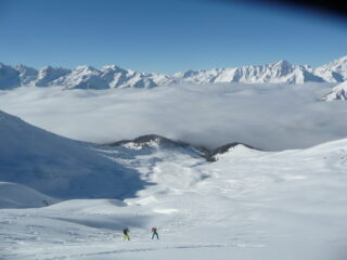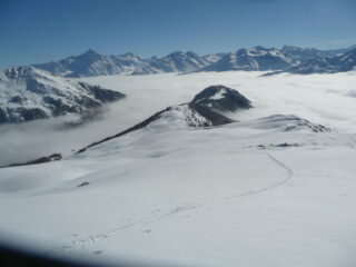 Oggi a casa nebbia ma le previsioni ci fanno sperare.. Partiti da Morge saliti come da itinerario descritto su buona traccia e diversi ski alp sul percorso. Arrivati in vetta ci concediamo una prima discesa verso il vallone di Vertosan intonso. Ripellino per tornare sulla costa e discesa per l’itinerario normale. Dalla piana sotto il colle la Vale rientra mentre io risalgo in vetta per un secondo giro. Dalla vetta sceso nel vallone di Vertosan fin sotto la p.ta Fetita. Ripello per la seconda vetta di giornata e da li sceso per la dorsale fino al col de Bard per il rientro diretto a Cerellaz da Vedun. Discese nel complesso discrete tratti molto belli con neve polverosa e fondo portante ma anche un pò di croste cedevoli.