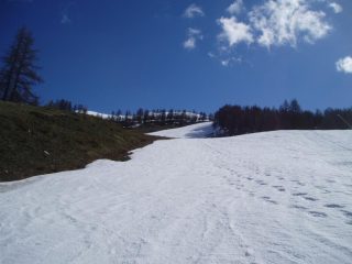 Dato che giovedi’ ero impegnato ed i miei amici sono andati per approffittare della finestra di bel tempo a me non è rimasto che andare da solo, sperando che il bel tempo tenesse ancora un pò. E’ andata bene cosi’. Neve stupenda, giornata bella, solo qualche nuvoletta passeggera, temperatura ideale, pochissima gente in giro. E’ strano sciare su una limgua di neve mentre tutto intorno, nella parte bassa, ci sono il bosco ed il terreno scuri.
