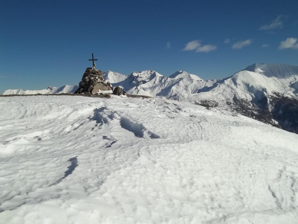 Poco sotto l’alpeggio, si abbandona la strada e ci si dirige sulla sinistra attraverso pascoli e larici radi. Arrivati nei pressi del rio si cerca un passaggio per attraversarlo e risalire i pendii sulla dx idrografica. Si prende come riferimento l’edificio di legno a sinistra del col Basset e lo si raggiunge dopo aver attraversato la strada dell’Assietta. Da qui si continua a sinistra lungo la pista di rientro e transitando sotto i paravalanghe, si raggiunge il pendio finale (delimitato da staccionate di legno) percorrendolo fino alla cima (stazione meteo della Regione Piemonte).
