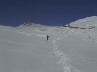 salendo ci siamo subito resi conto che la discesa sarebbe stata complicata visto che i 10-15 cm di neve poggiavano sul terreno senza un minimo di fondo!tuttavia sci vecchi e una voglia matta di ricominciare non ci hanno fatto desistere!Buon allenamento comunque.Era indubbiamente meglio il Banchetta dove c’era diversa gente.Con Carlo.